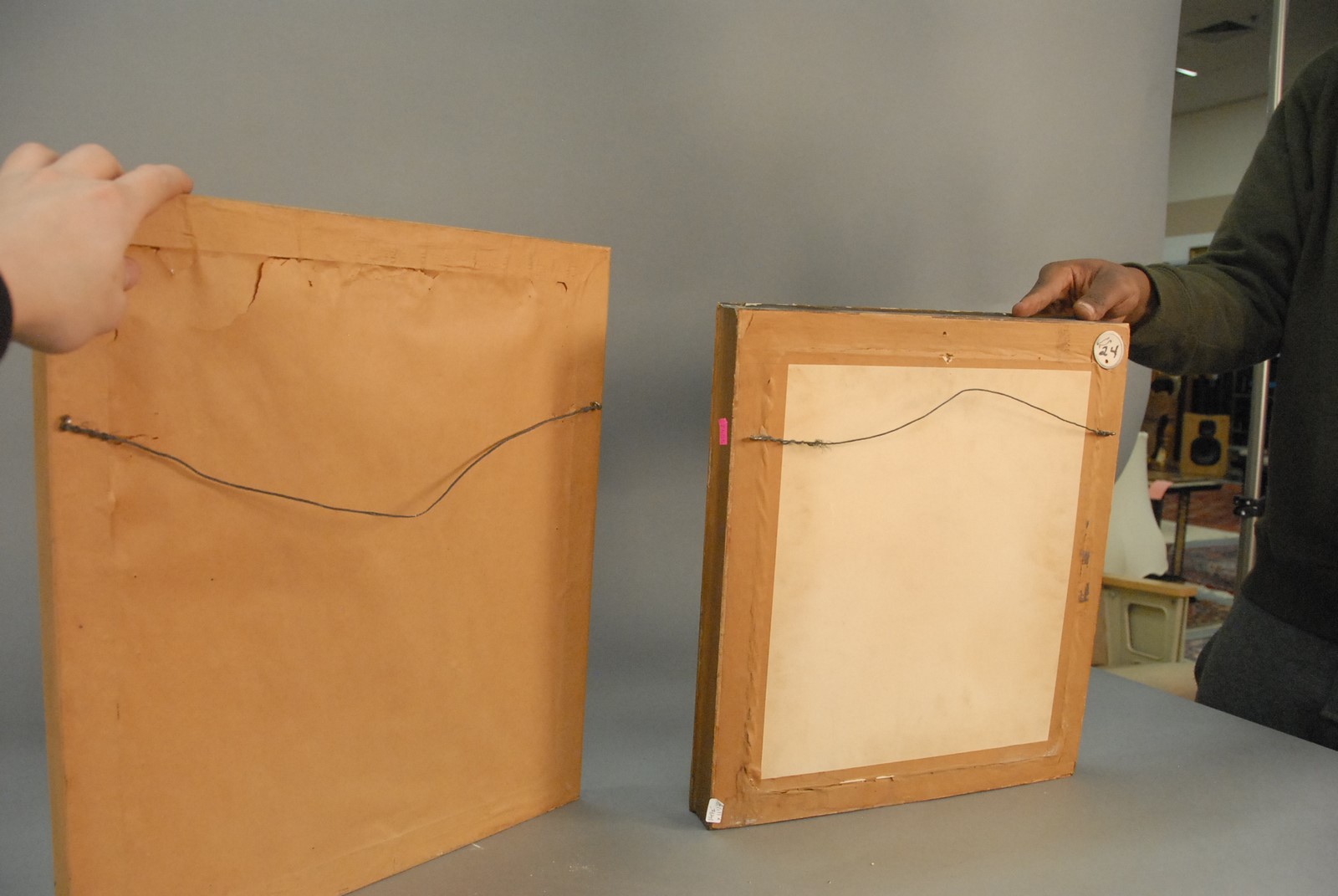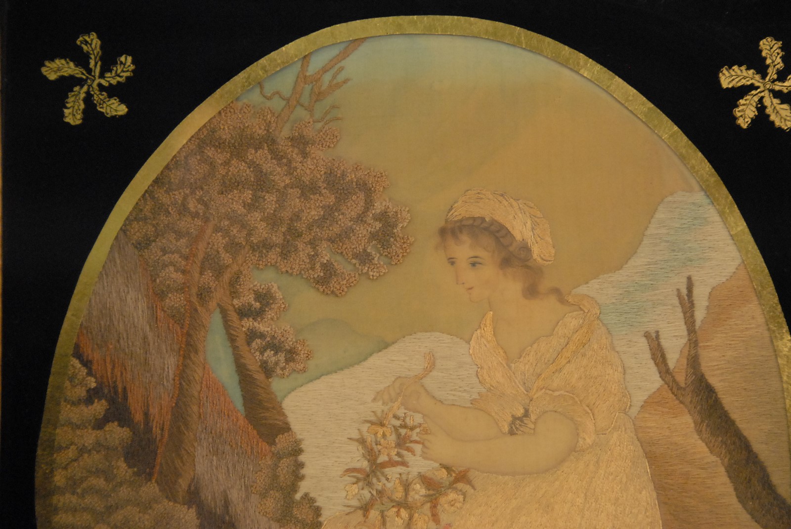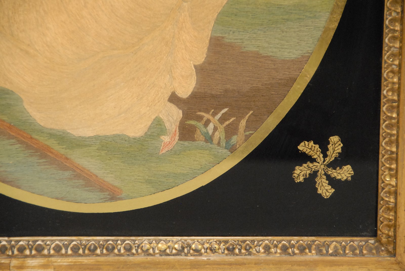 Lot 608: Two oil on silk embroideries one depicting Little Bo Peep sitting down and the other of urn with flowers. 14 x 11 1/2 and 15 1/2 x 13 1/2