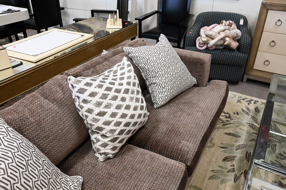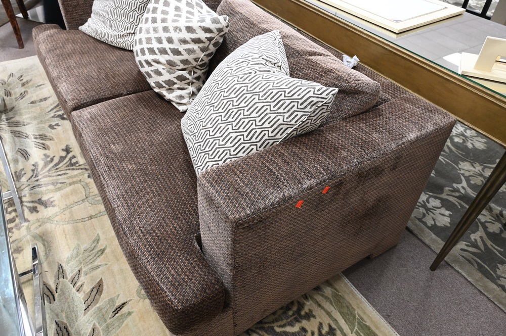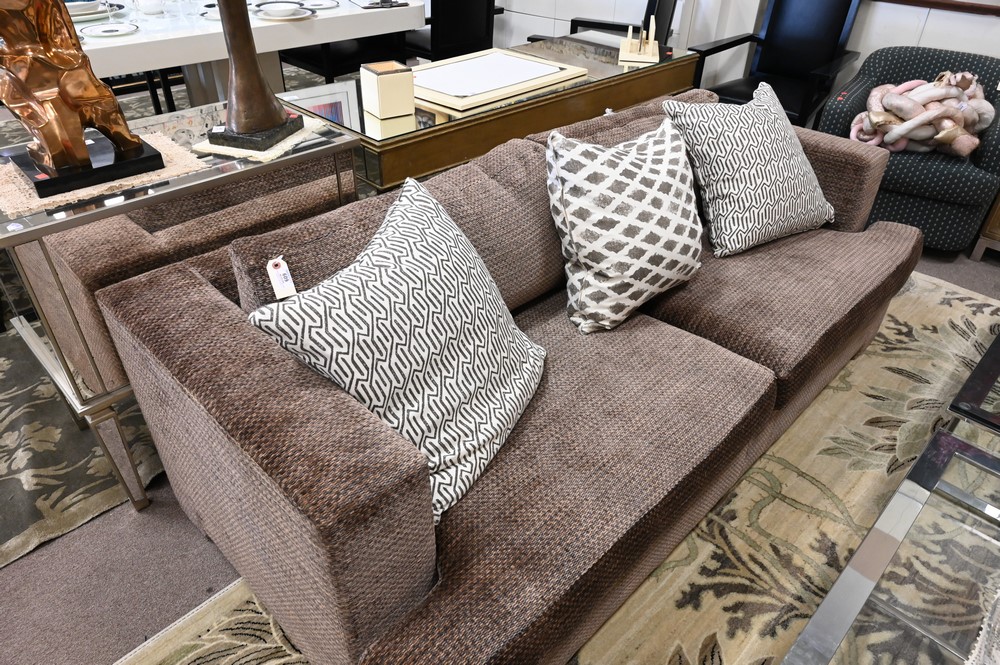 Lot 609: Custom Upholstered Two Cushion Sofa, in tan tuxedo style with down filled cushions, like new condition, height 25 inches, length 79 inches