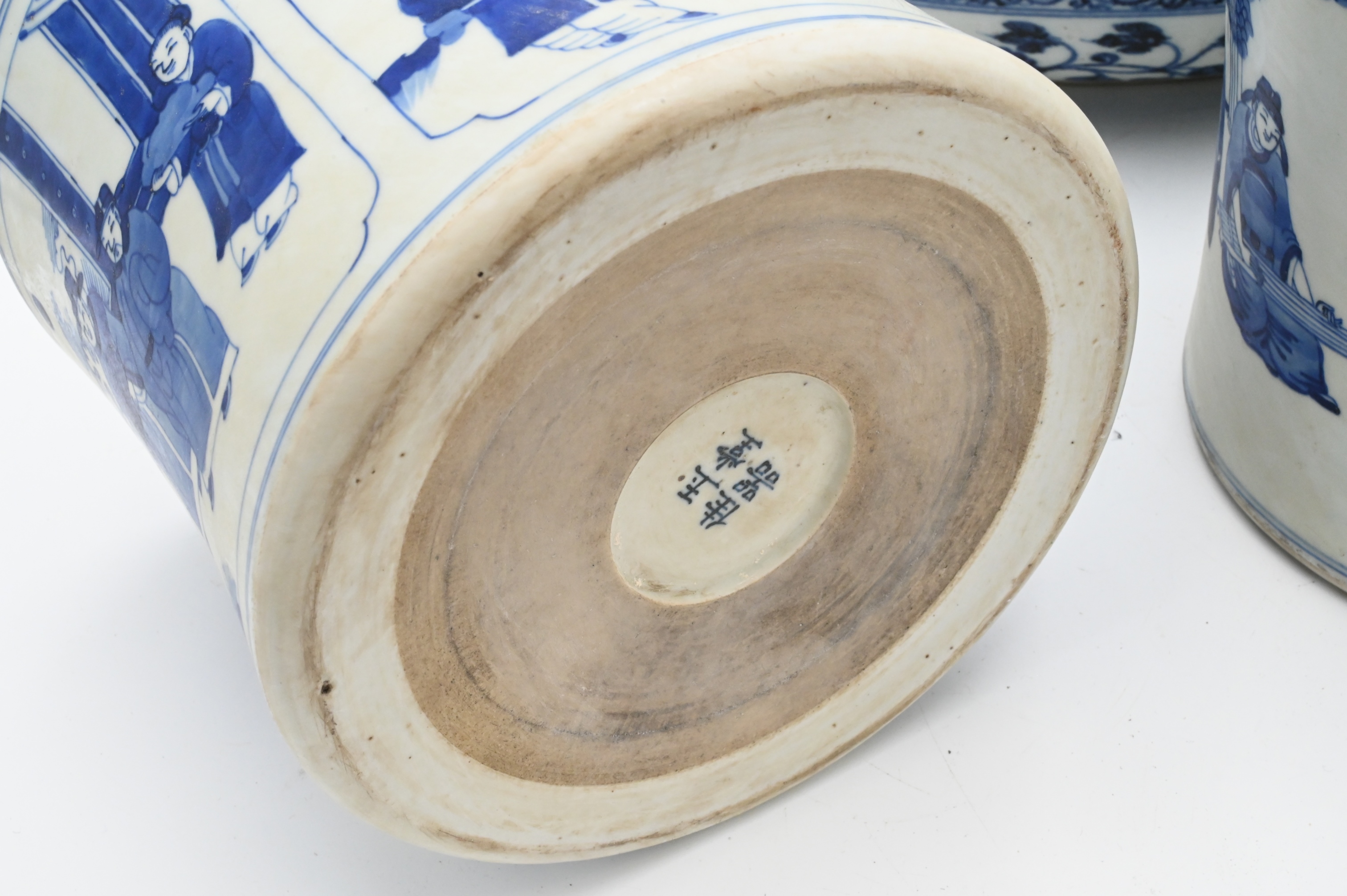 Four Blue and White Chinese Porcelain Pieces, to include a large flower charger, large bowl, along with two brush pots having painted figures. Tallest Height 6 1/2 inches, Diameter of charger 17 1/2 inches.