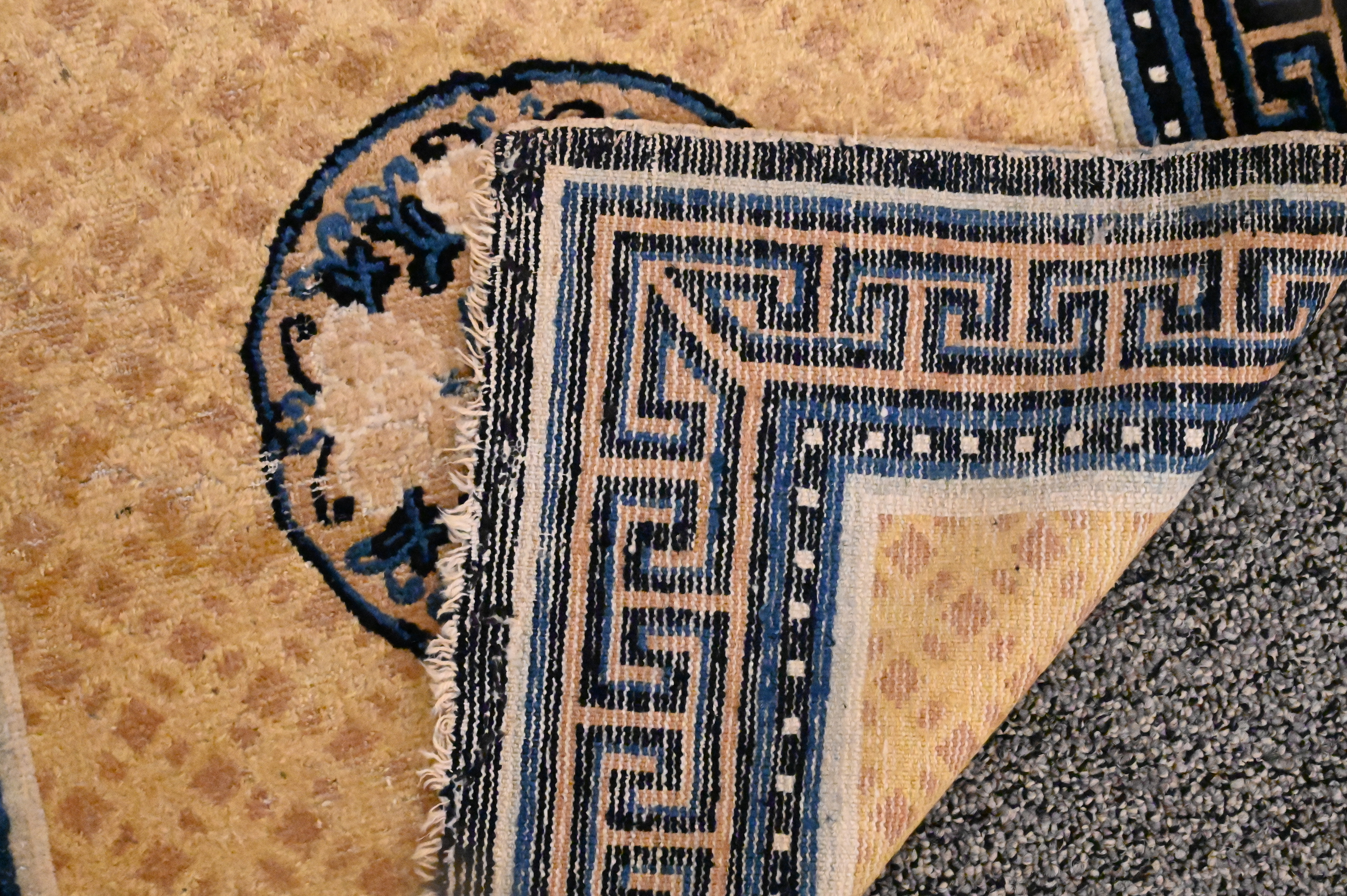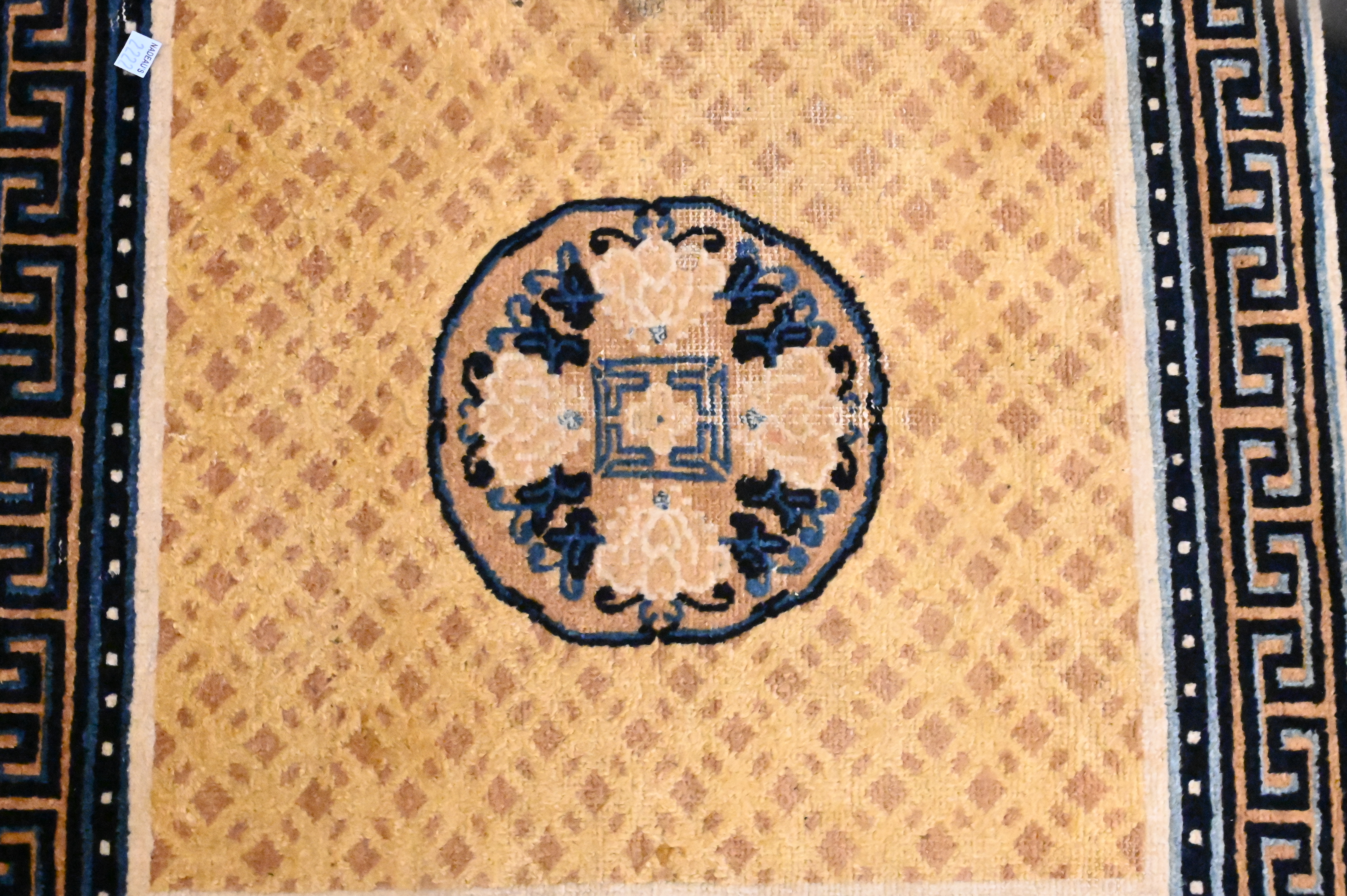 meditation mat having blue Greek key design border