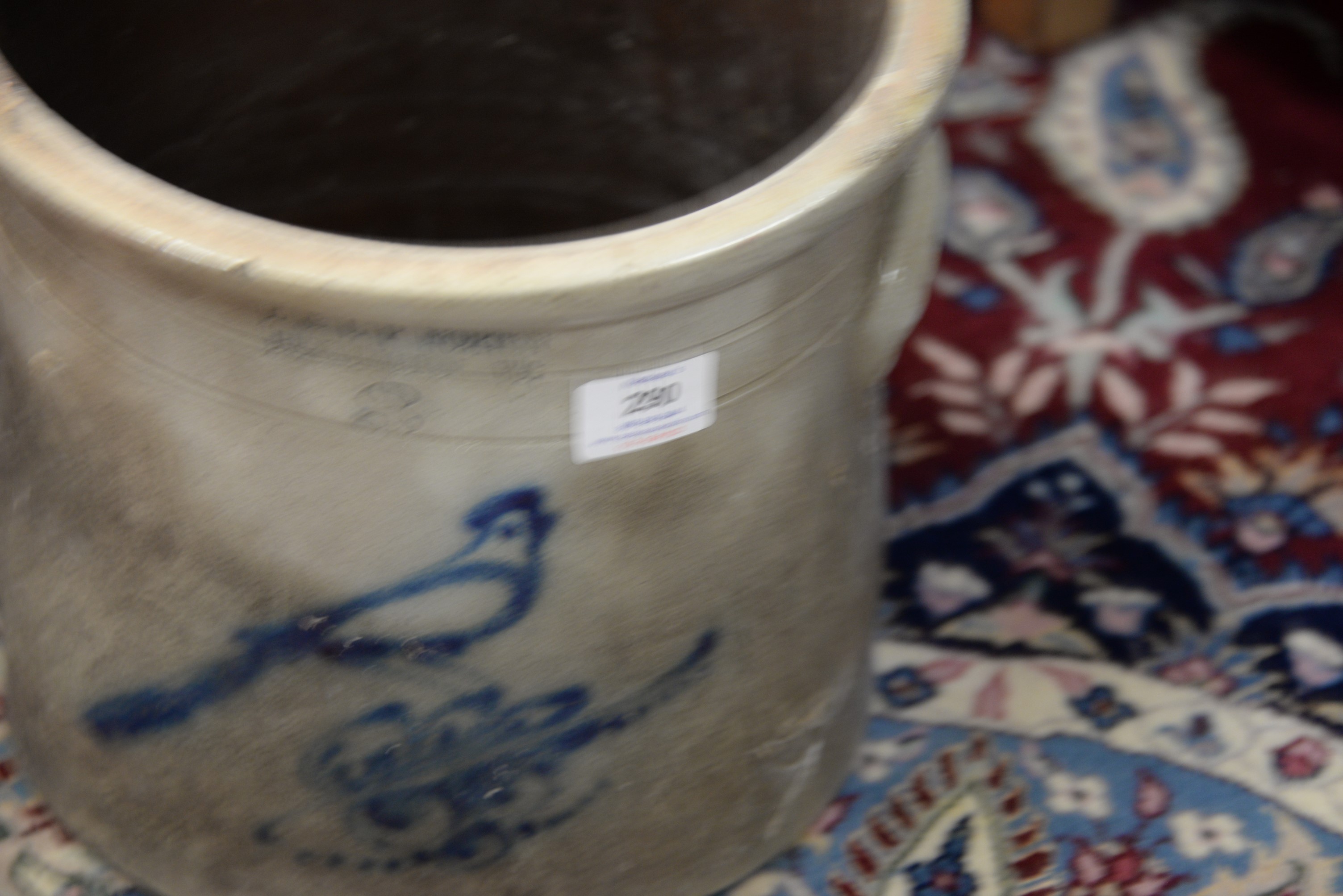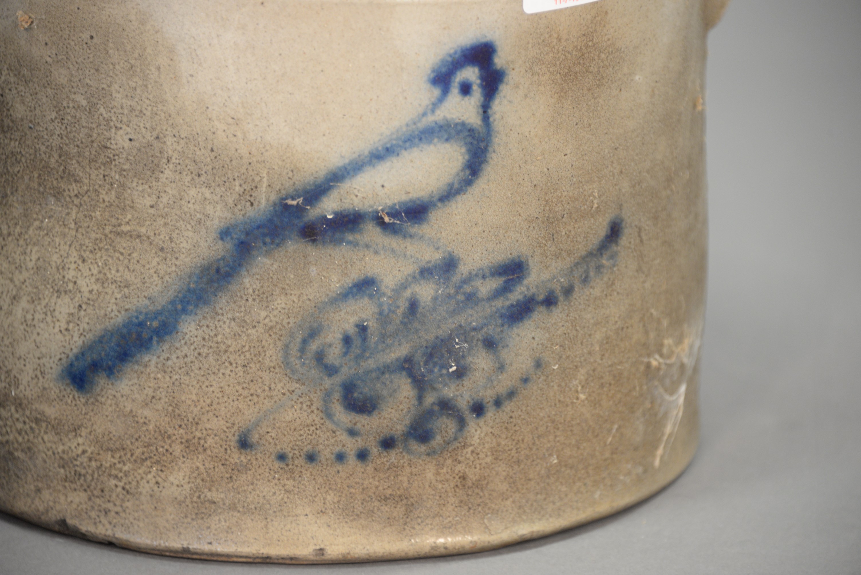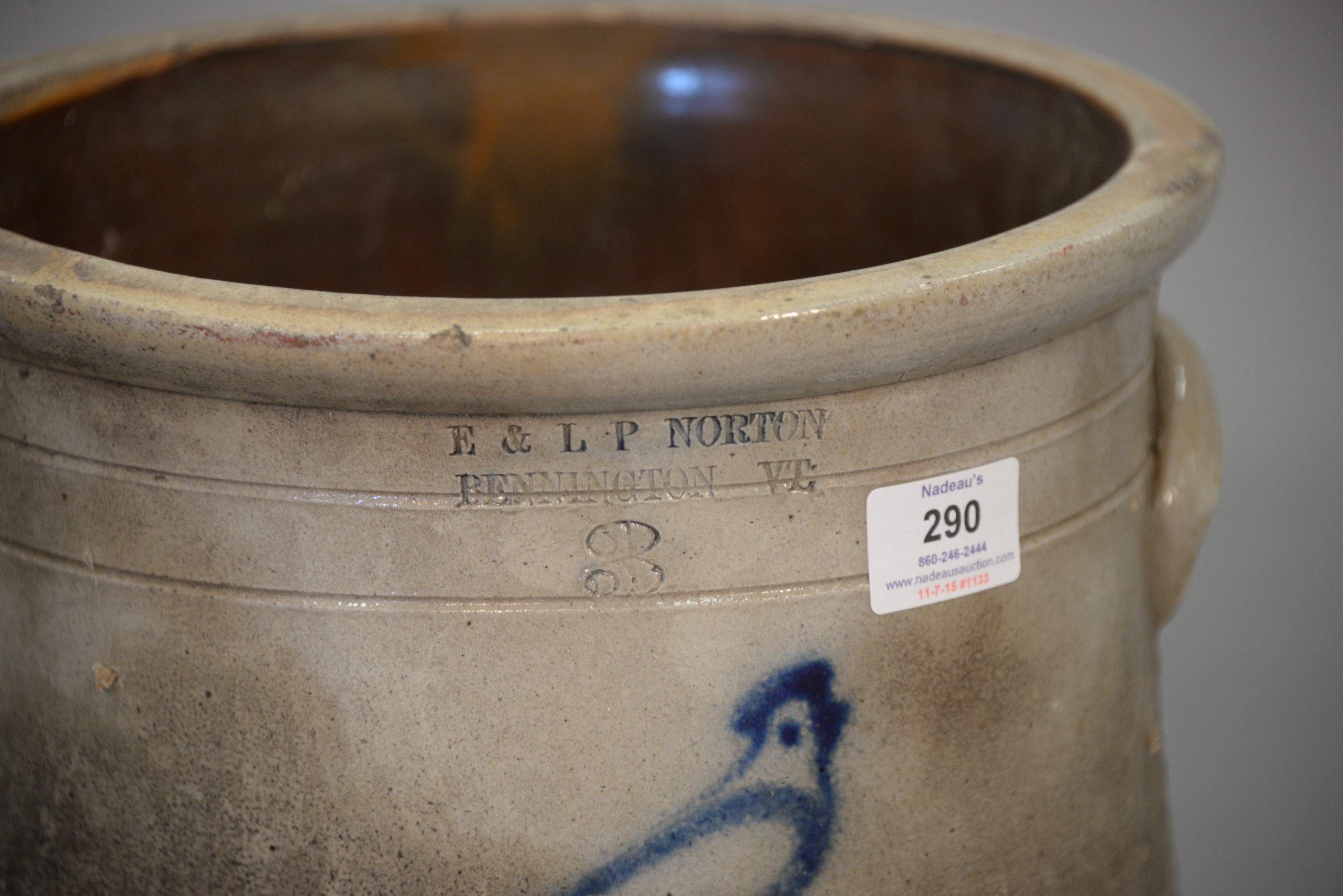 E & LP Norton three gallon crock with cobalt bluebird on front. ht. 10 in. dia. 11 in.