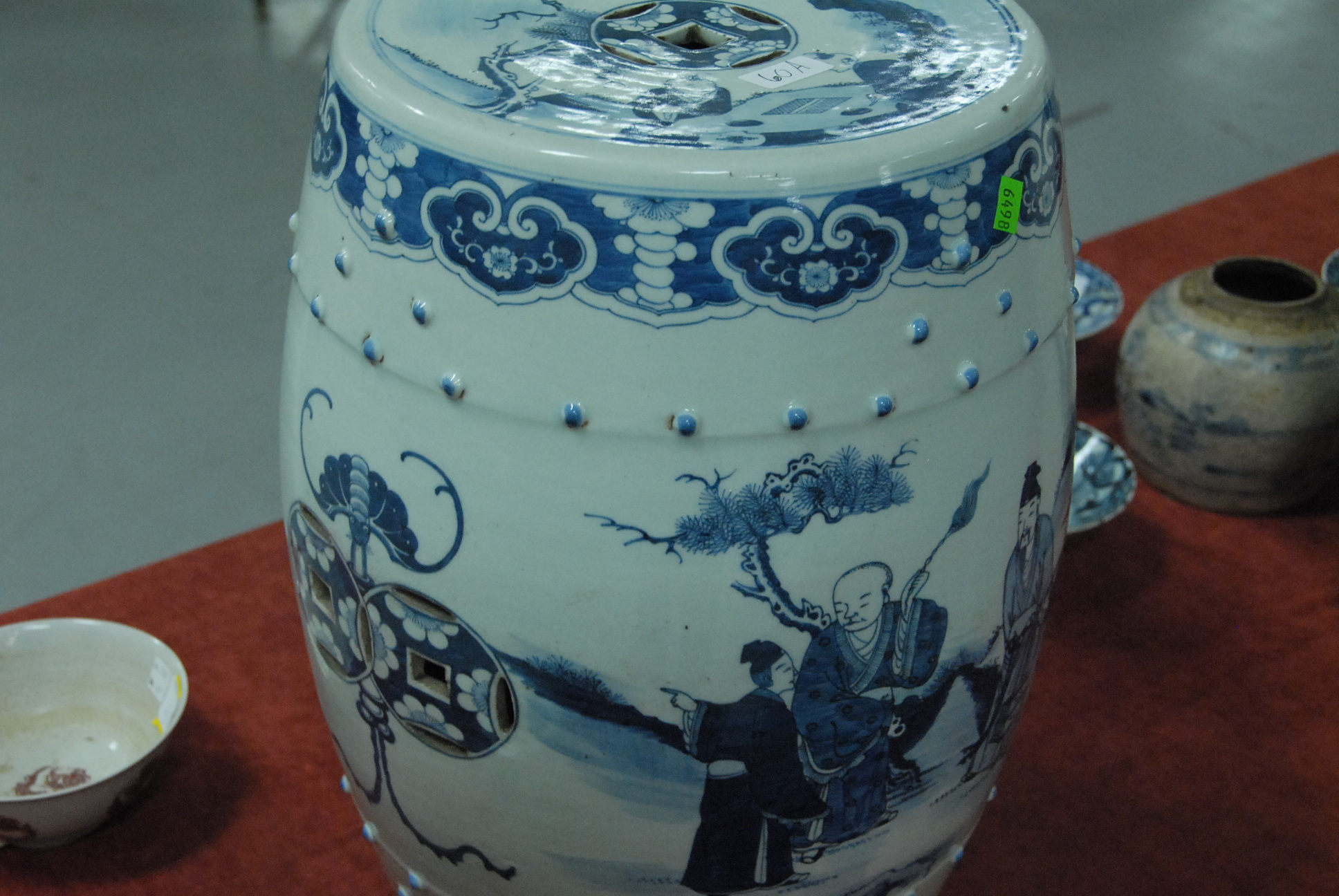 Lot 60A: Large blue and white porcelain garden seat with figures in landscape, ht. 18in. dia. of top 11 1/2in.