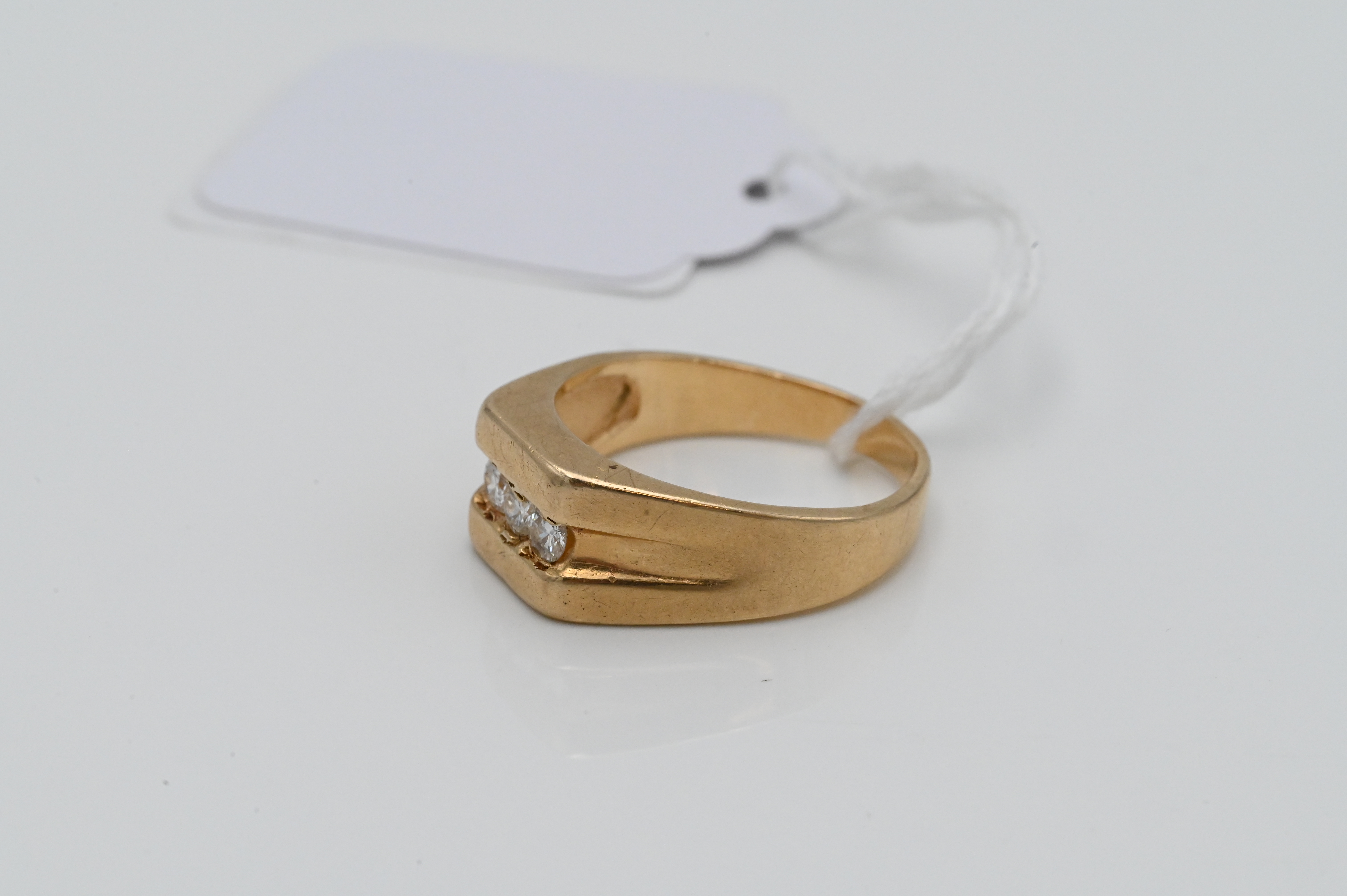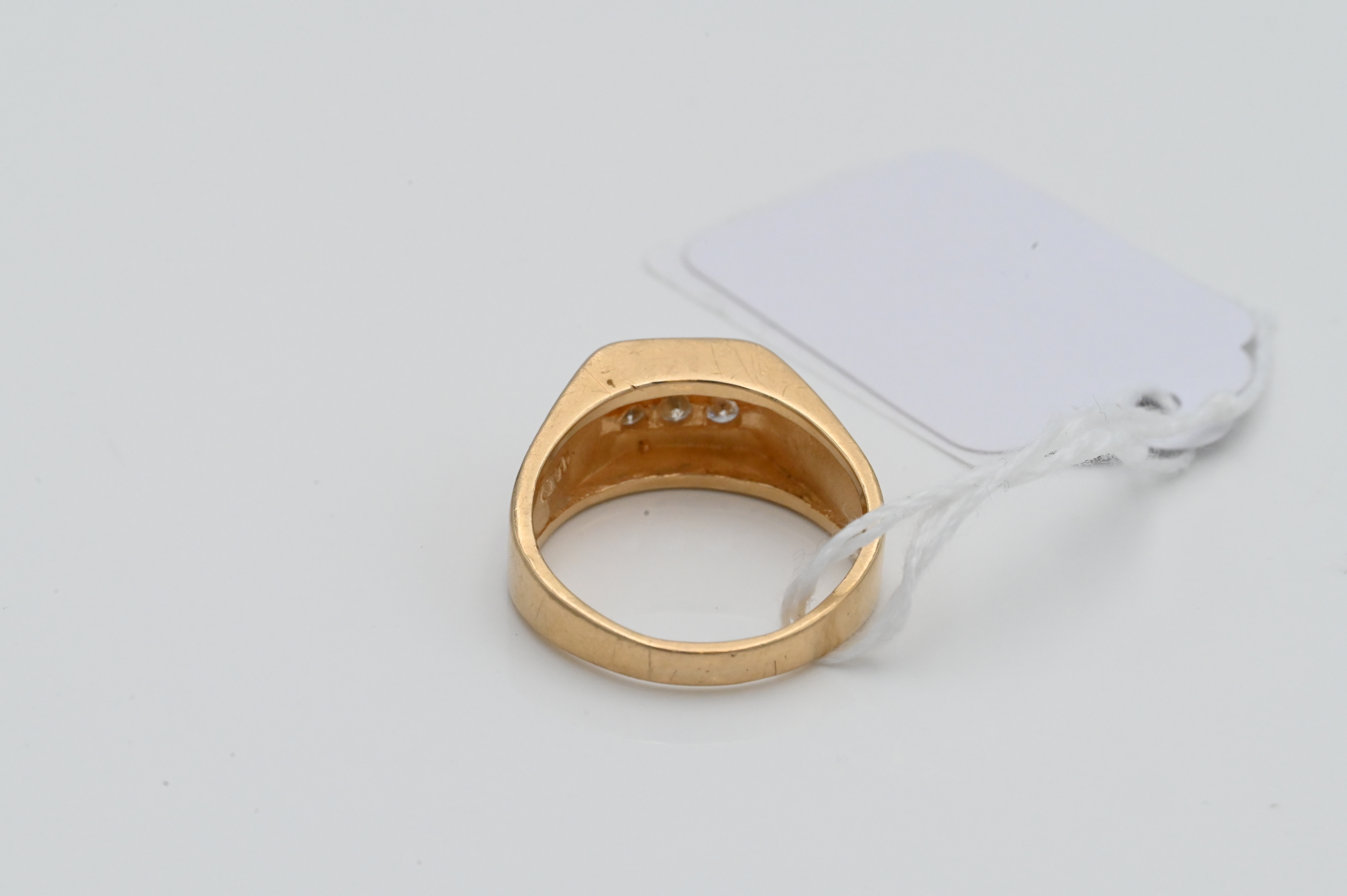 14 Karat Yellow Gold Mens Ring, set with three diamonds, size 12 1/4 inches, 11.3 grams.