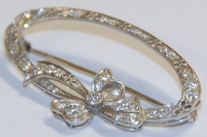 18kt white gold oval pin with bow top, set with diamonds. 6.1 grams.
