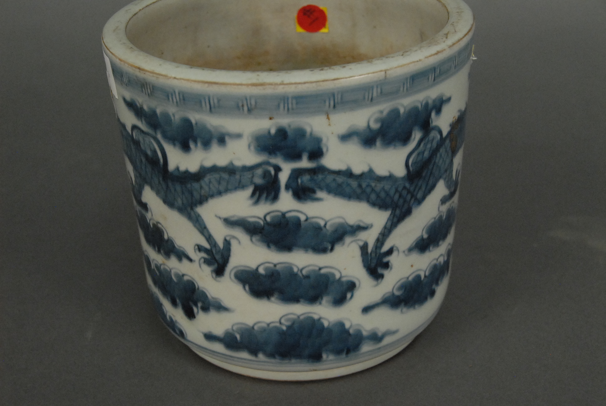 Blue and white dragon brush pot having two four claw dragon, ht. 7in. dia. 7 1/2in.