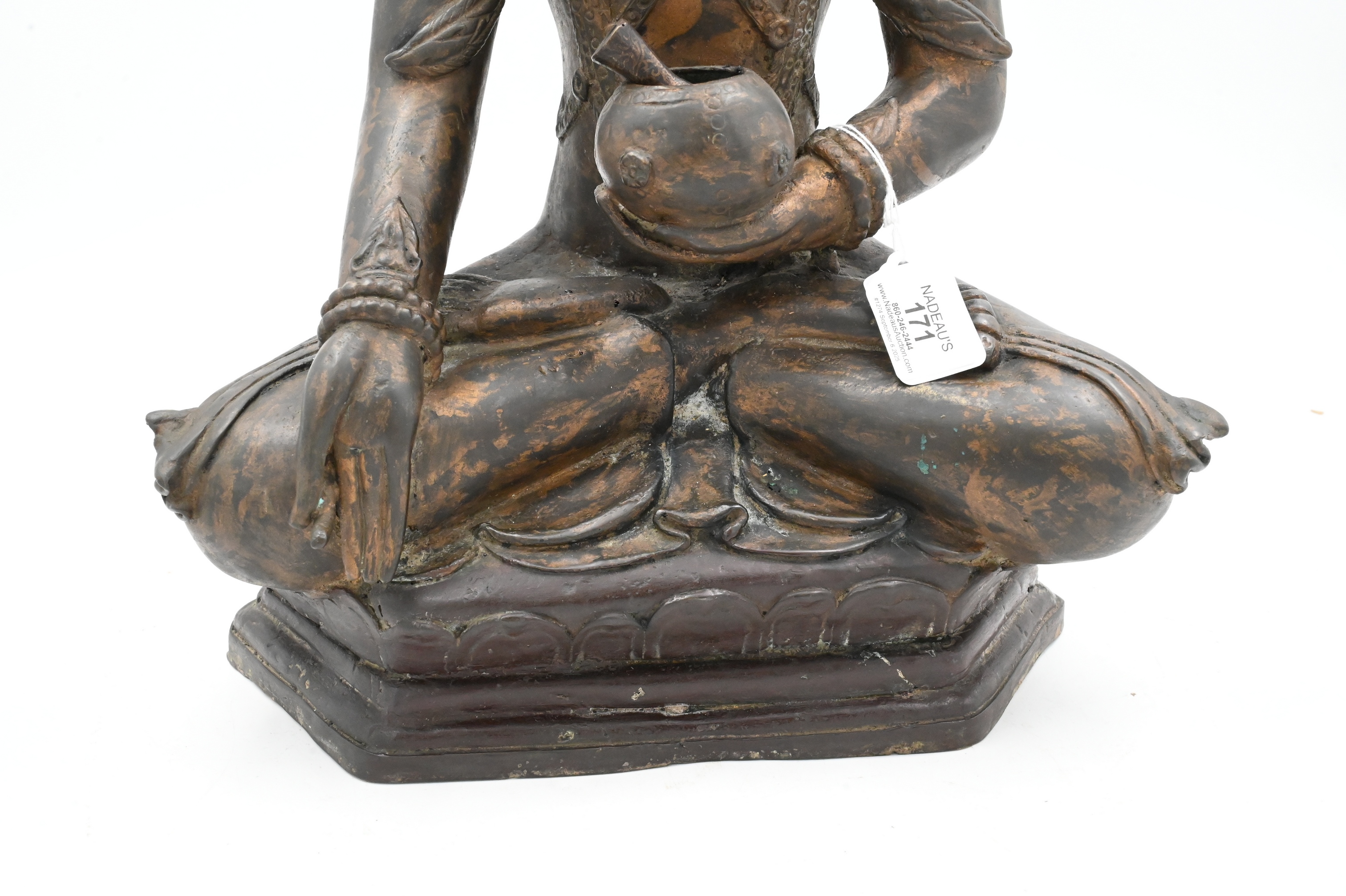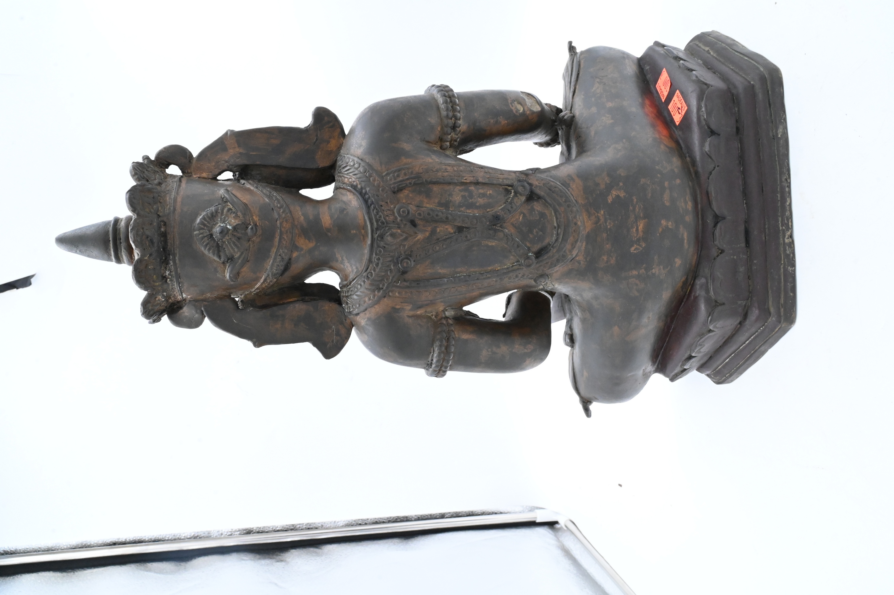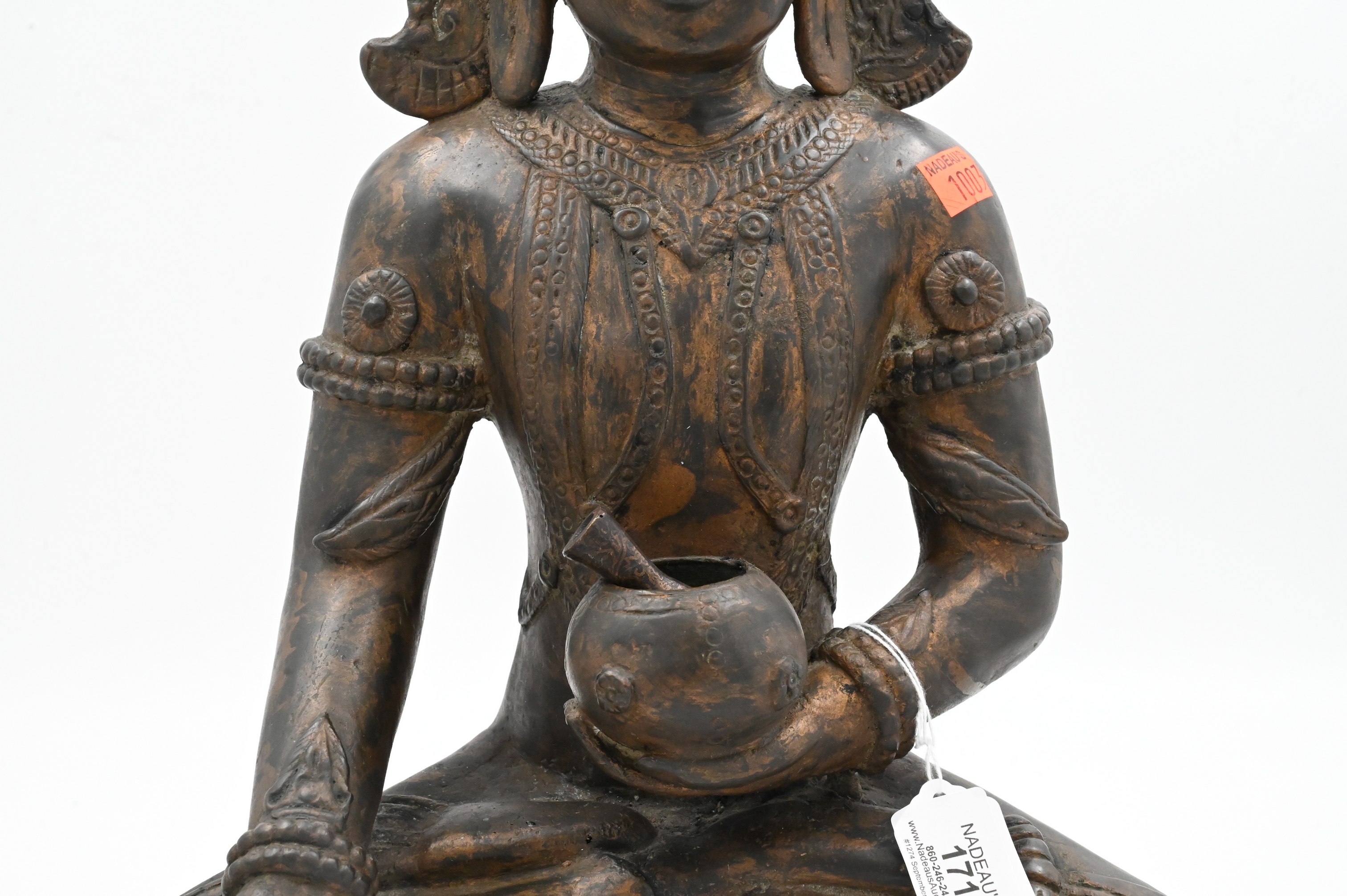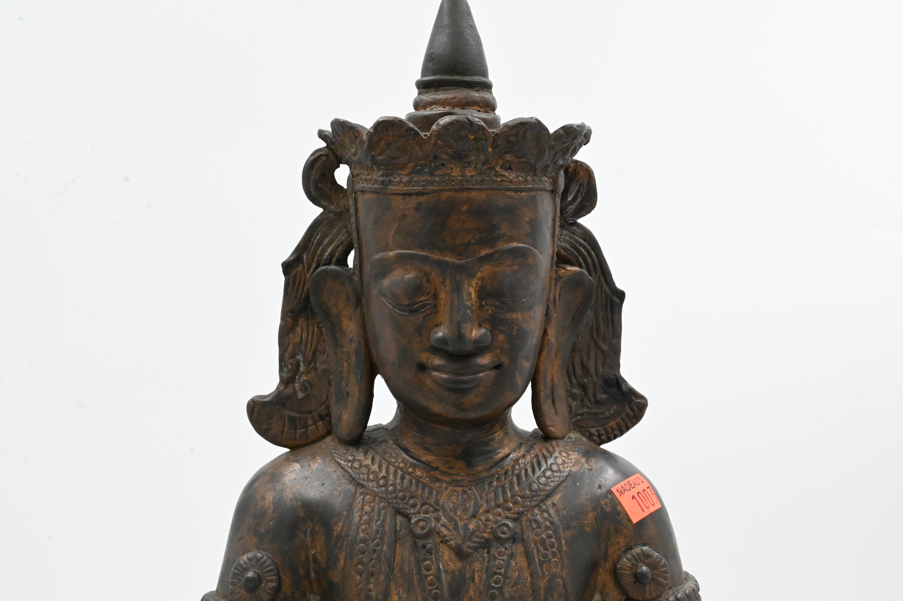 Southeast Asian style featuring crowned buddha holding a mortar and pestle set on carved wooden base