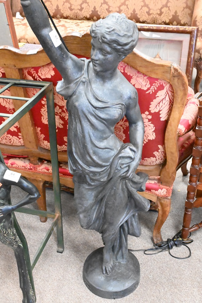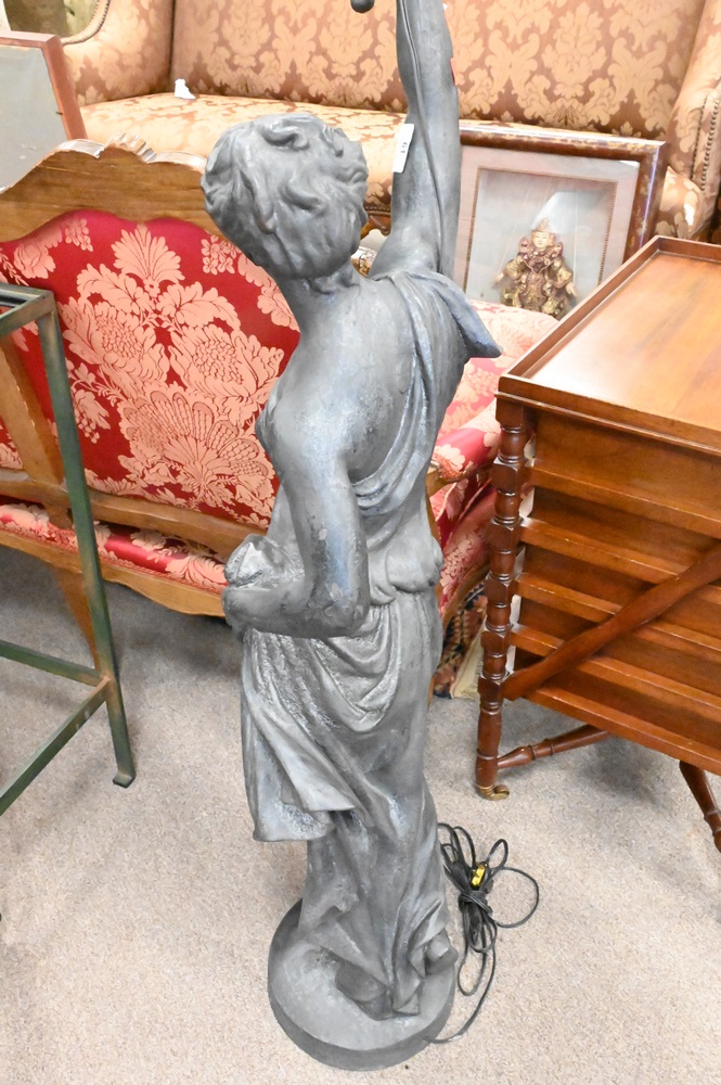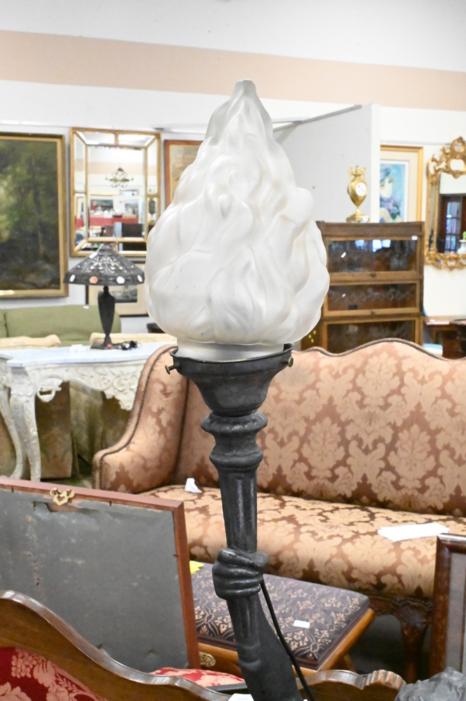 Cast Iron Figure/Post, classical woman holding torch, electrified, height 62 inches.
