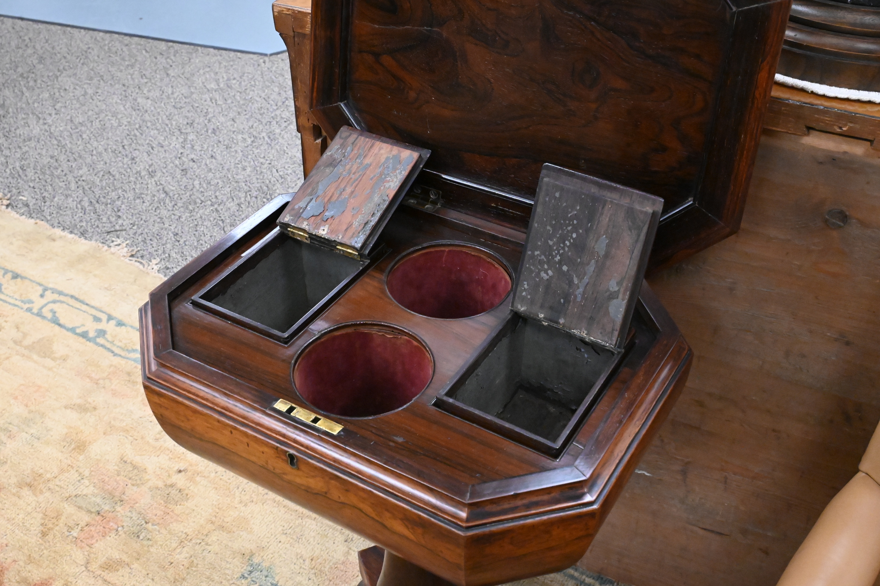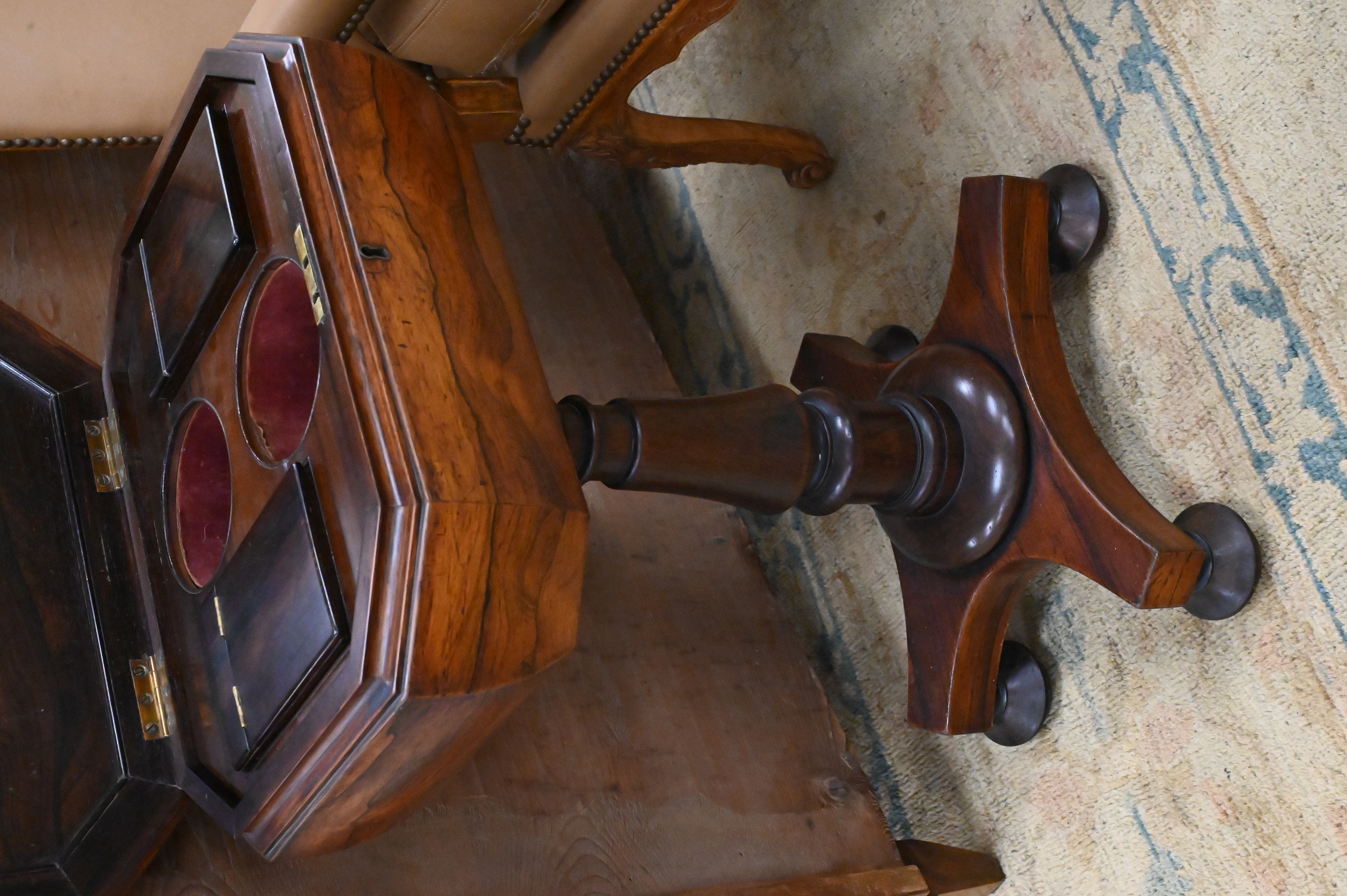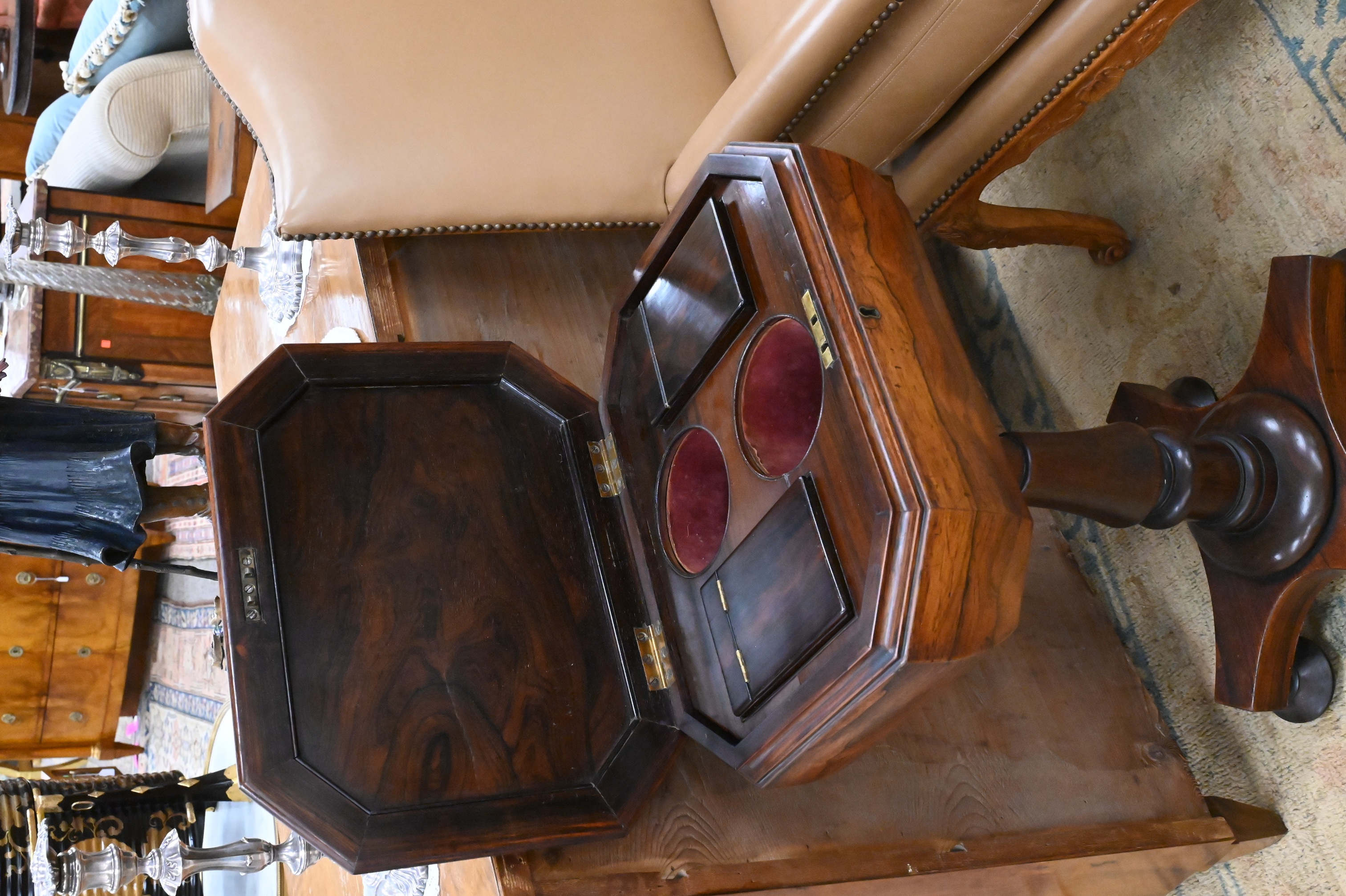 with octagonal hinged top opening to reveal a fitted interior with two lidded tea boxes and circular velvet-lined wells, raised on a turned pedestal and quatreform base ending in compressed bun feet, retains original brass fittings and fine patina, circa 1835