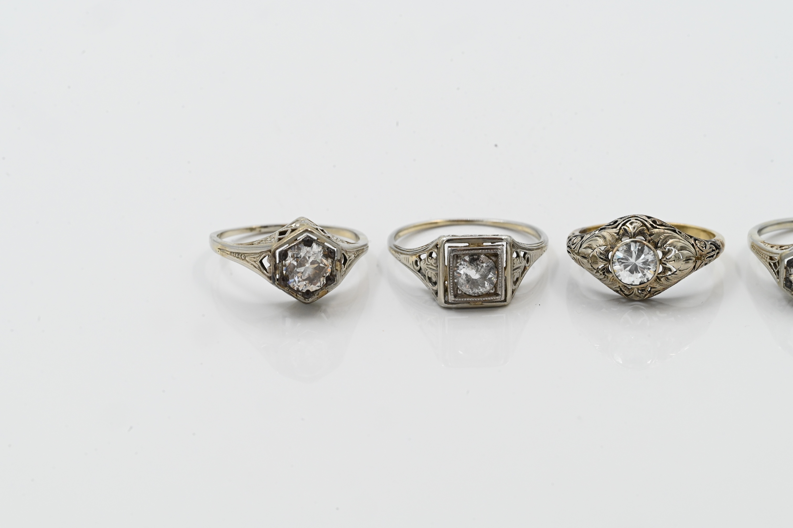 each set with a solitaire diamond, diamonds approximately .80 carats, .75 carats, .50 carats, and .40 carats; 9.6 grams total weight