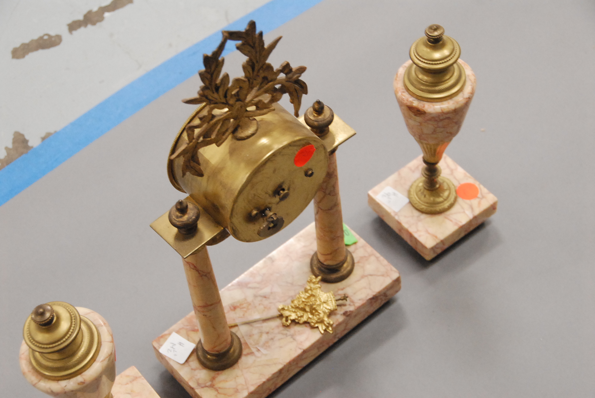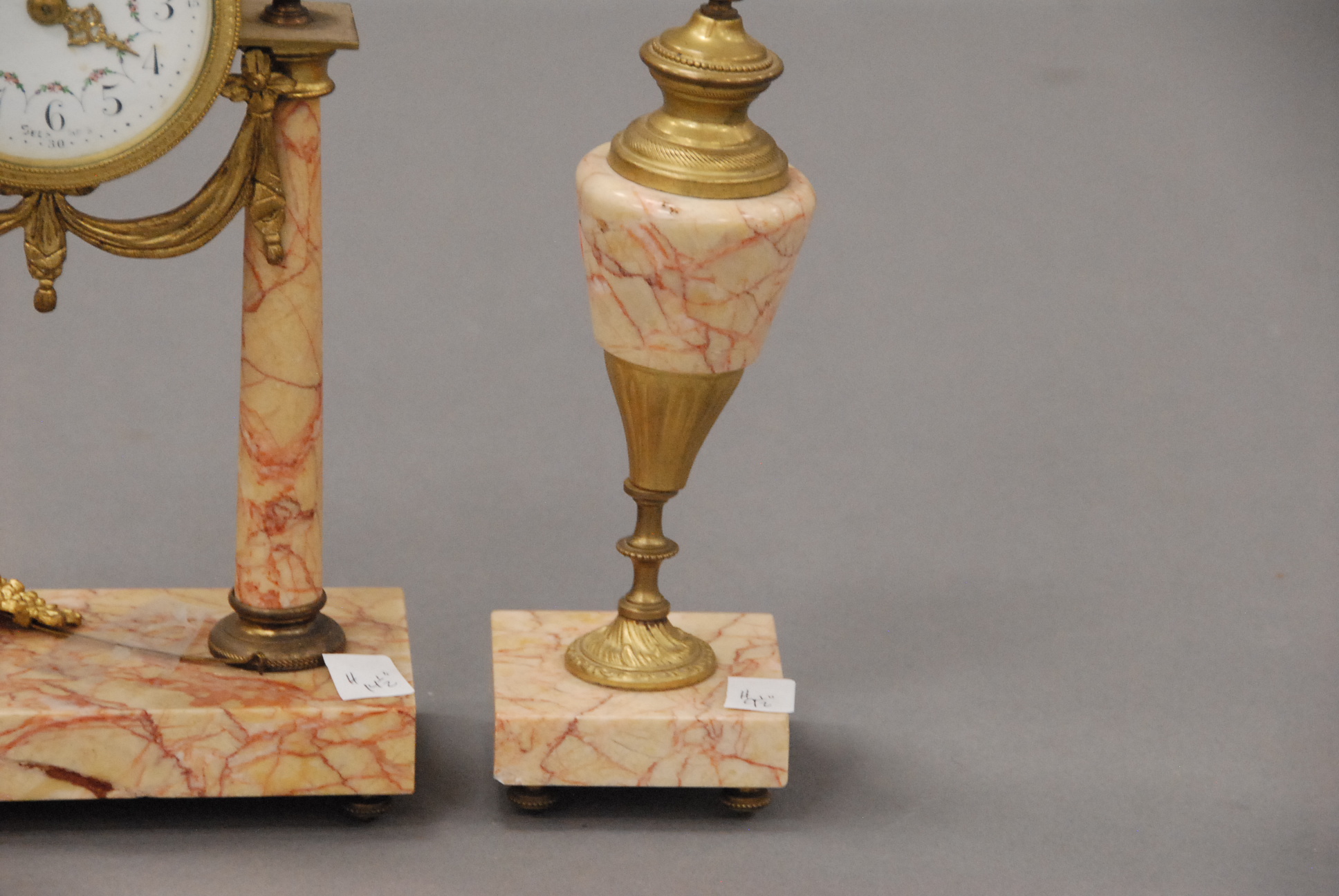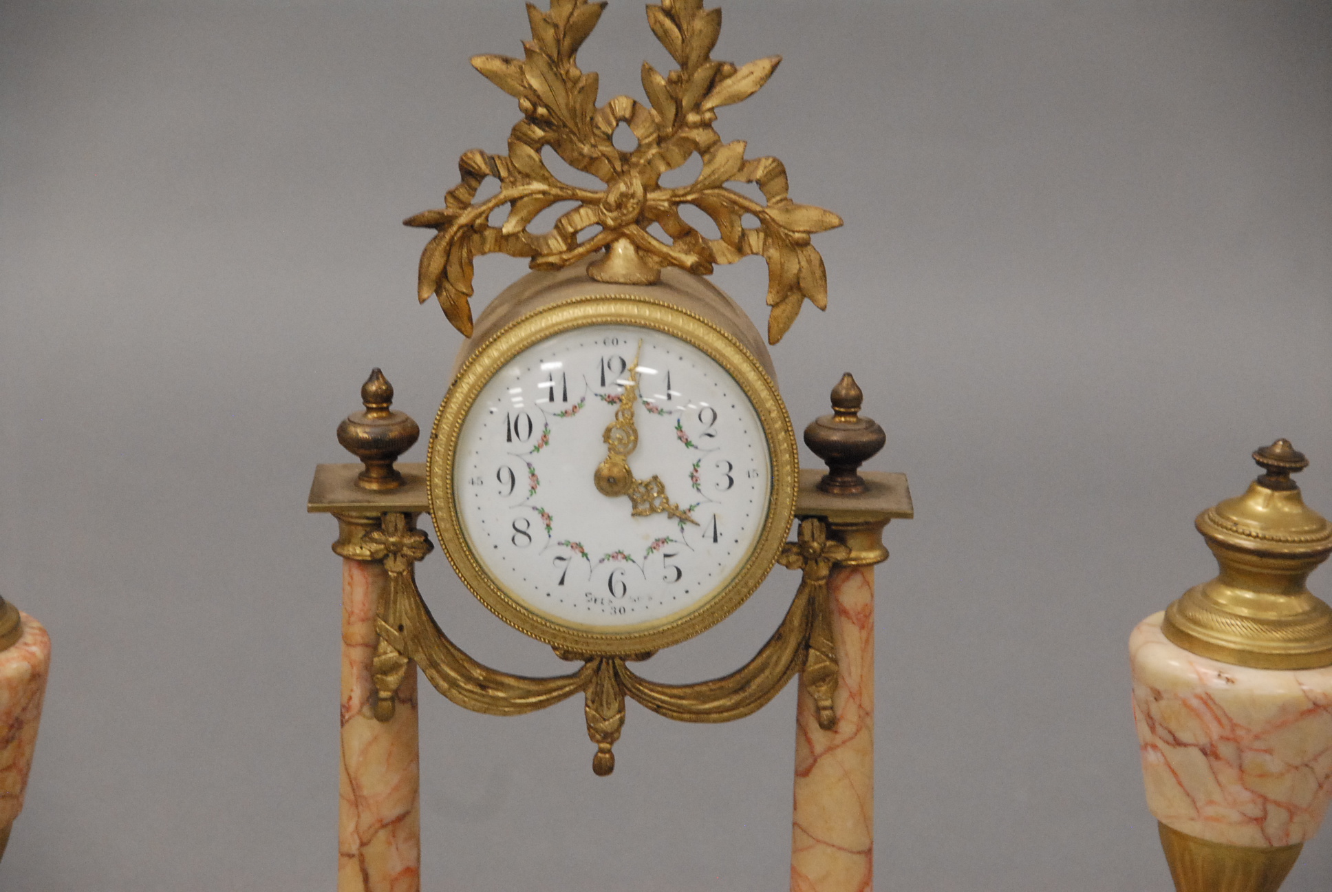 French three piece marble and gilt bronze clock set, two urns and a clock.