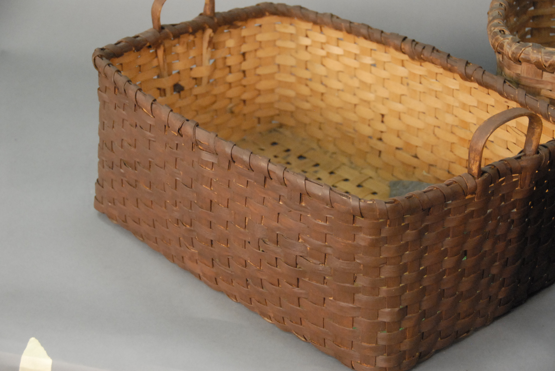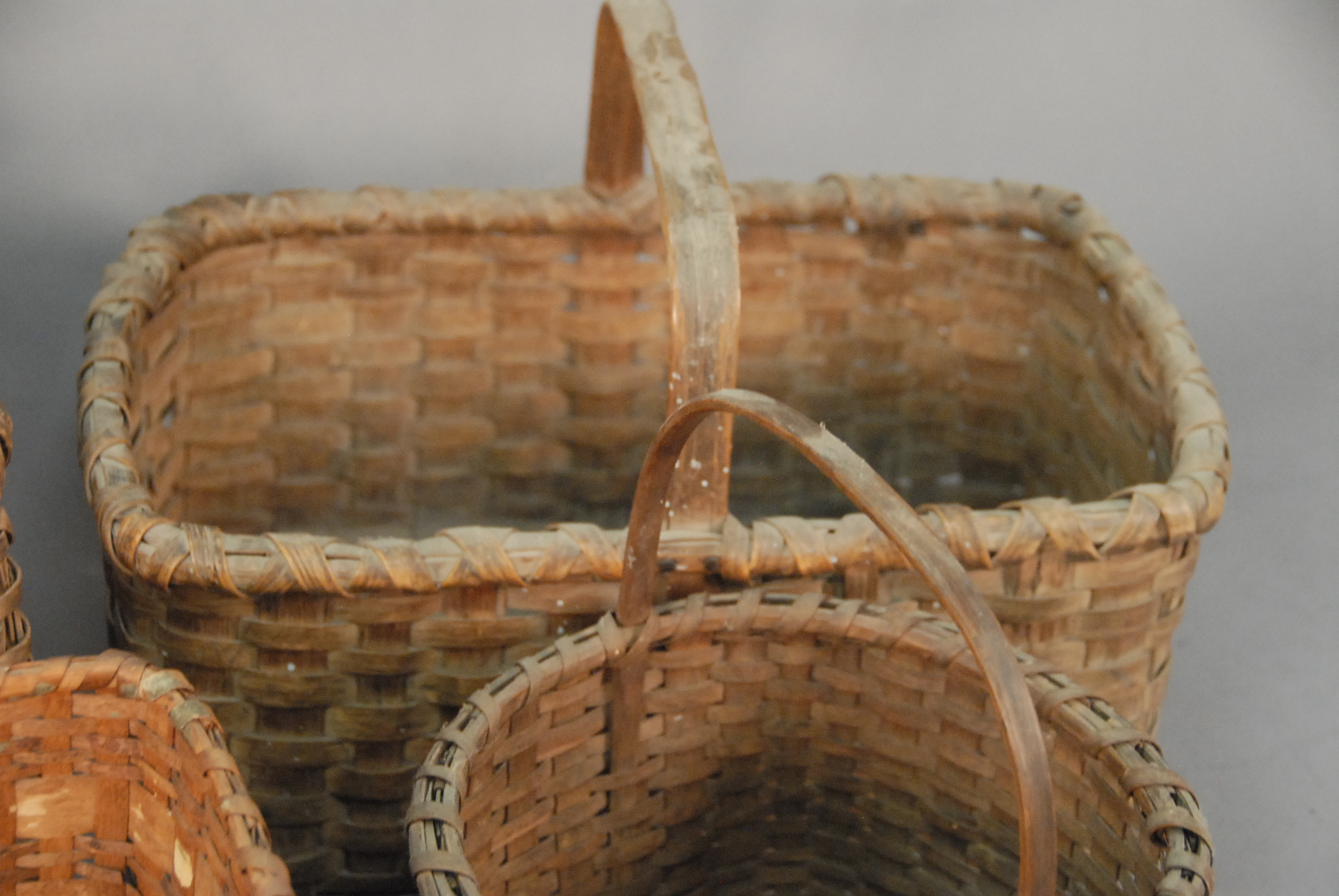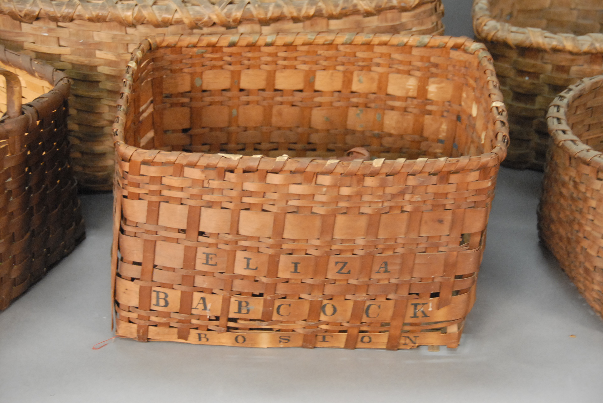 Group of six baskets, rectangular and round, one marked Eliza Babcock Boston 13 Franklin Pla. August 12, 1837 slight damage. ht. 6 1/2 in. wd. 10 in. to ht. 7 in. wd. 19 in.