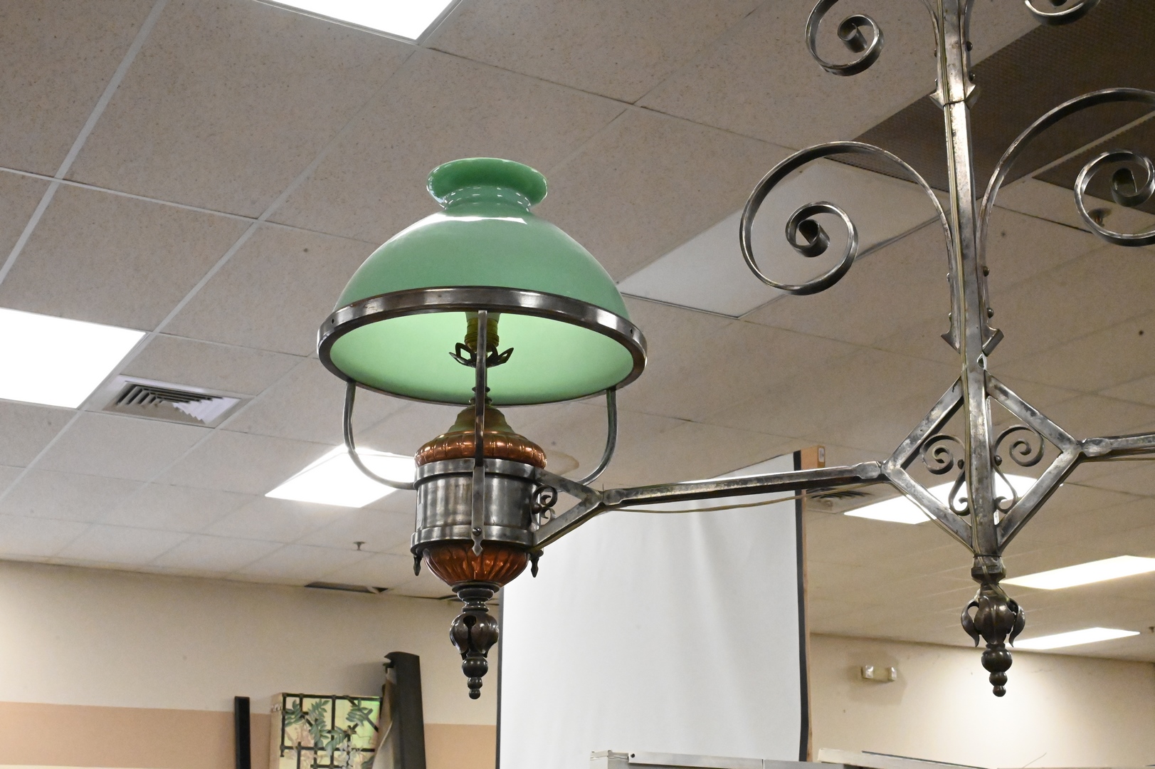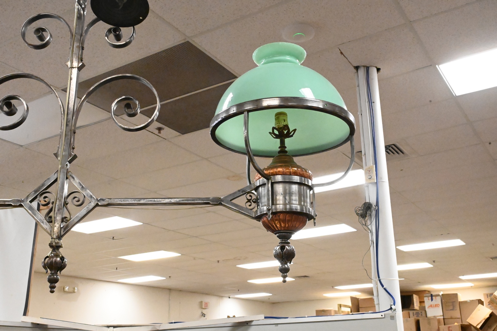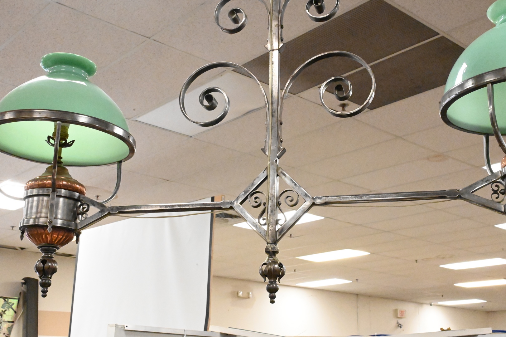 Large Iron Victorian Hanging Light, having iron frame copper oil wells and pair of glass shades, approximate height 56 inches, approximate diameter 46 inches.