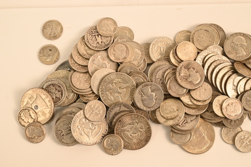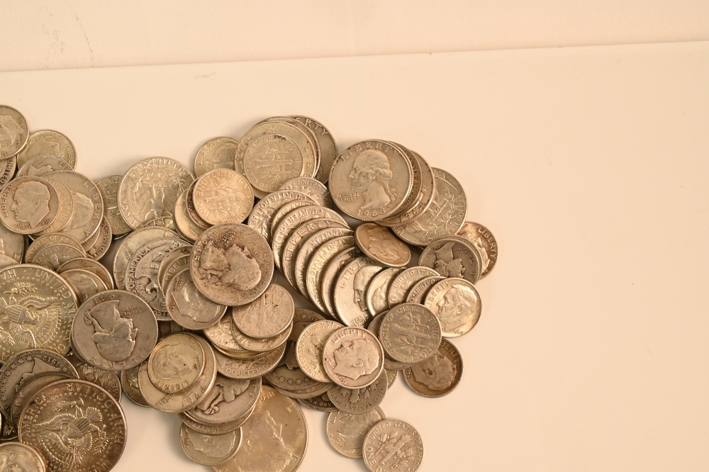 Lot 61: Large lot of 90% Silver US Coins, to include 71 Roosevelt dimes, 5 Barberhead quarters, 6 silver half dollars, 2 silver Peace dollars.