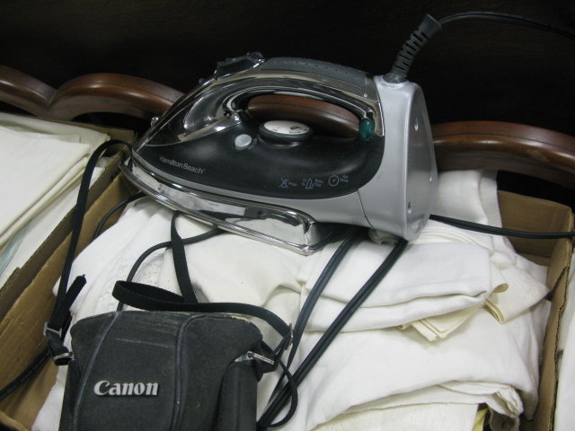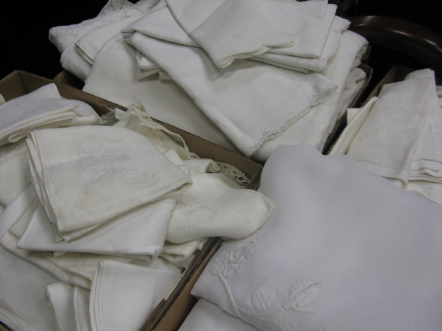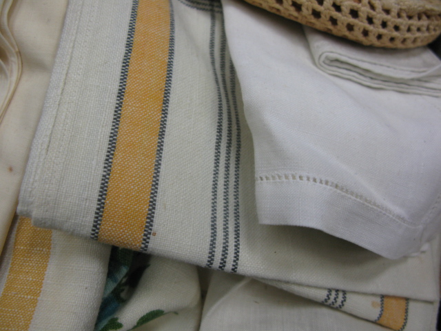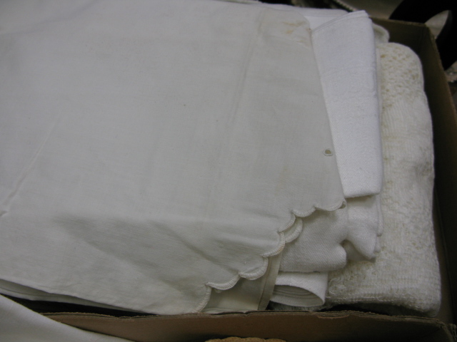 Nine box lots of table linens including a Hudson Bay four point wool blanket.