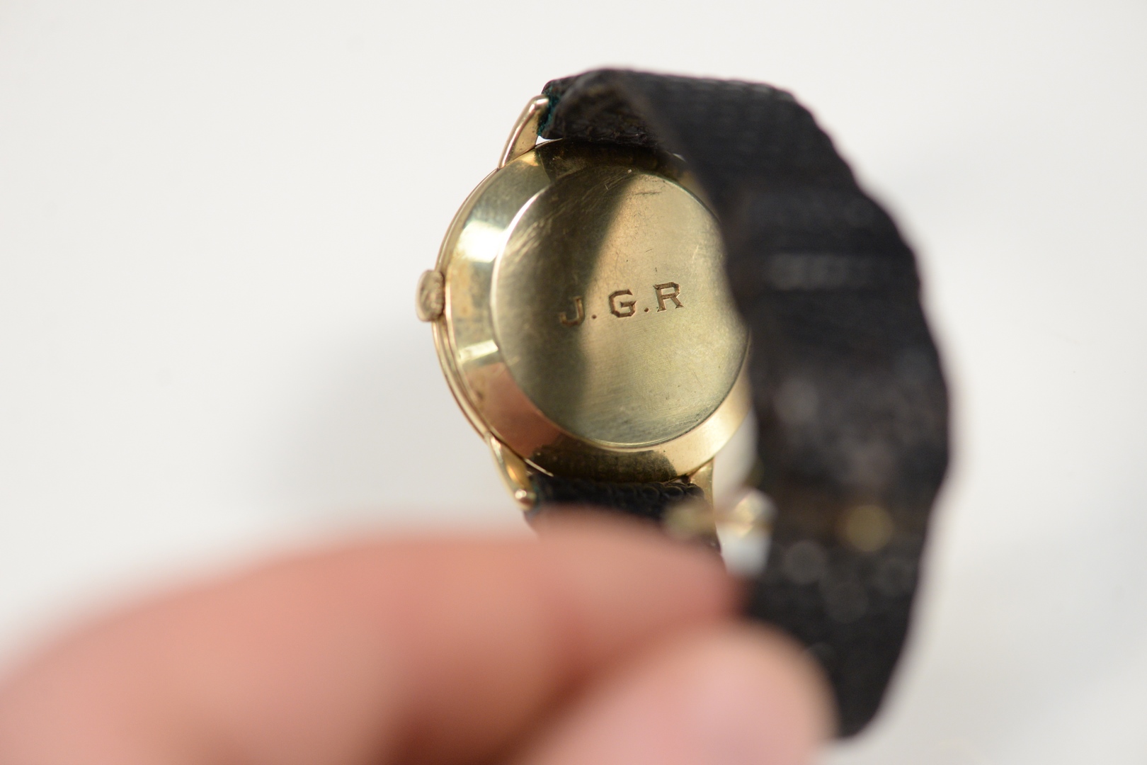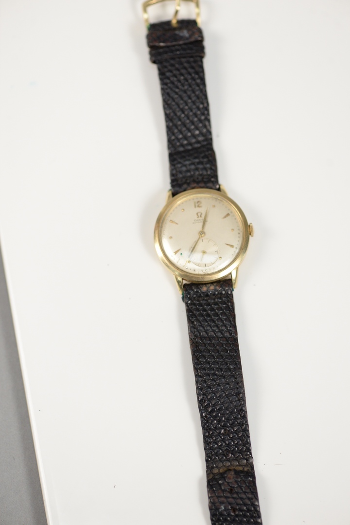 Lot 61: Omega Automatic Wadsworth 14 Karat Gold Men’s Wristwatch with an Omega band, in 14 karat gold, and leather 32.2 millimeters