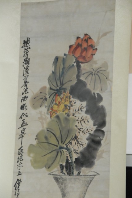 Oriental scroll with vase and flowers, Wu Chang Shuo
