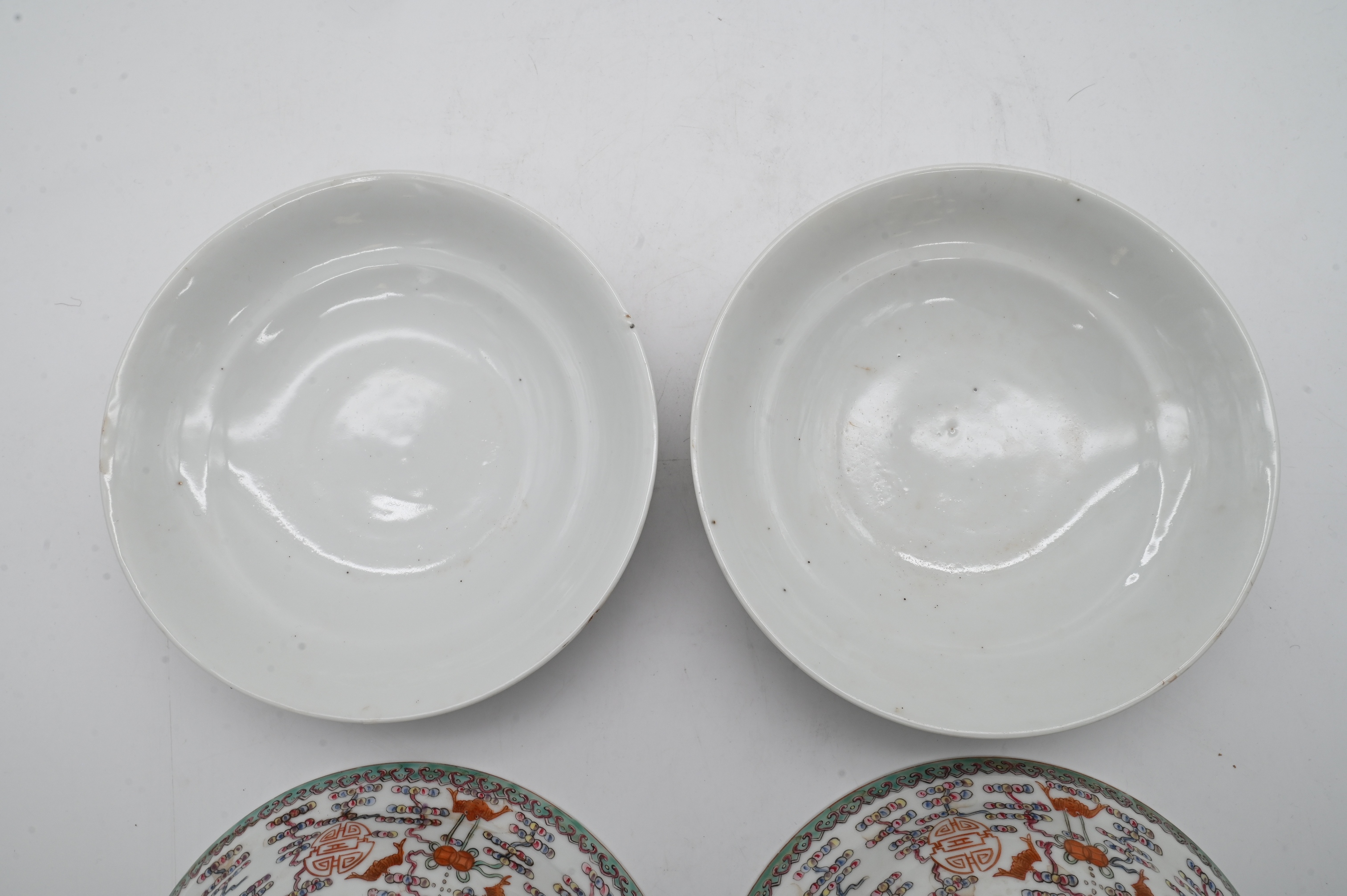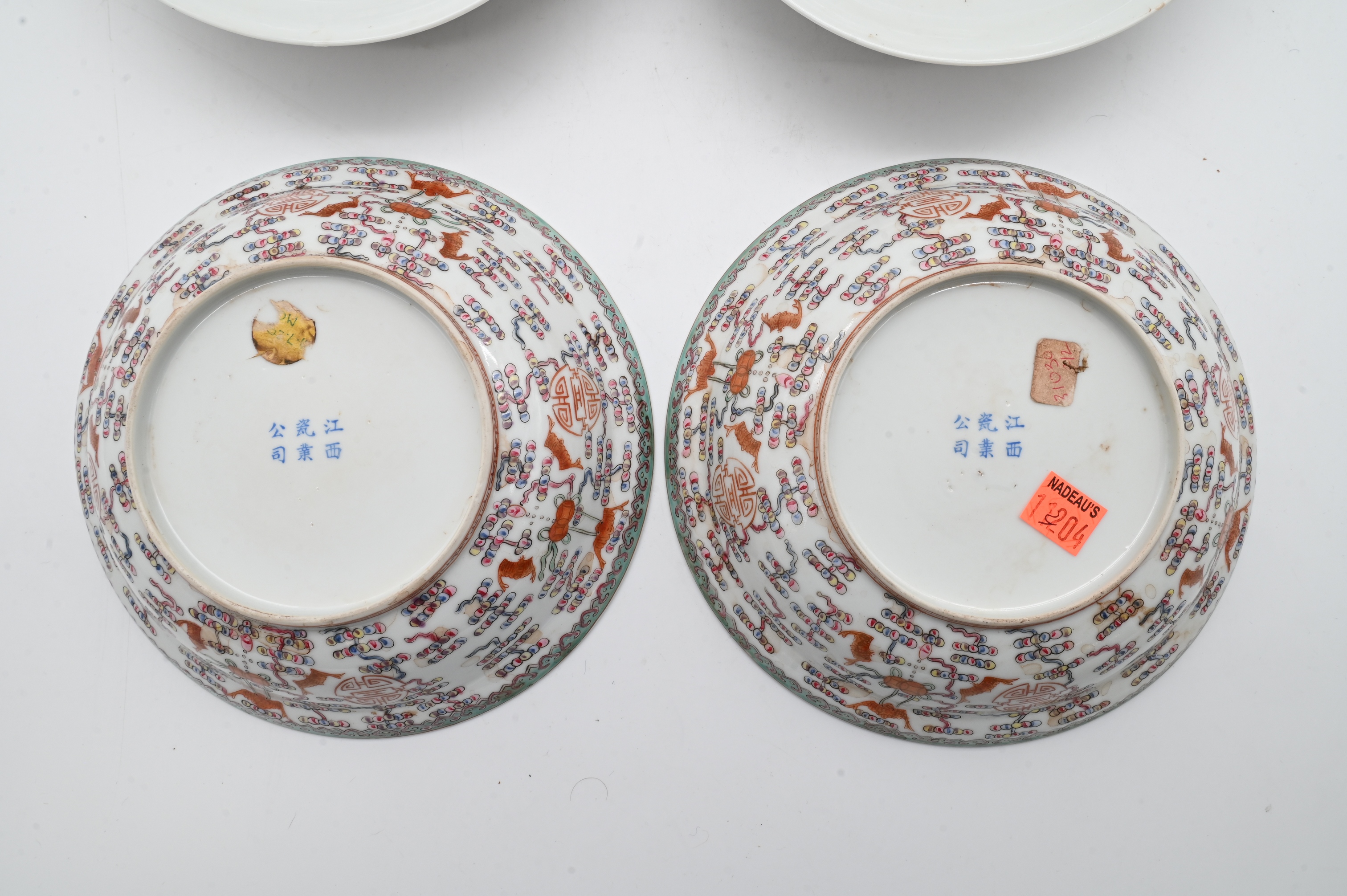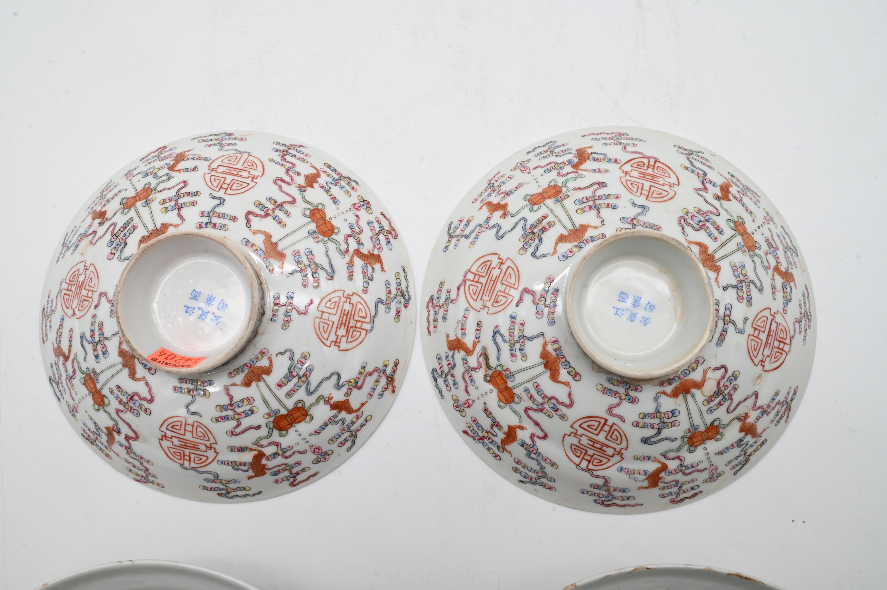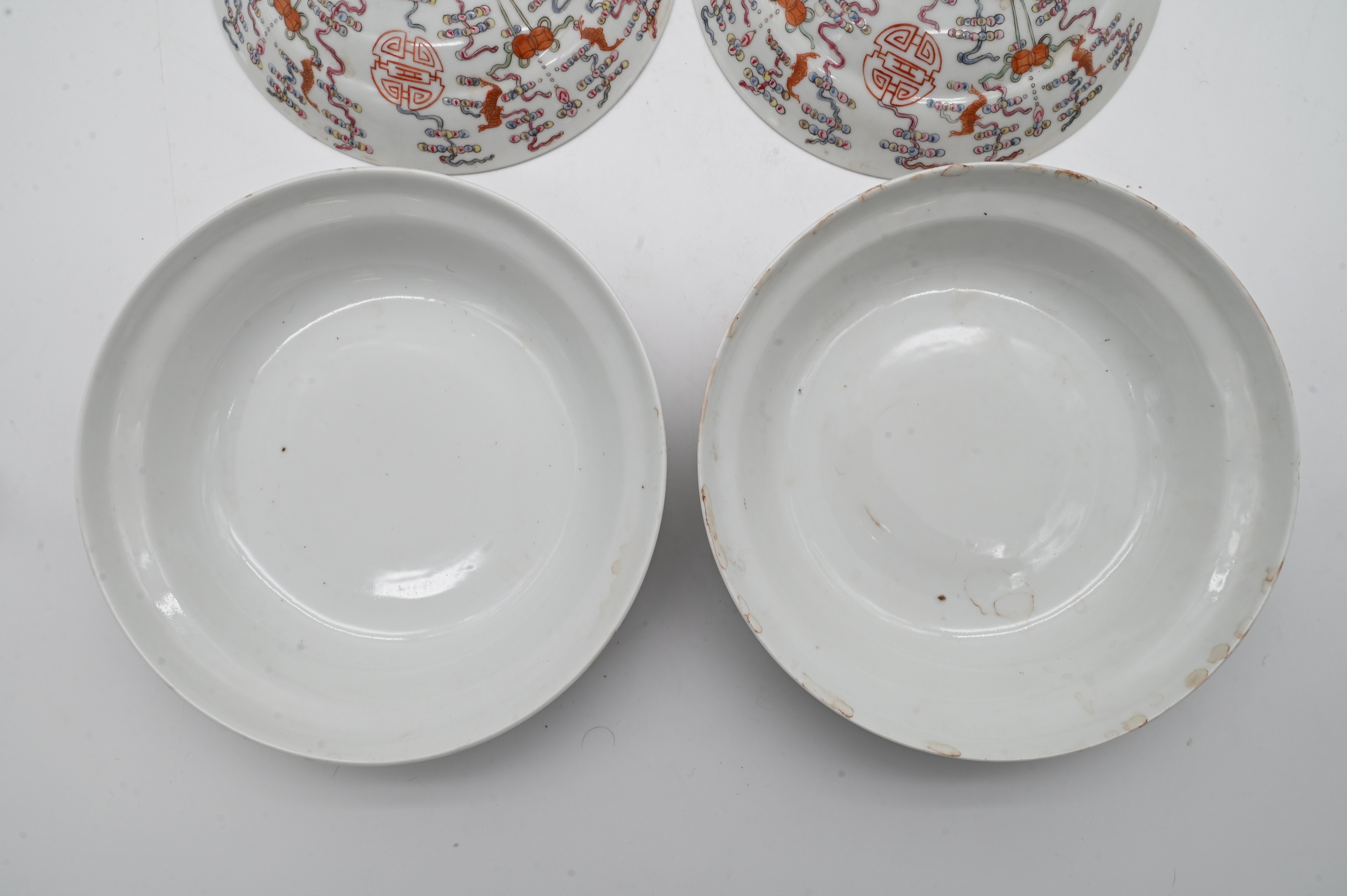 each of rounded form having domed cover, decorated in iron red, green, and polychrome enamels with stylized shou characters, bats, and hanging jewel motifs amidst scrolling elements, key fret border, raised on short circular foot