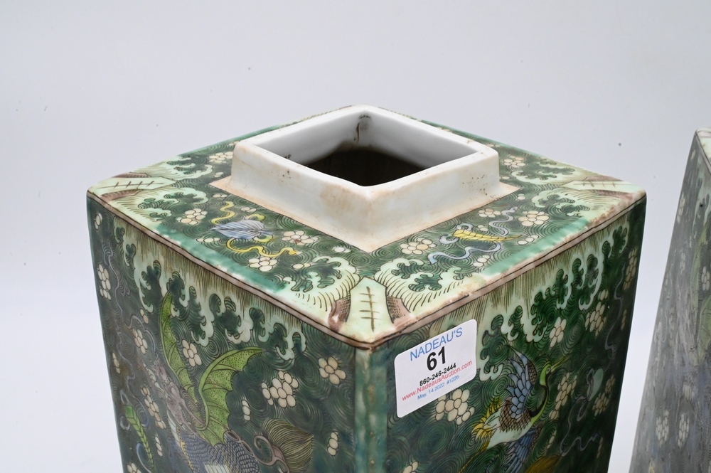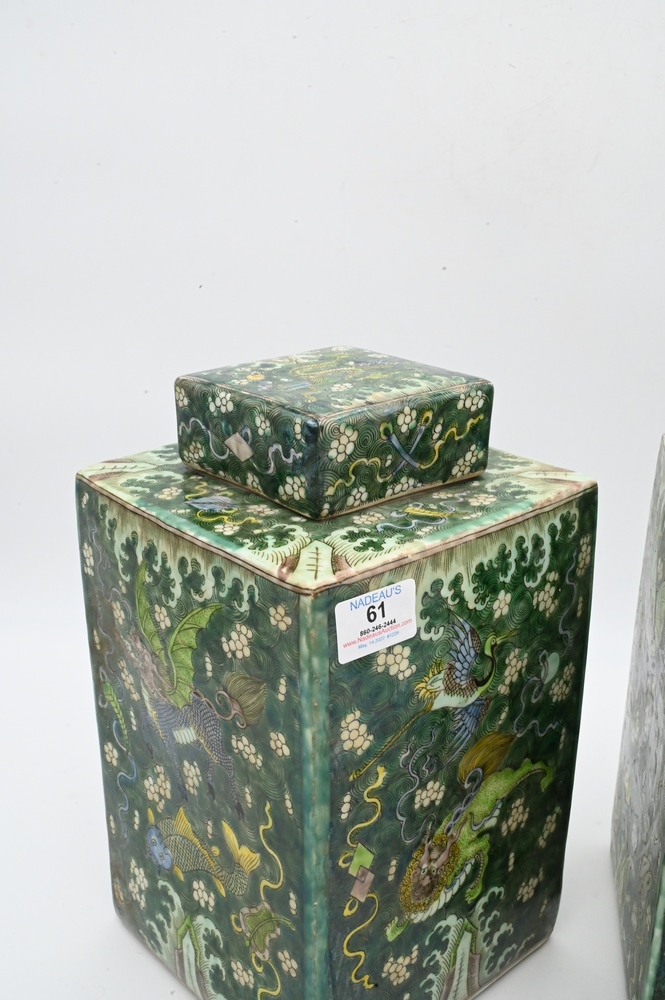 Lot 61: Pair of Chinese Famille Verte Porcelain Tea Jars, in square form with foo dogs, height 12 1/4 inches.
