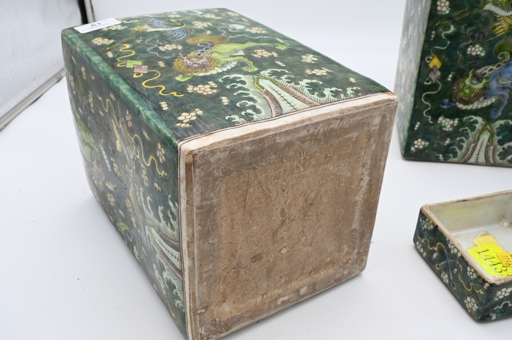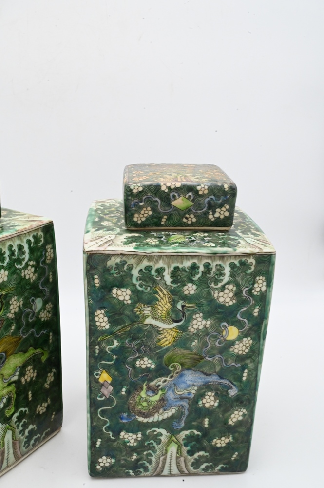 Pair of Chinese Famille Verte Porcelain Tea Jars, in square form with foo dogs, height 12 1/4 inches.