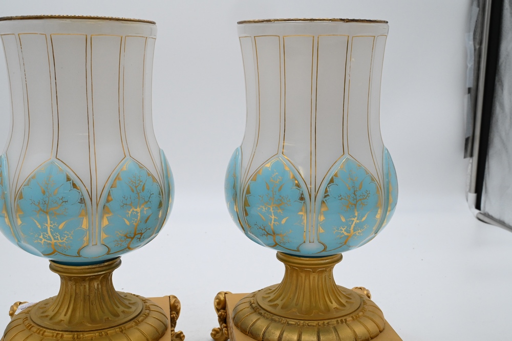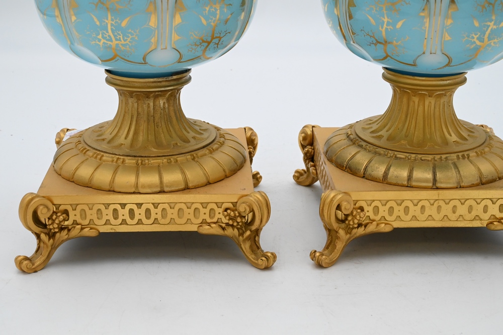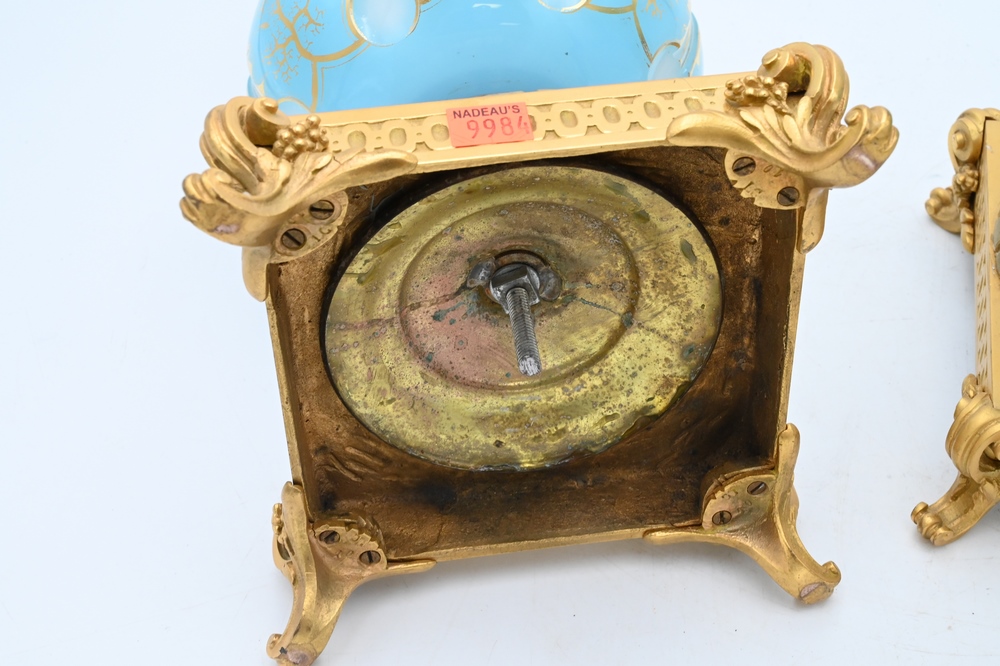 Pair of French Opaline and Bronze Urns, having blue and white opaline glass on gilt bronze bases, height 12 1/4 inches, repaired tops.