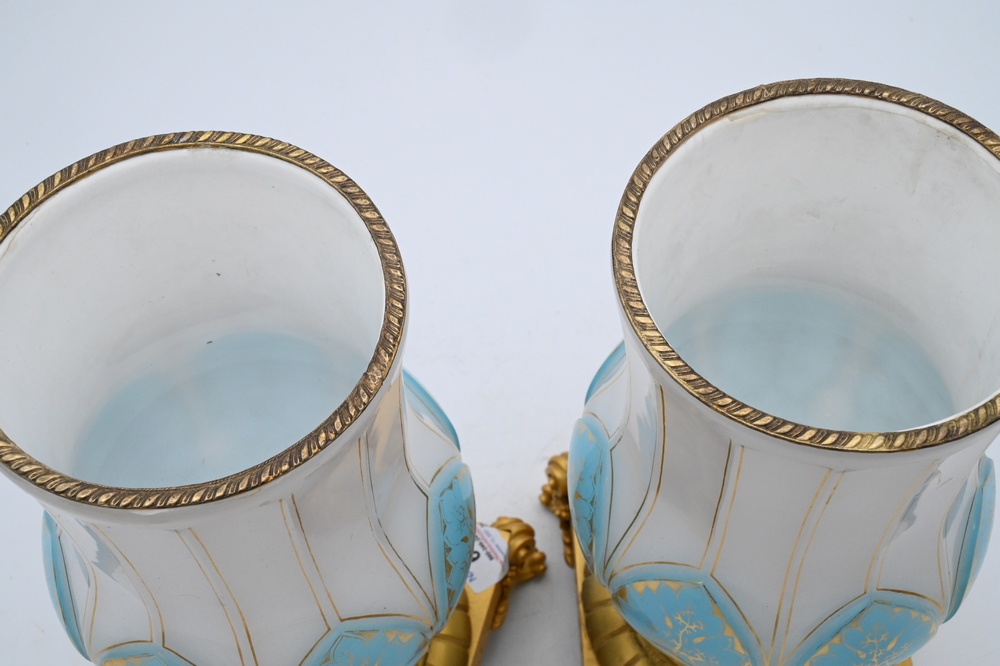 Lot 61: Pair of French Opaline and Bronze Urns, having blue and white opaline glass on gilt bronze bases, height 12 1/4 inches, repaired tops.
