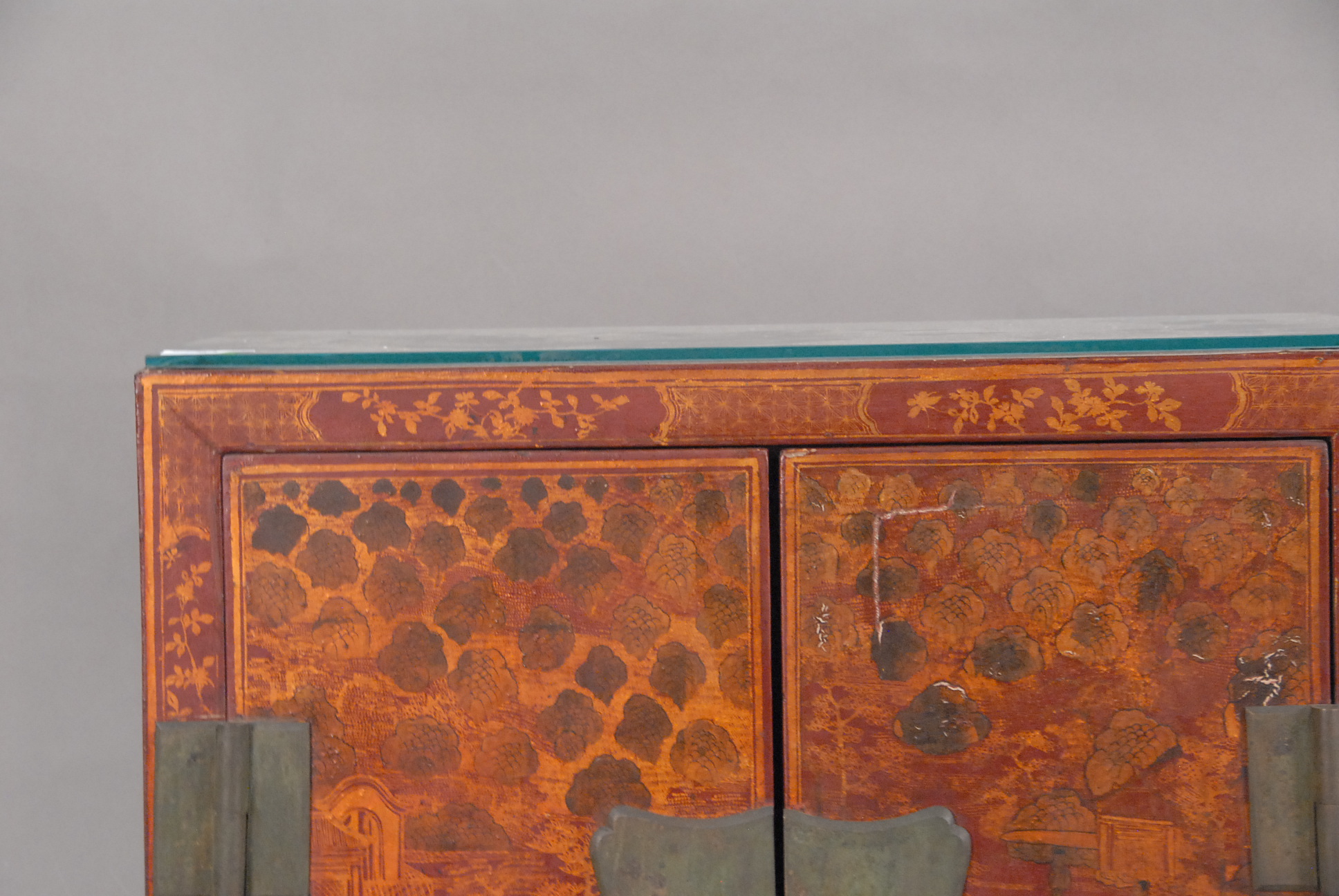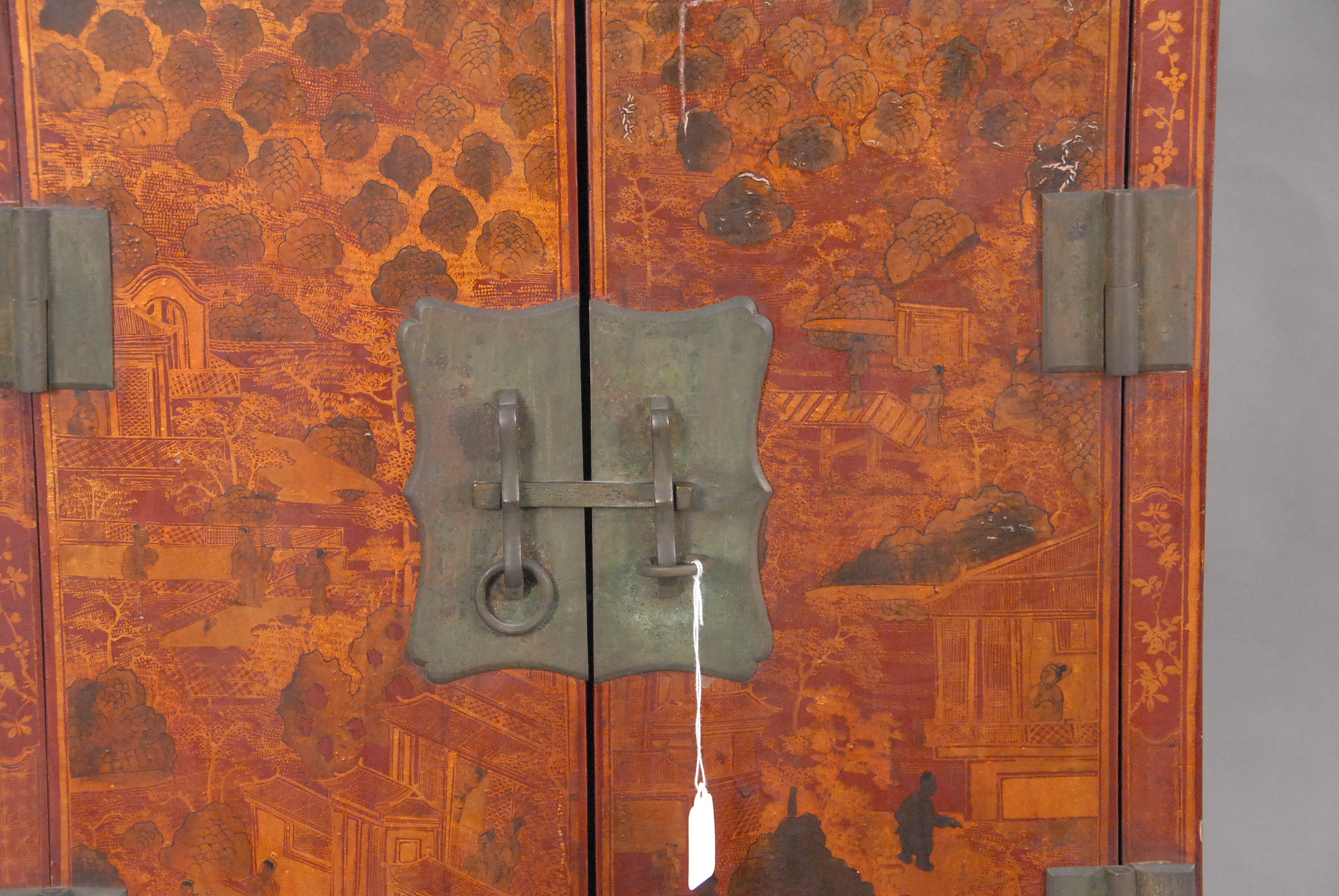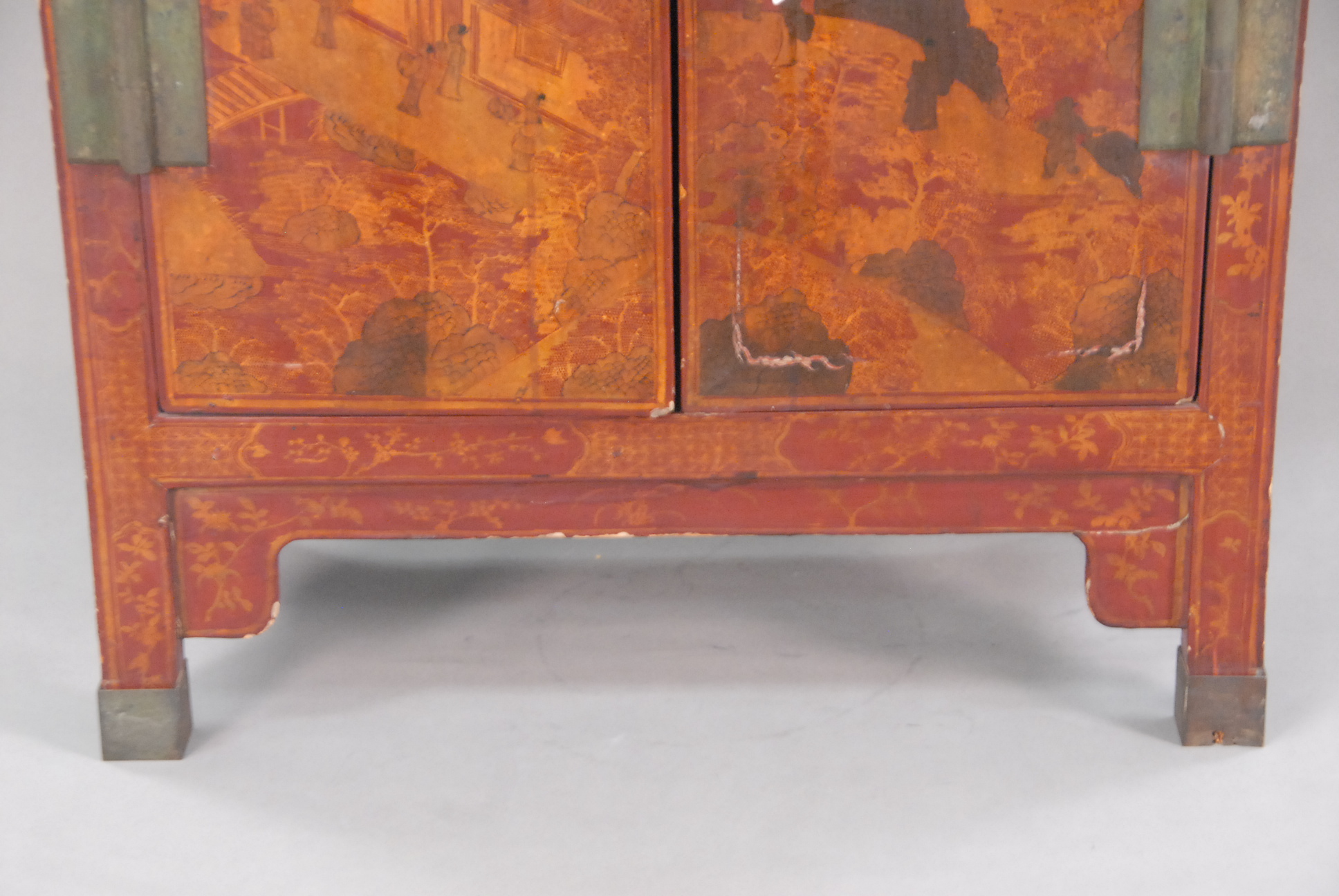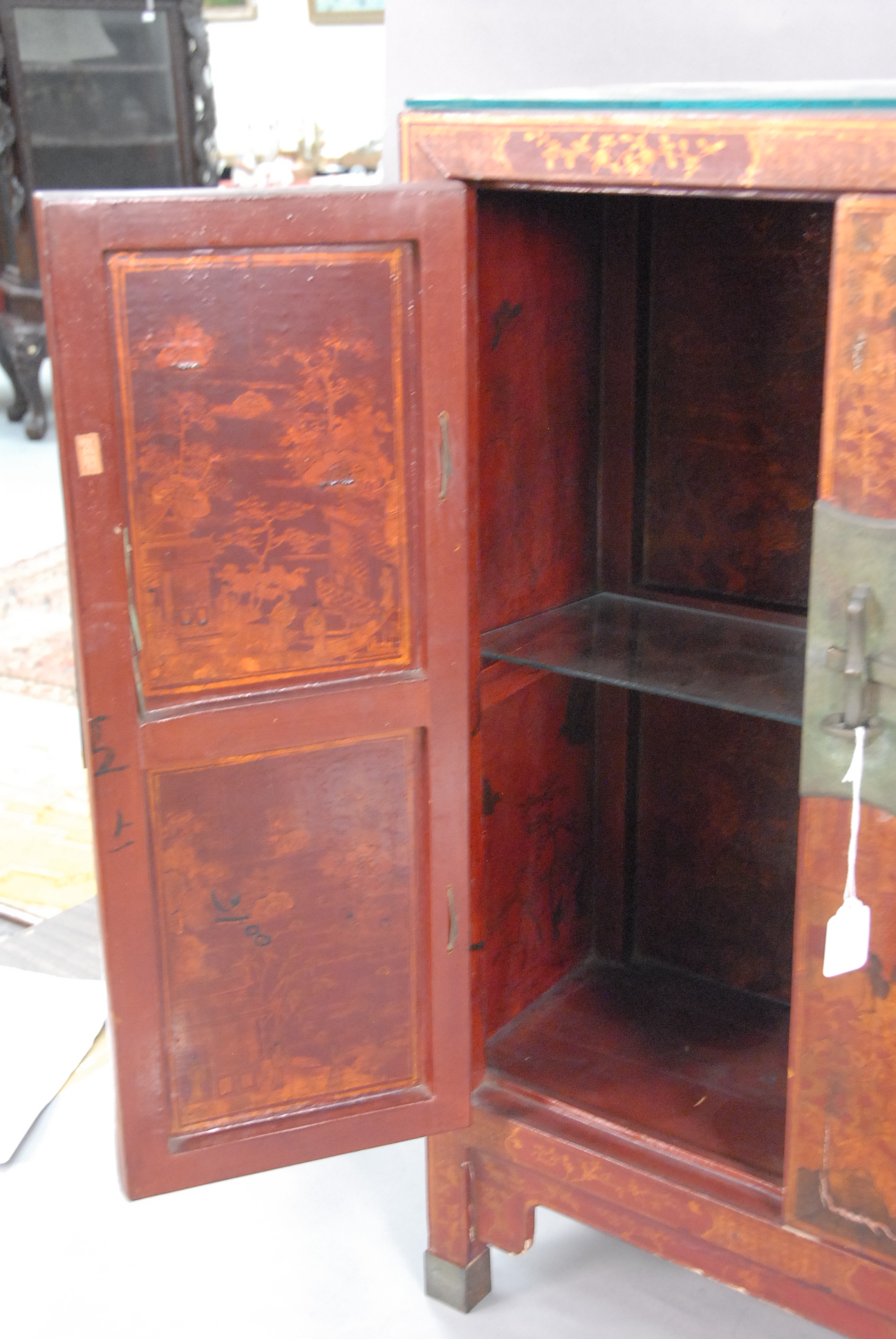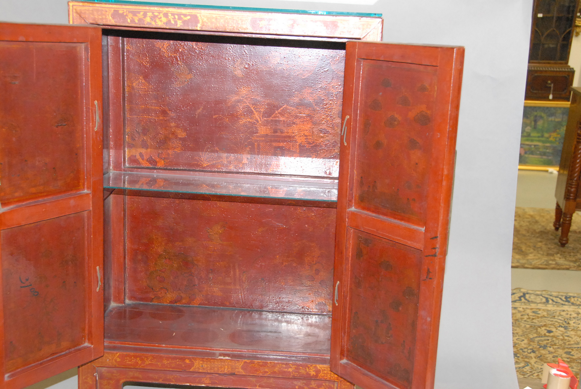 Pair of Oriental red lacquered cabinets with two doors having painted landscape scenes.