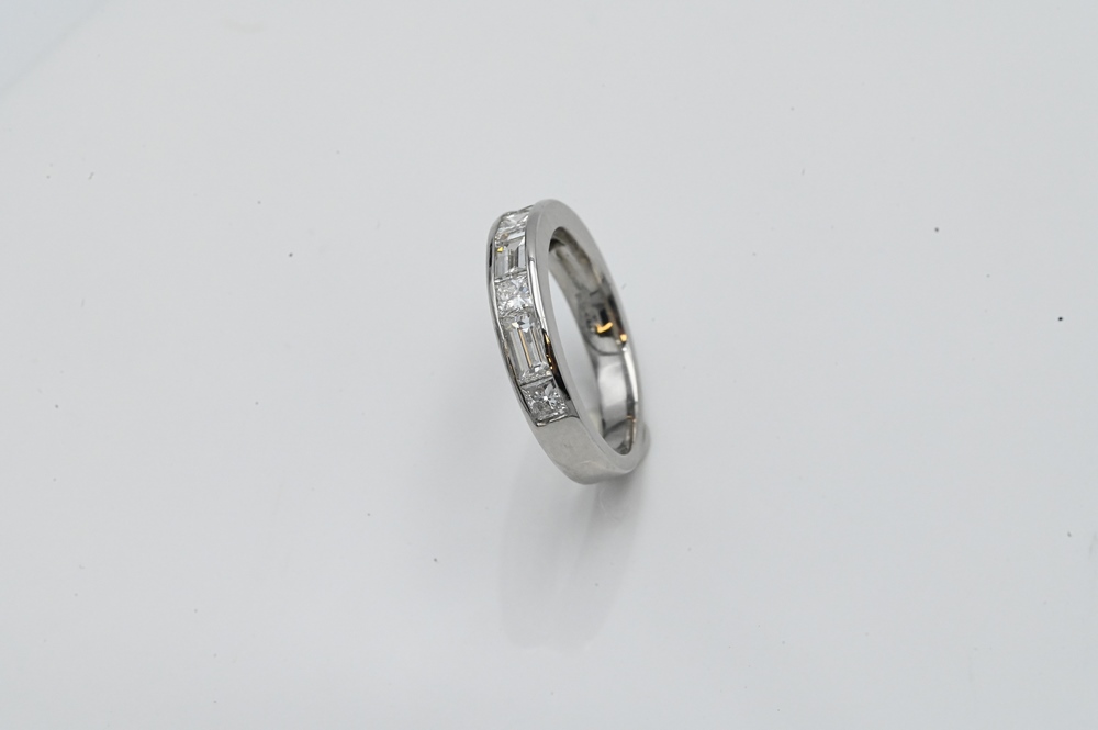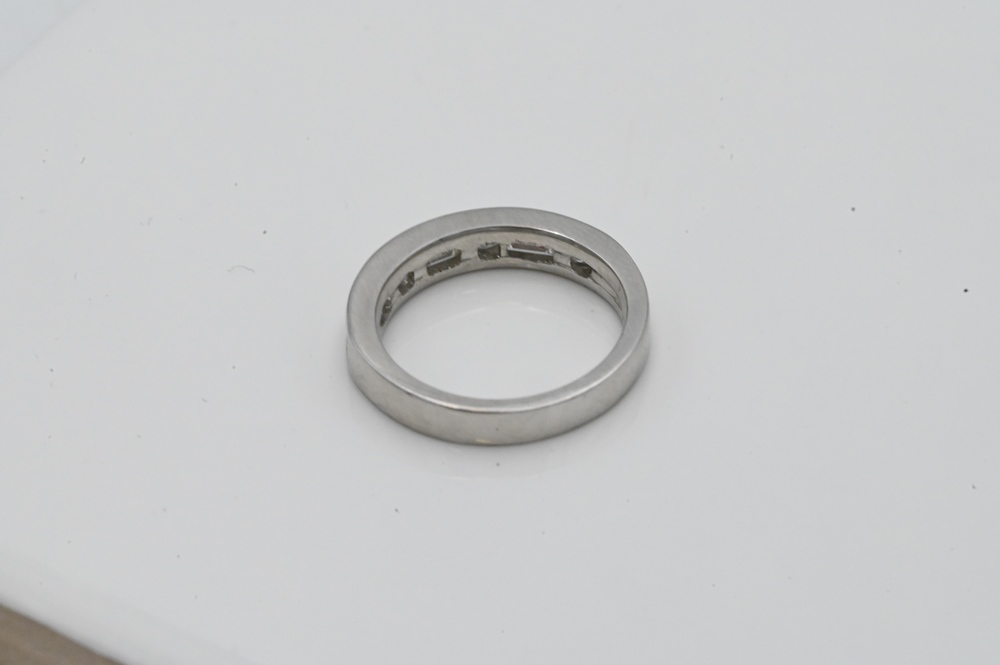 Platinum Ring, set with four princess cut and three baguette diamonds, size 5 1/2, 6.6 grams.