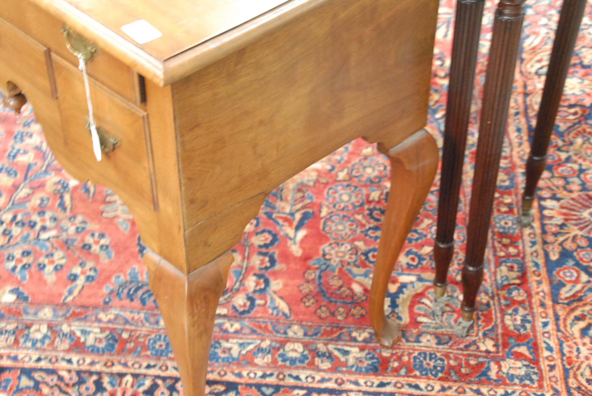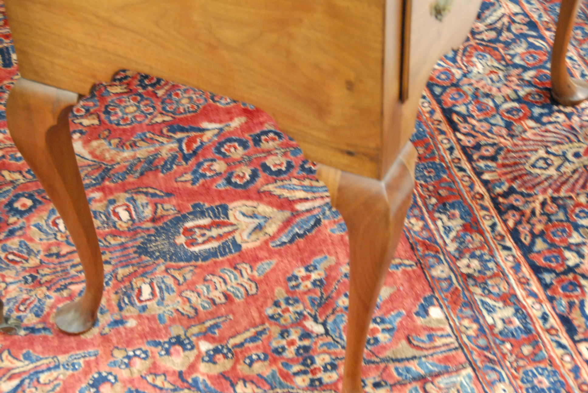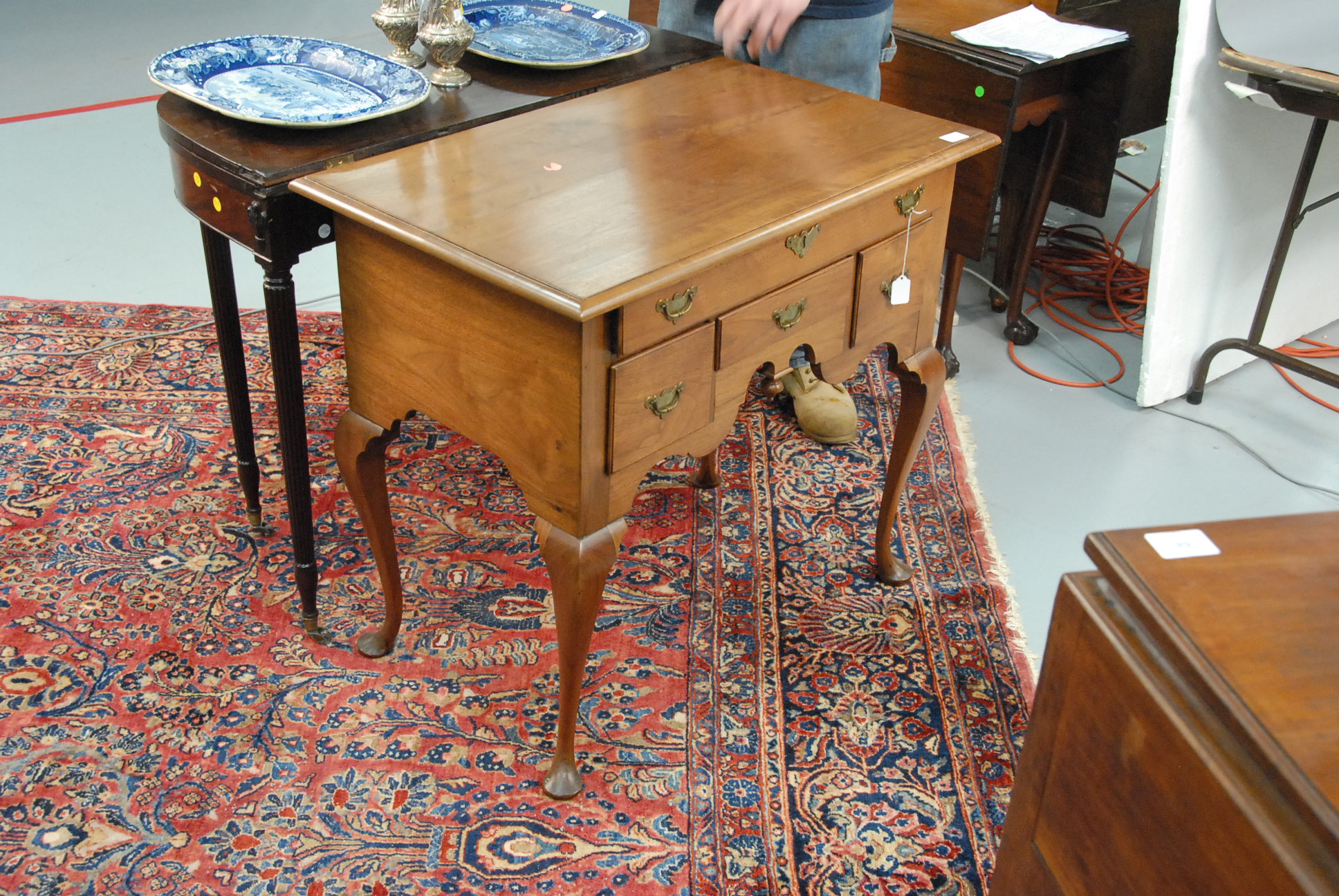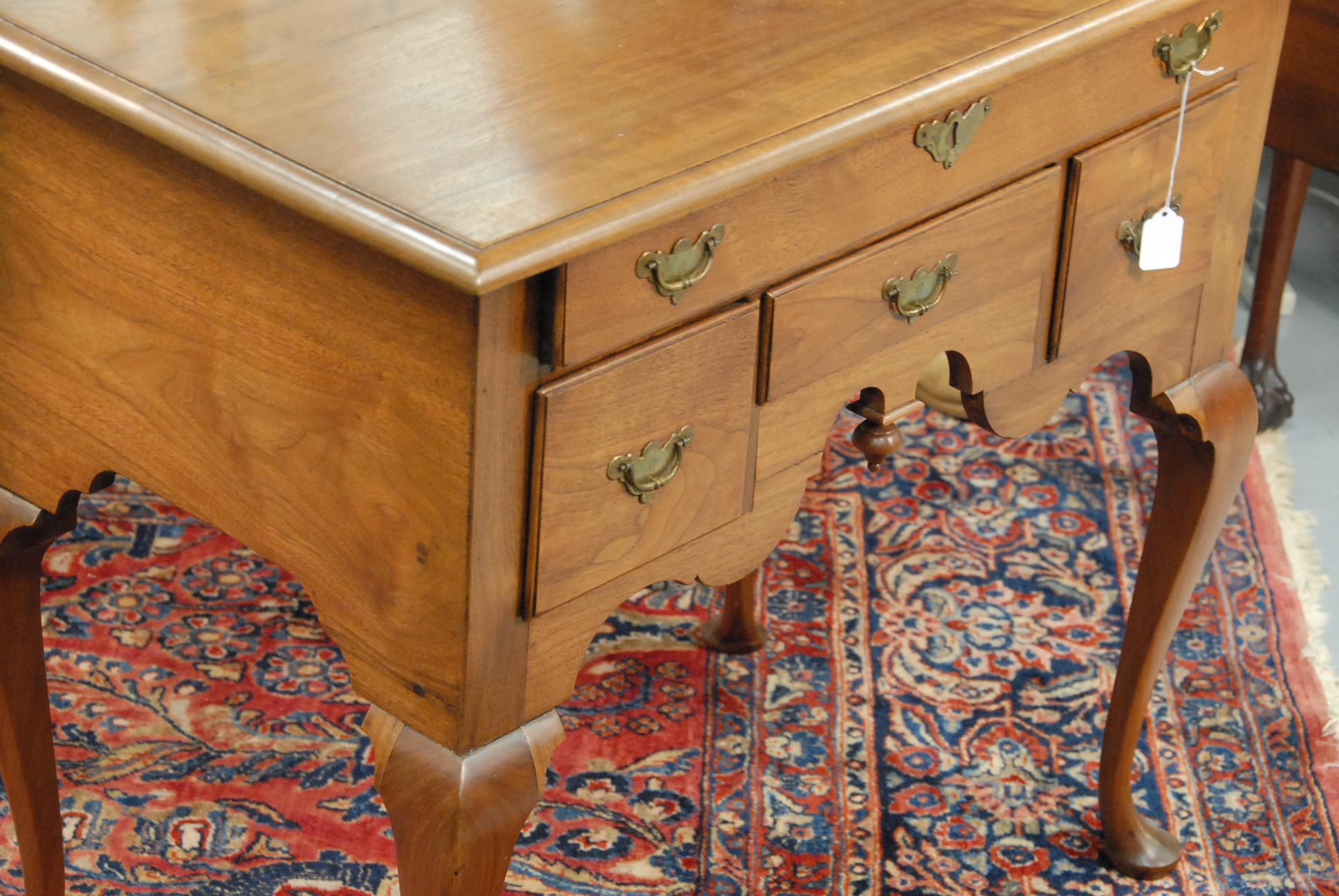 Queen Anne walnut lowboy with long drawer over three short drawers on cabriole legs ending in pad feet.