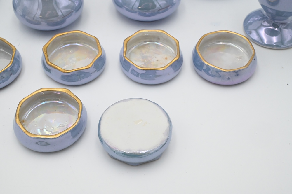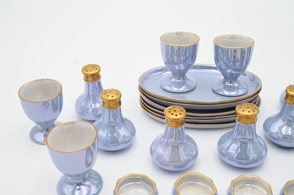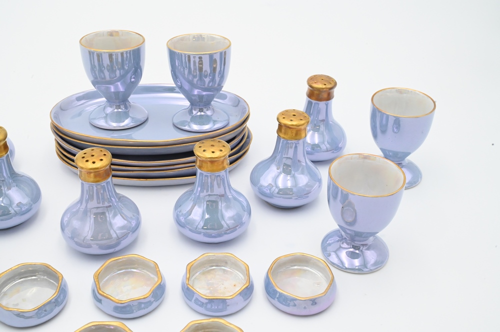 Set of Six Austrian Porcelain Place Settings, Moritz Zdekauer Manufactory, late 19th/early 20th century, each comprising an egg cup; open salt; pepper shaker; and an oval tray, length approximately 6 inches.