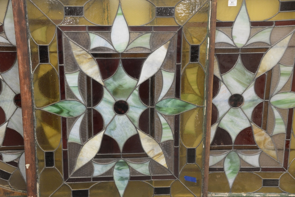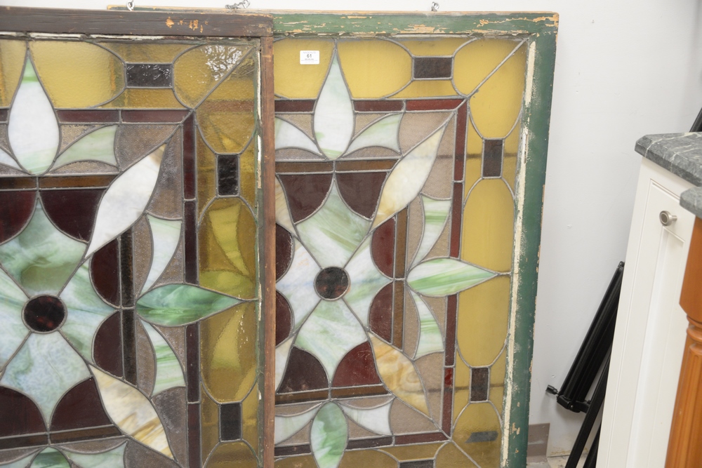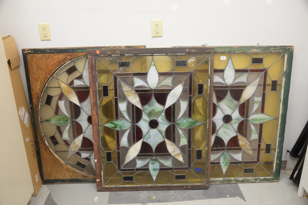 Lot 61: Set of Three Stained Glass Windows, to include a pair along with an arch shaped window, 37″ x 43 1/2″ and 35″ x 43″.