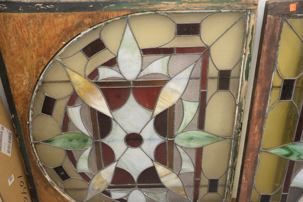 Set of Three Stained Glass Windows, to include a pair along with an arch shaped window, 37″ x 43 1/2″ and 35″ x 43″.