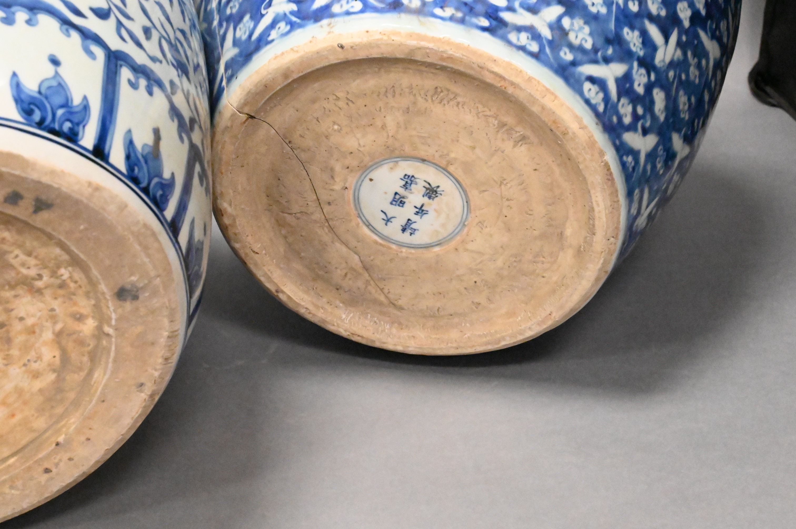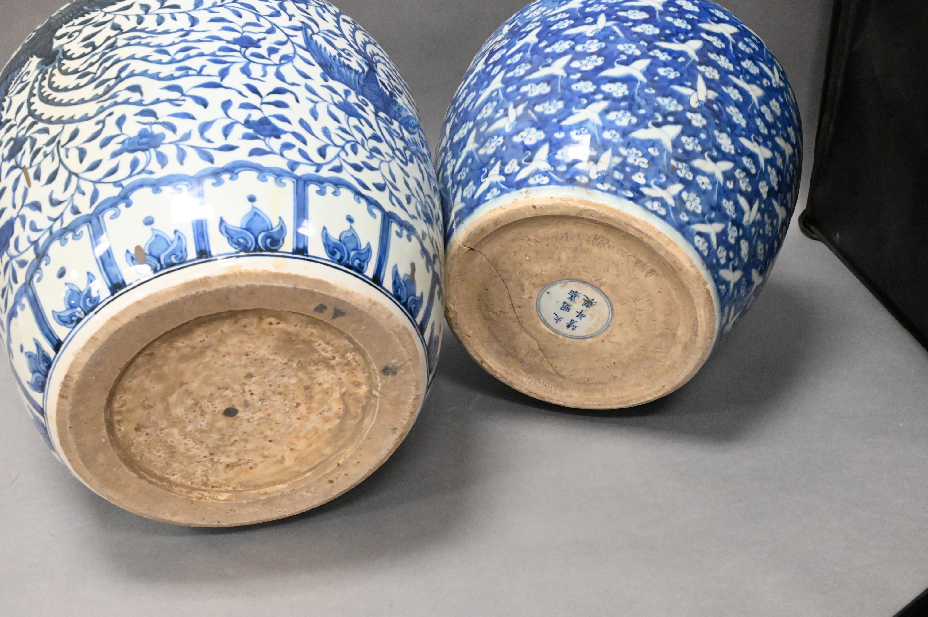 to include one having crane motif, character marks to base (cracked), one having phoenix motif, character marks to neck