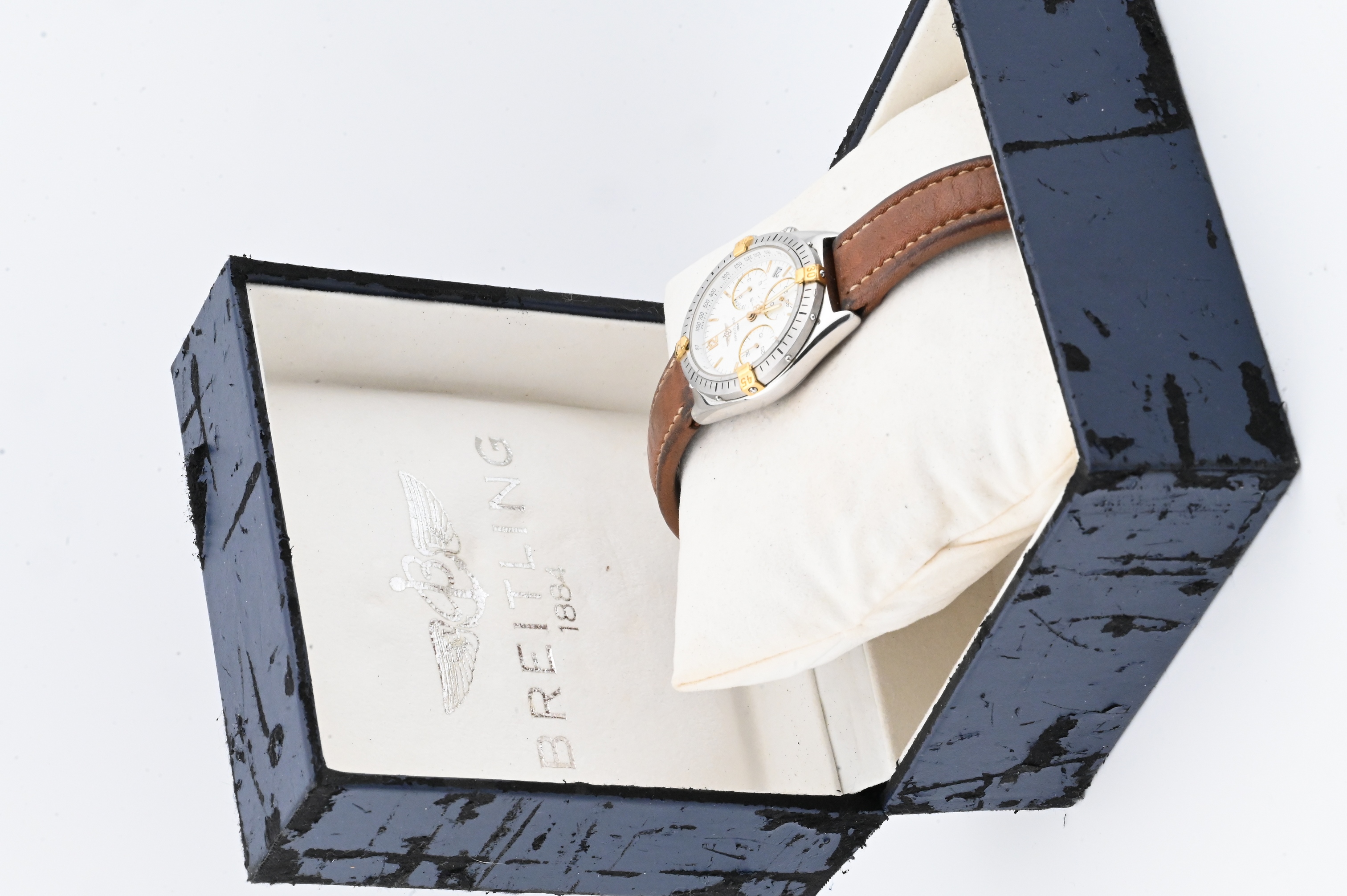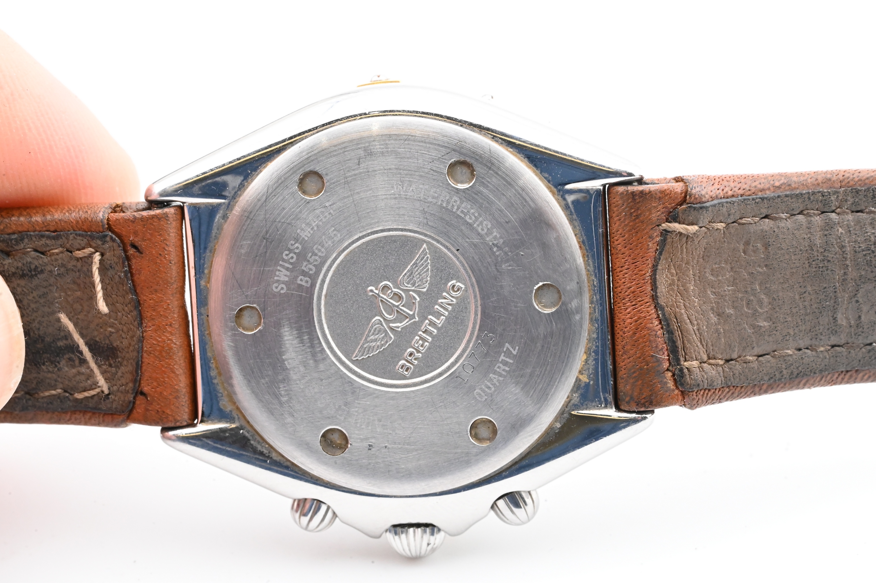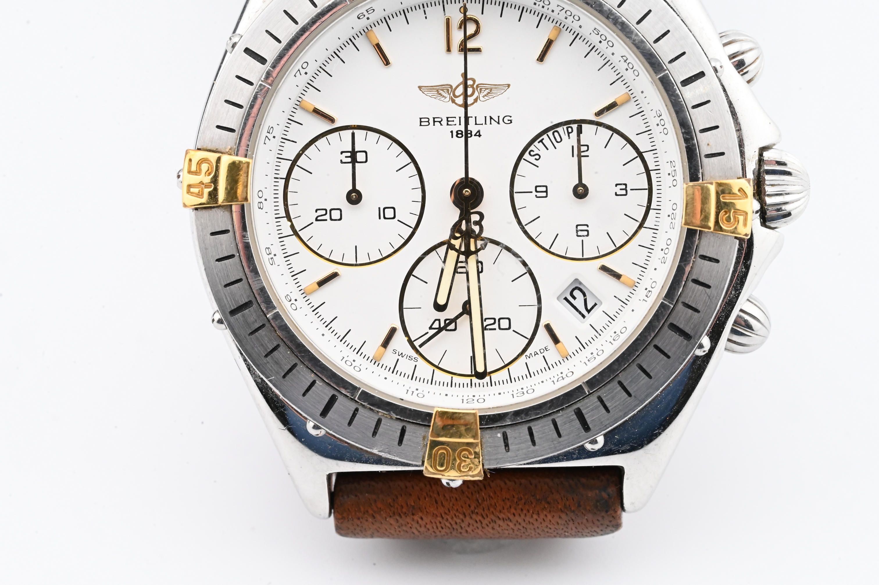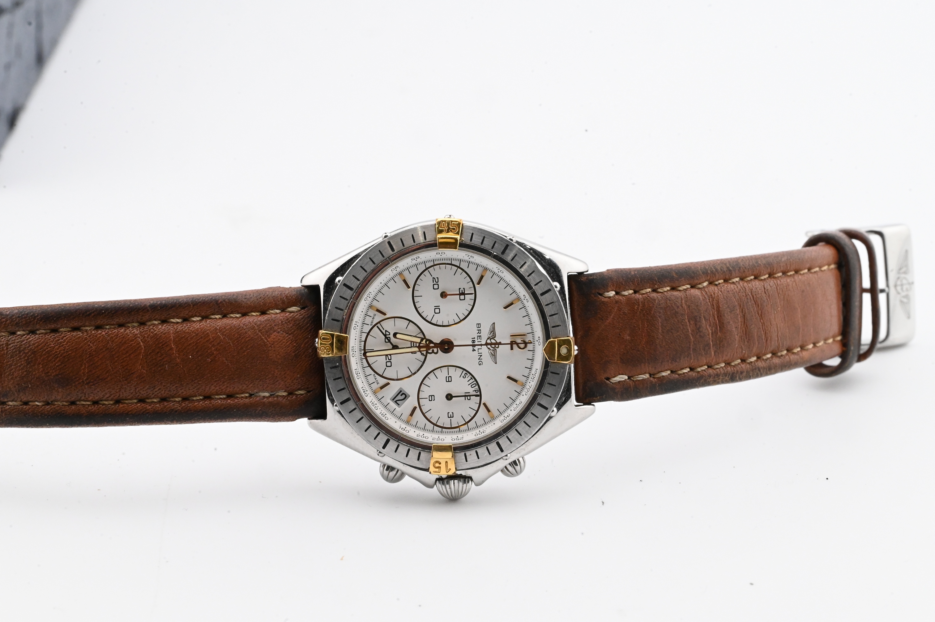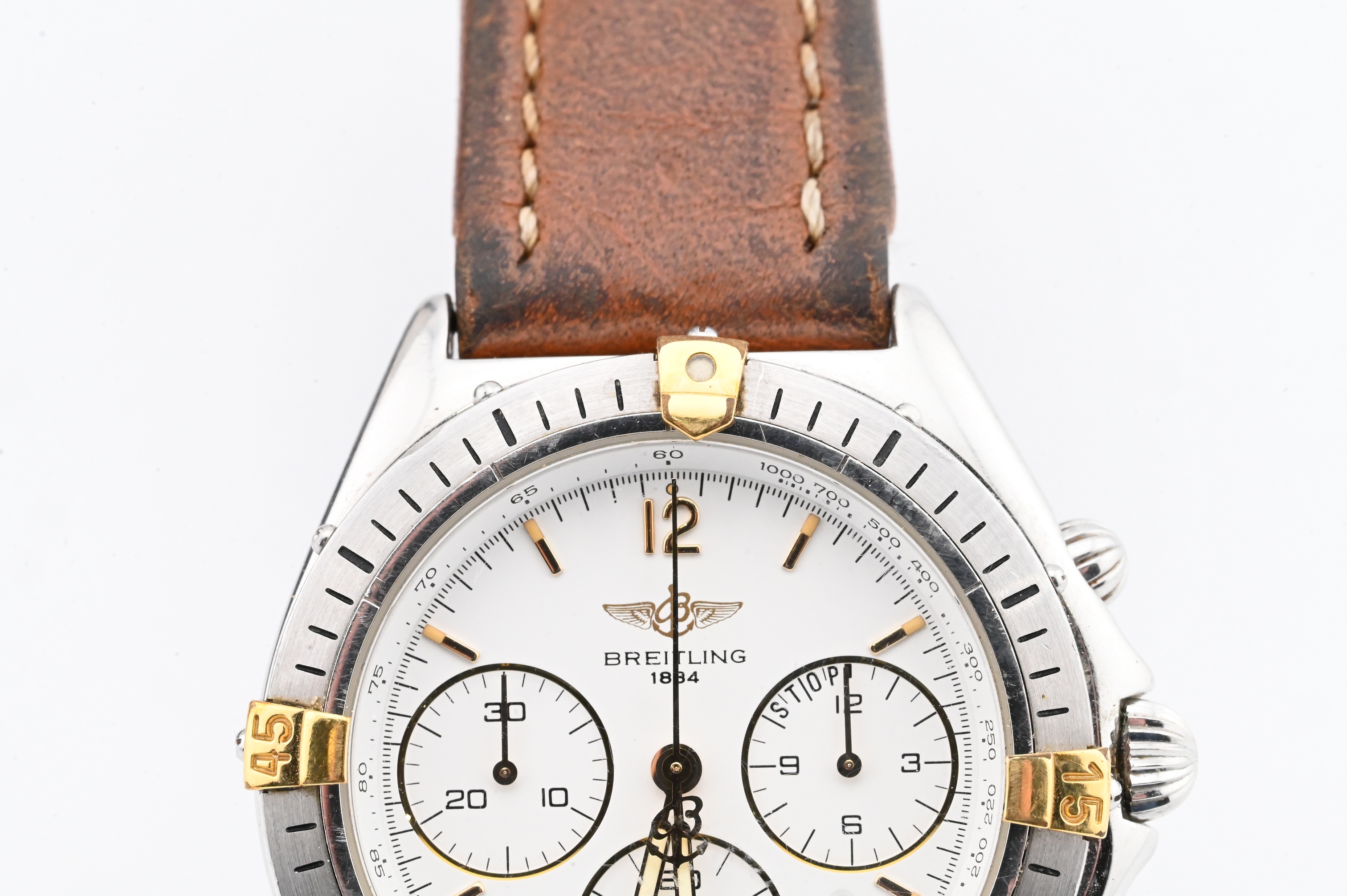 Reference number B55045, quartz chronograph movement with 12-hour and 30-minute registers and constant seconds, white dial with applied gold markers, date aperture at 4 o’clock, rotating bezel with four gold-plated riders, and stainless-steel case fitted with brown leather strap, case back signed Breitling – Swiss Made – Water-Resistant – Quartz, accompanied by original Breitling fitted box