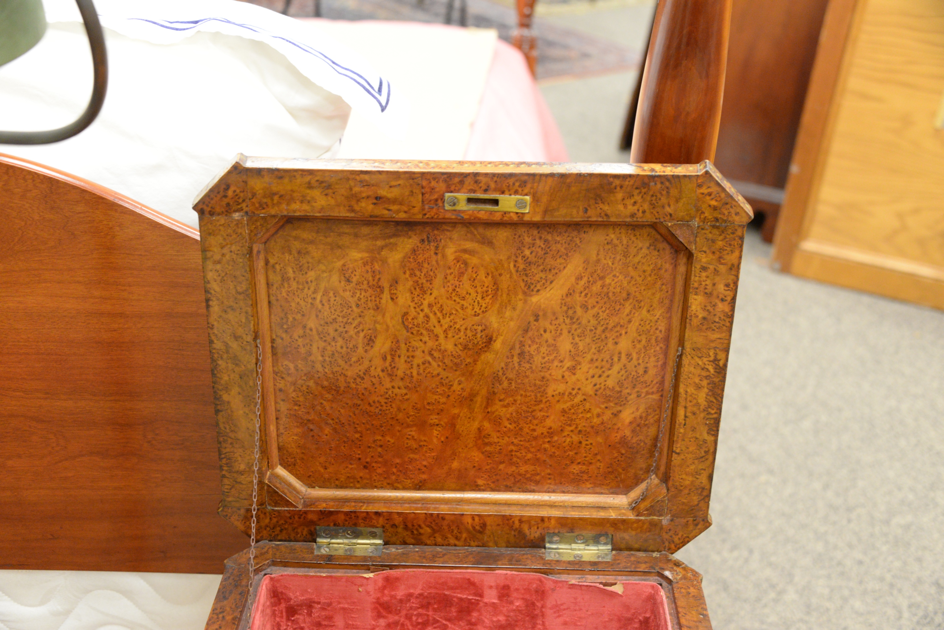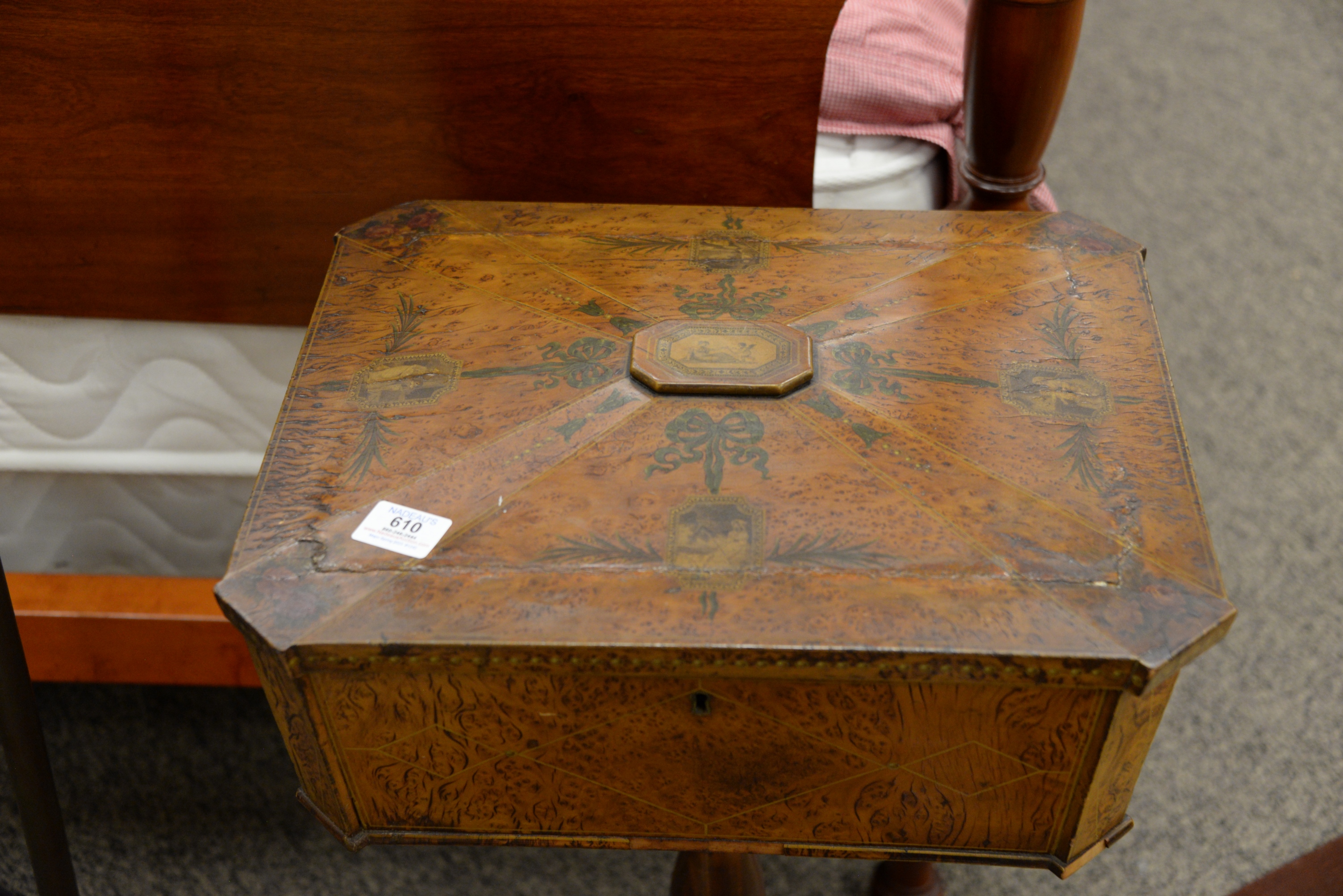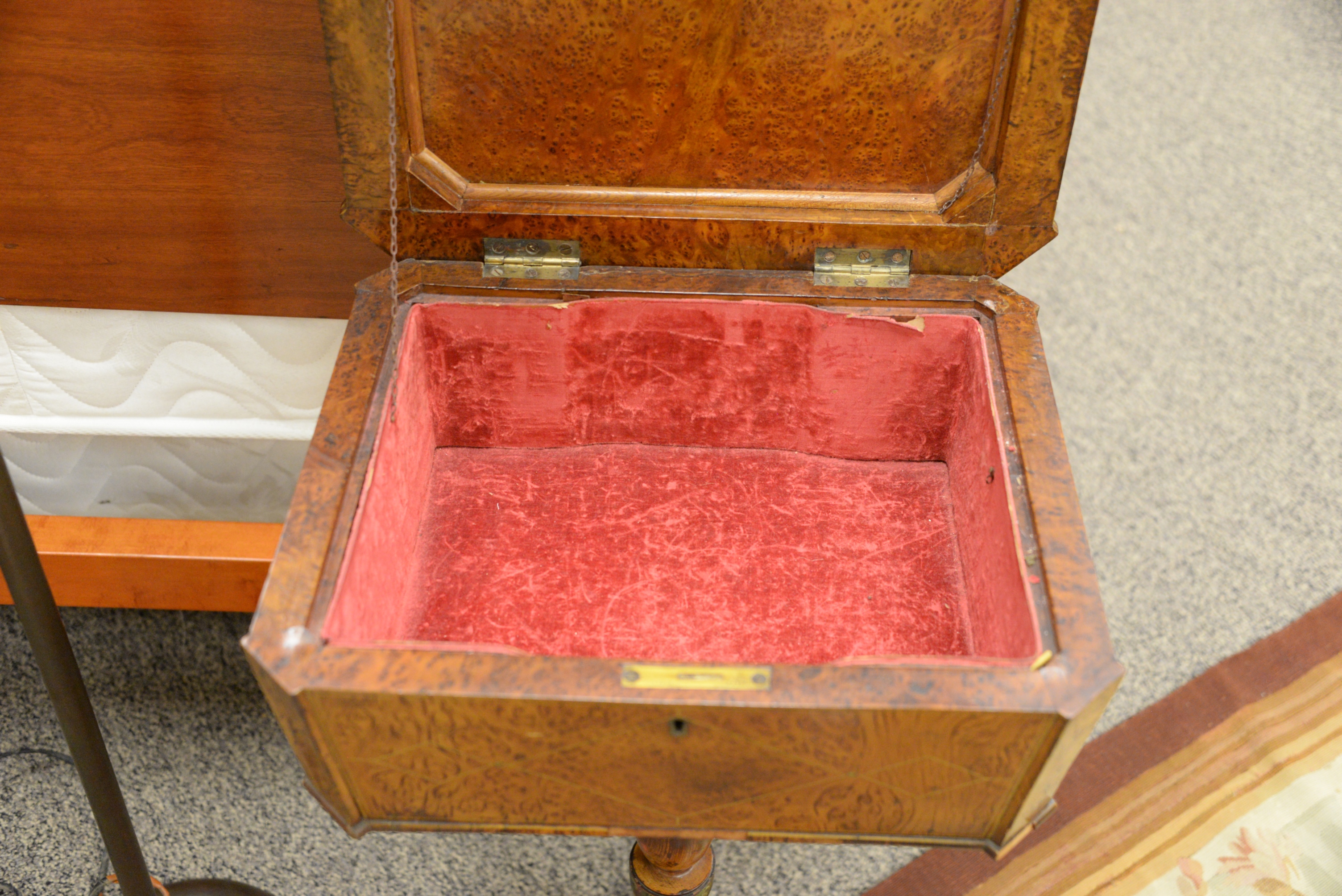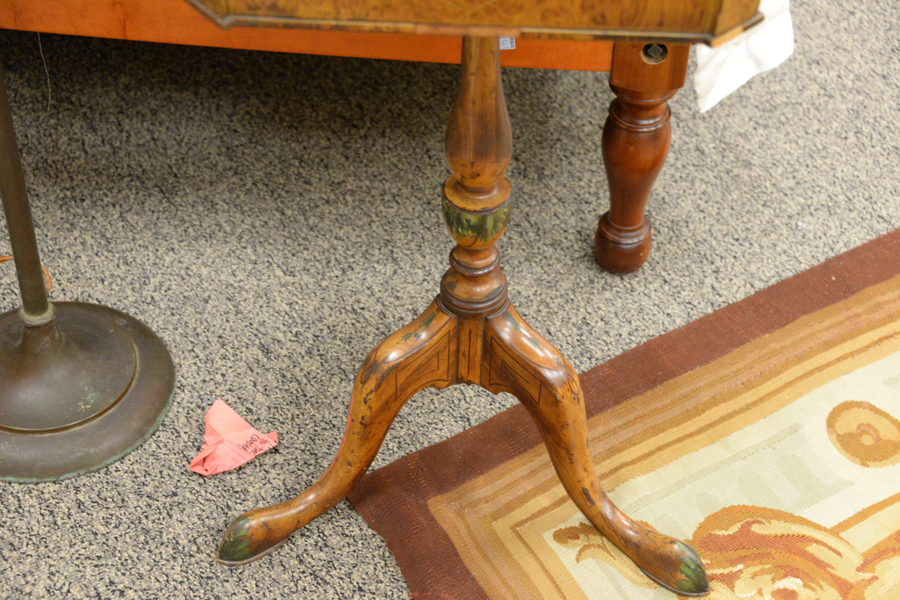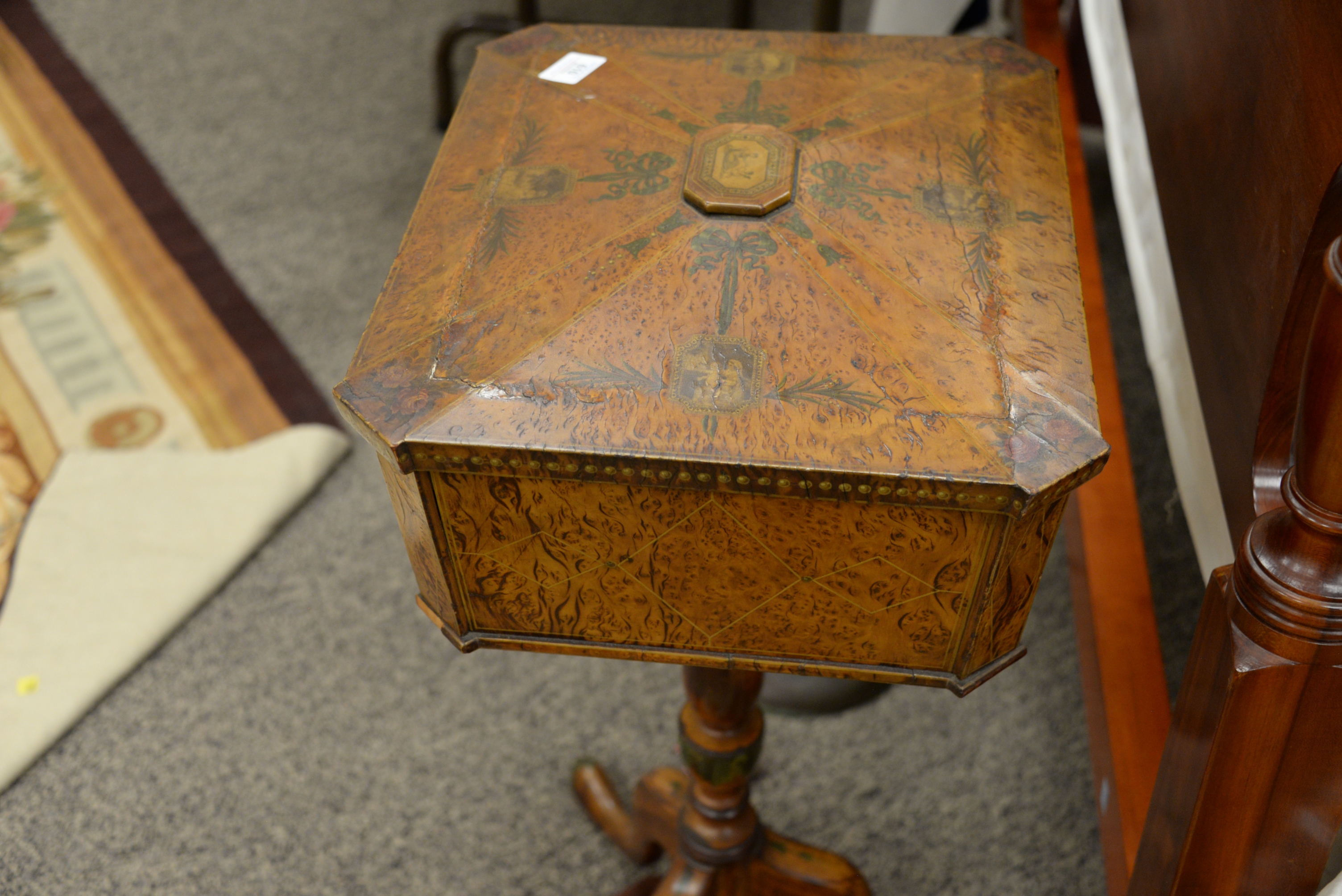 Burlwood Edwardian Work Table, paint decorated having lift top on turned and painted shaft, on tripod base, height 31 inches, top 14″ x 17″.