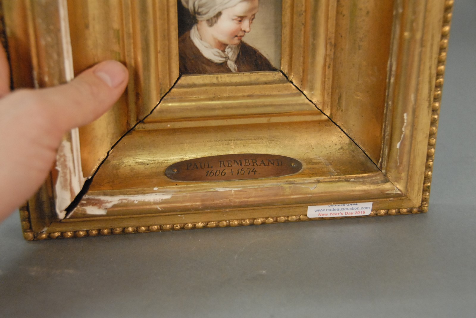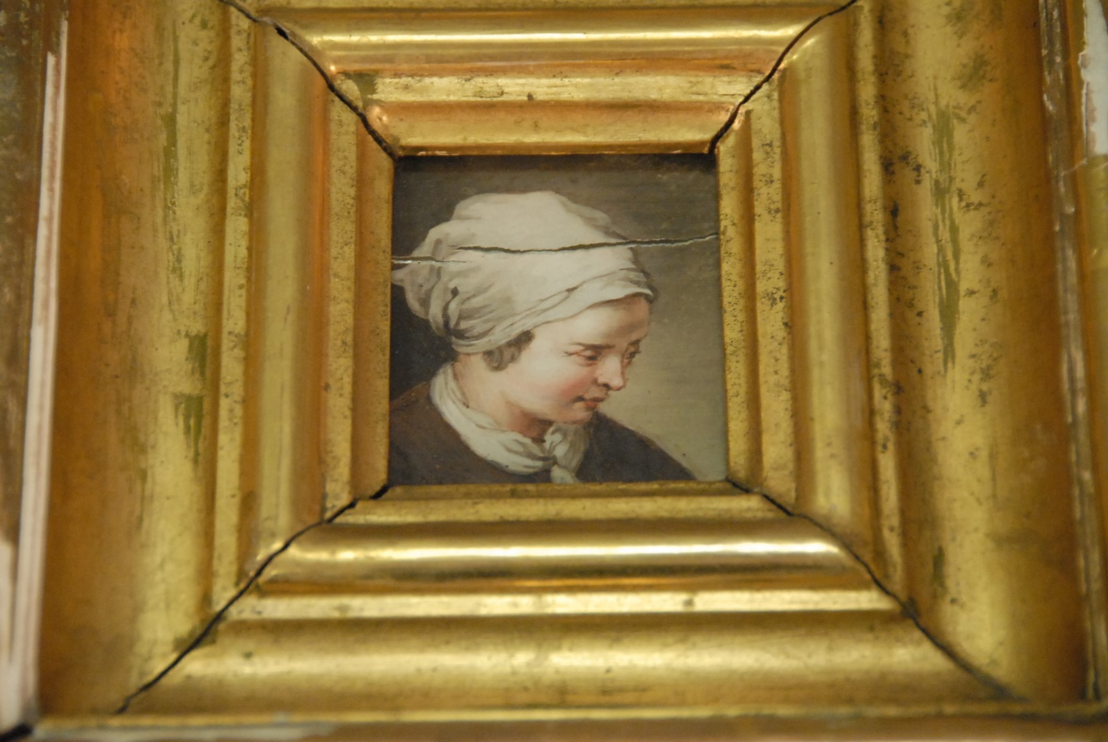 Lot 610: Circle of Rembrandt Van Rijn 1606-1669 BUST OF WOMAN WITH BONNET watercolor on paper 3 1/4 x 3 split in paper