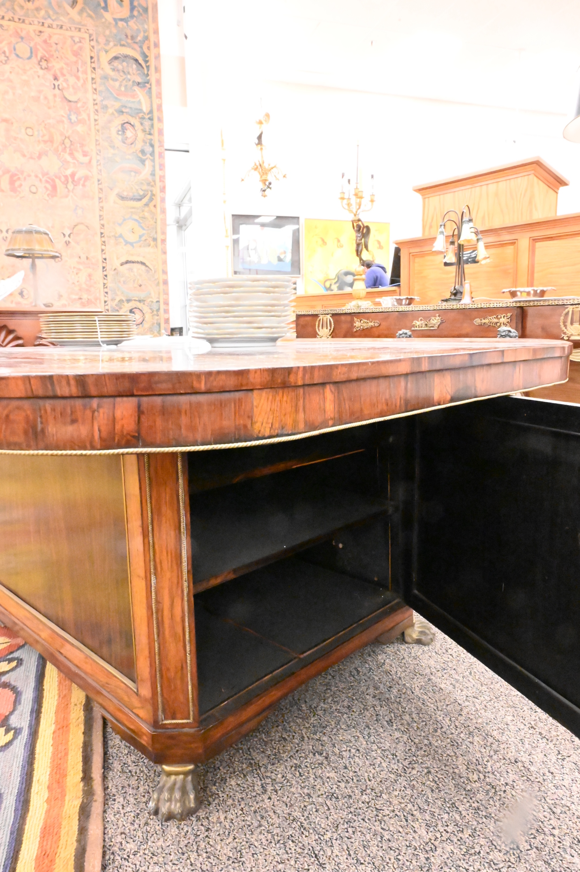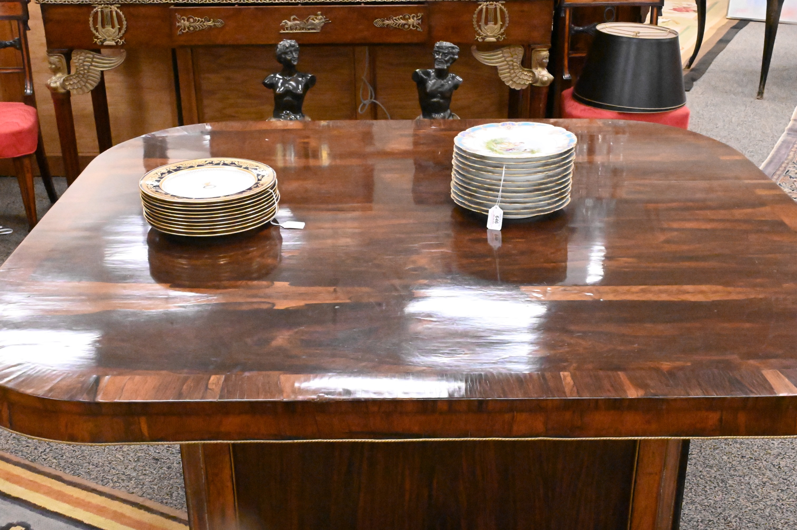 Rosewood Center Table, banded inlaid top with skirt and brass trim, set on large square cabinet base having one door, all set on brass paw feet, height 29 3/4 inches, top 53 1/2″ x 60″.