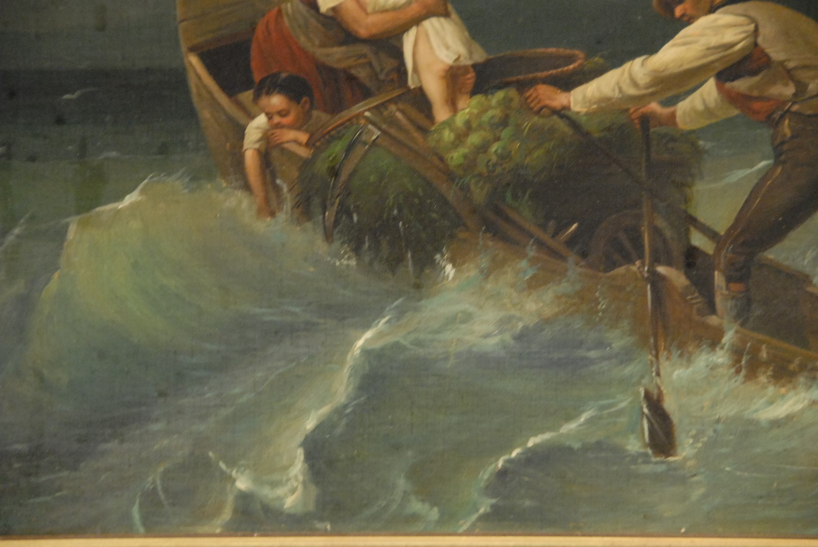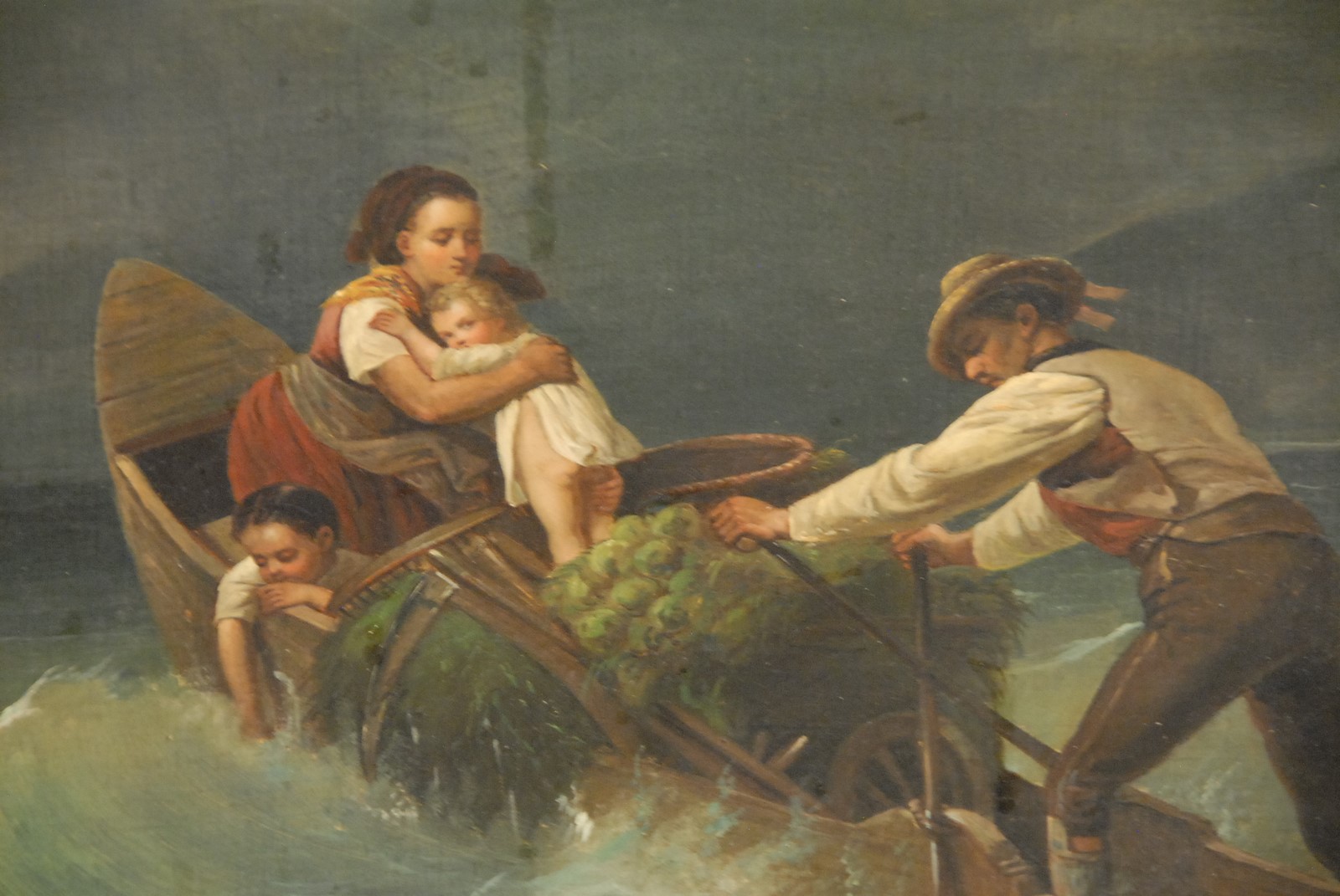 ROWING THE HARVEST with family across rough waters oil on canvas unsigned 19th century 14 1/2 x 17 3/4