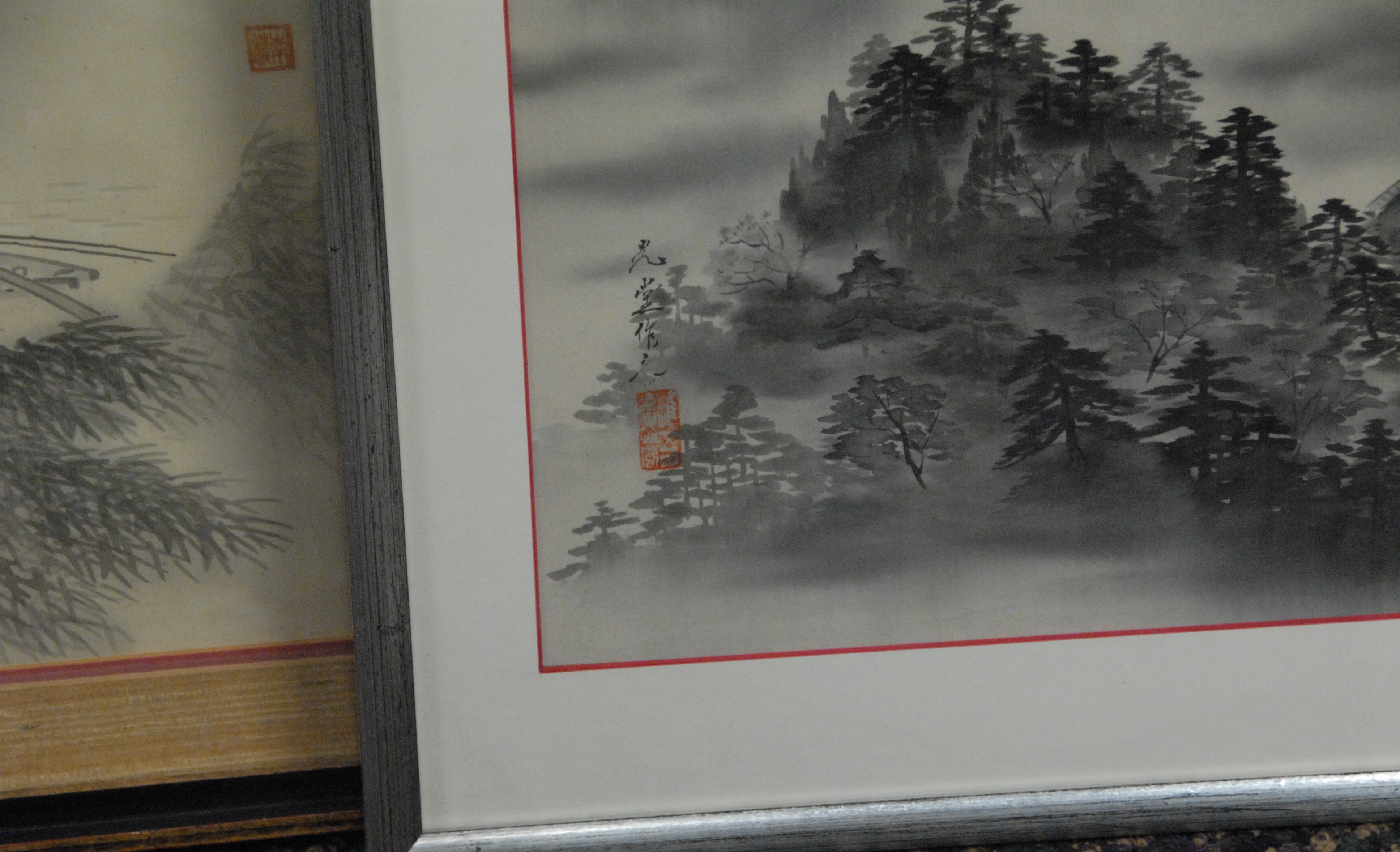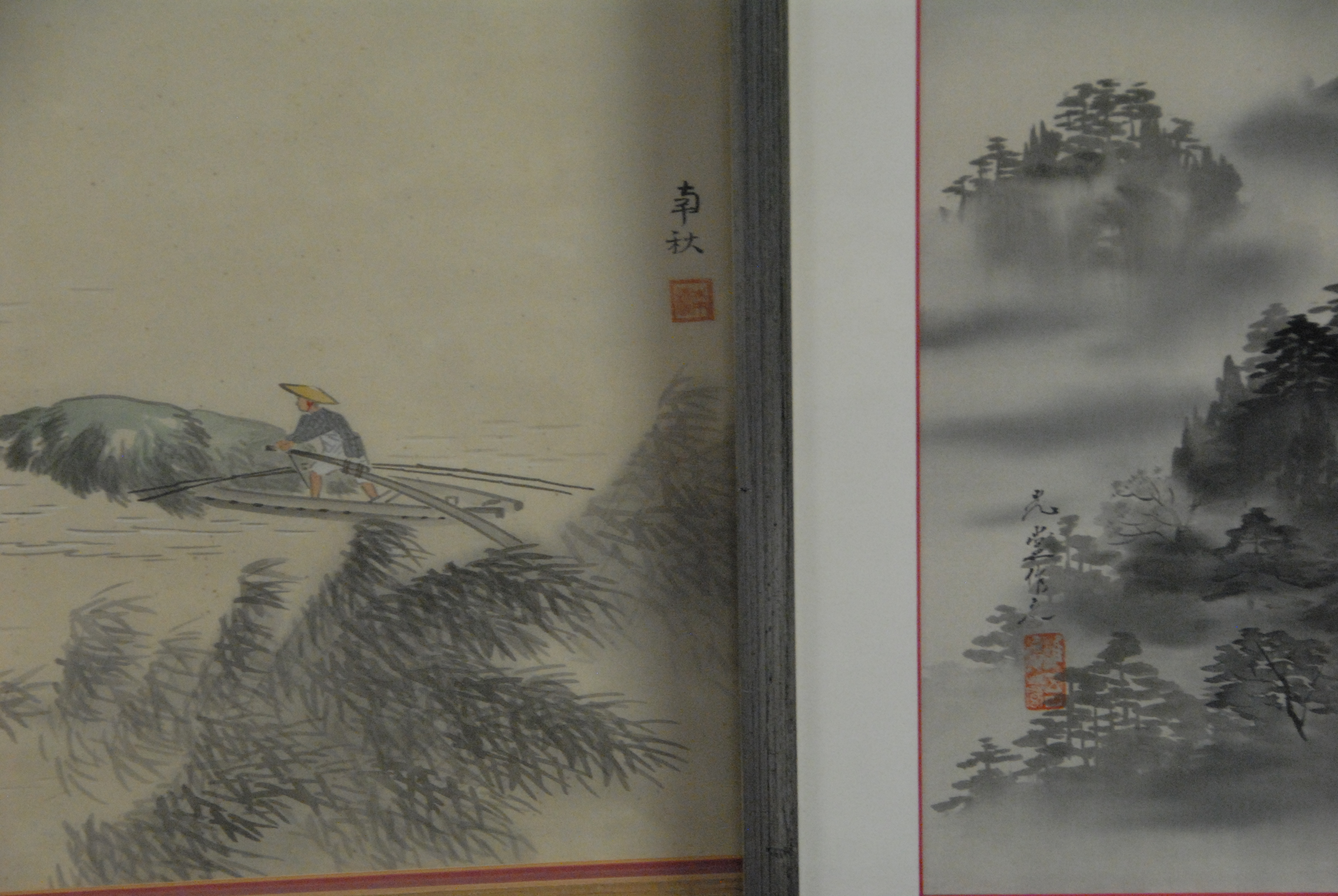 Two Oriental watercolors on silk: Black and white landscape. Two bats at sunrise. 18 x 20