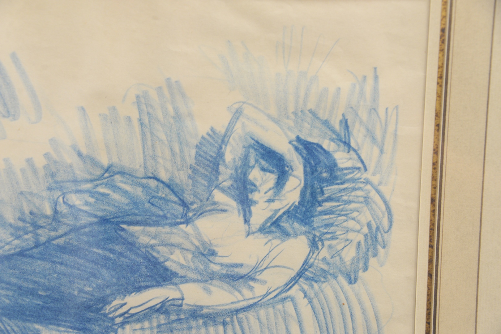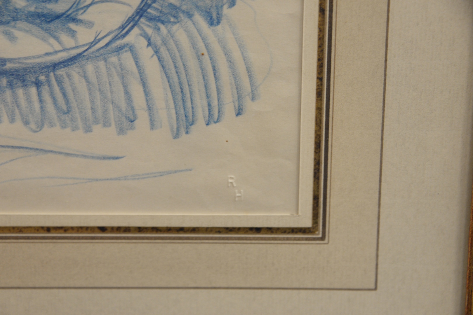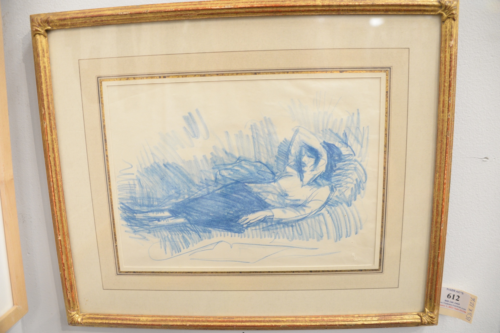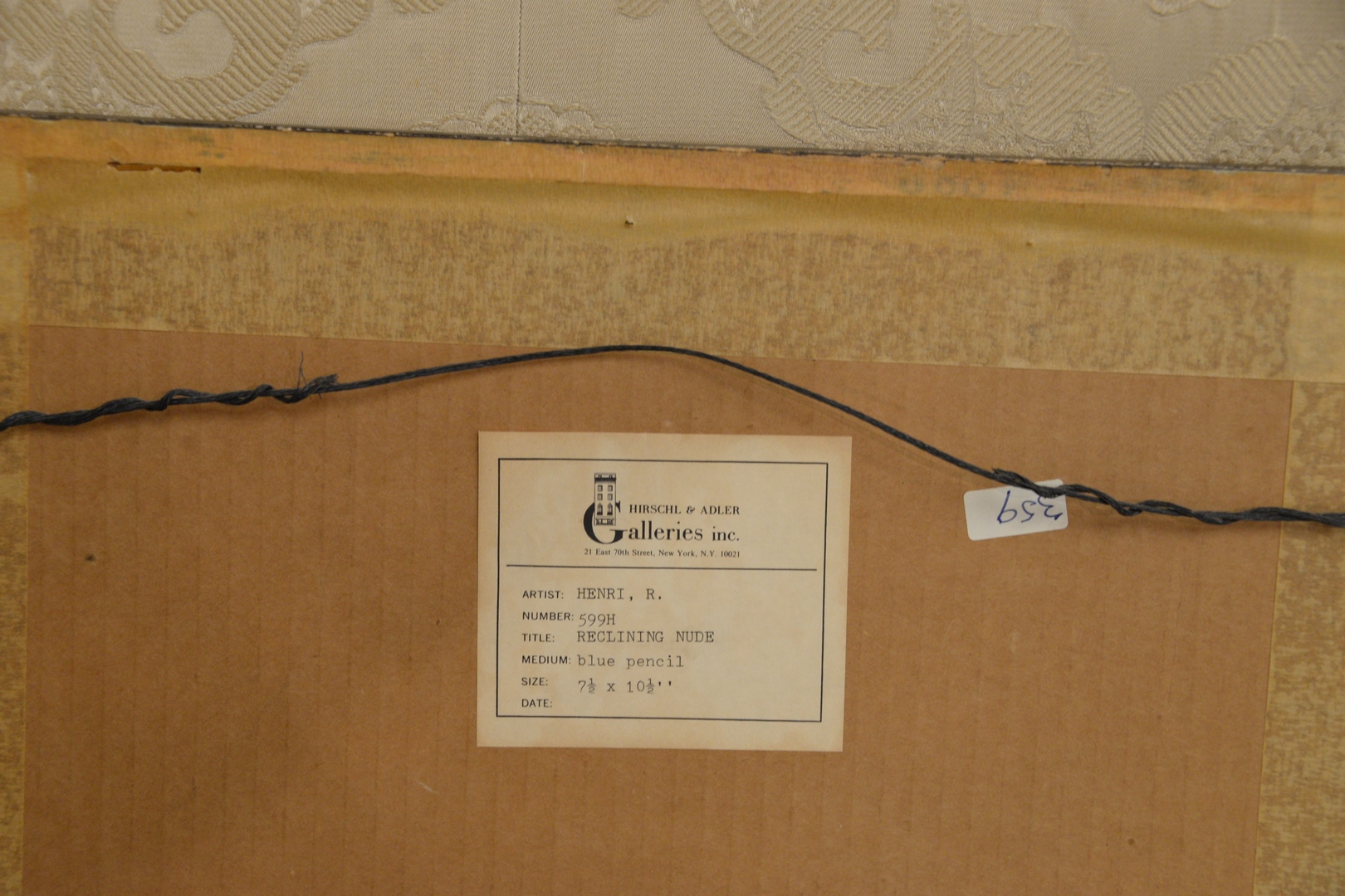 Lot 612: Robert Henri 1865 – 1929 Reclining Nude blue pencil and crayon on paper embossed R.H. lower right Hirschl & Adler Galleries, New Y…