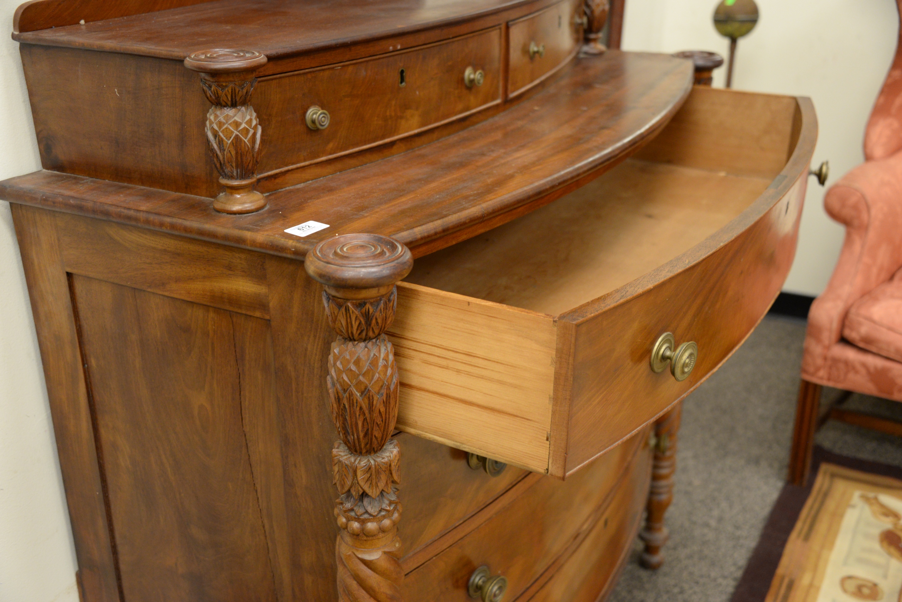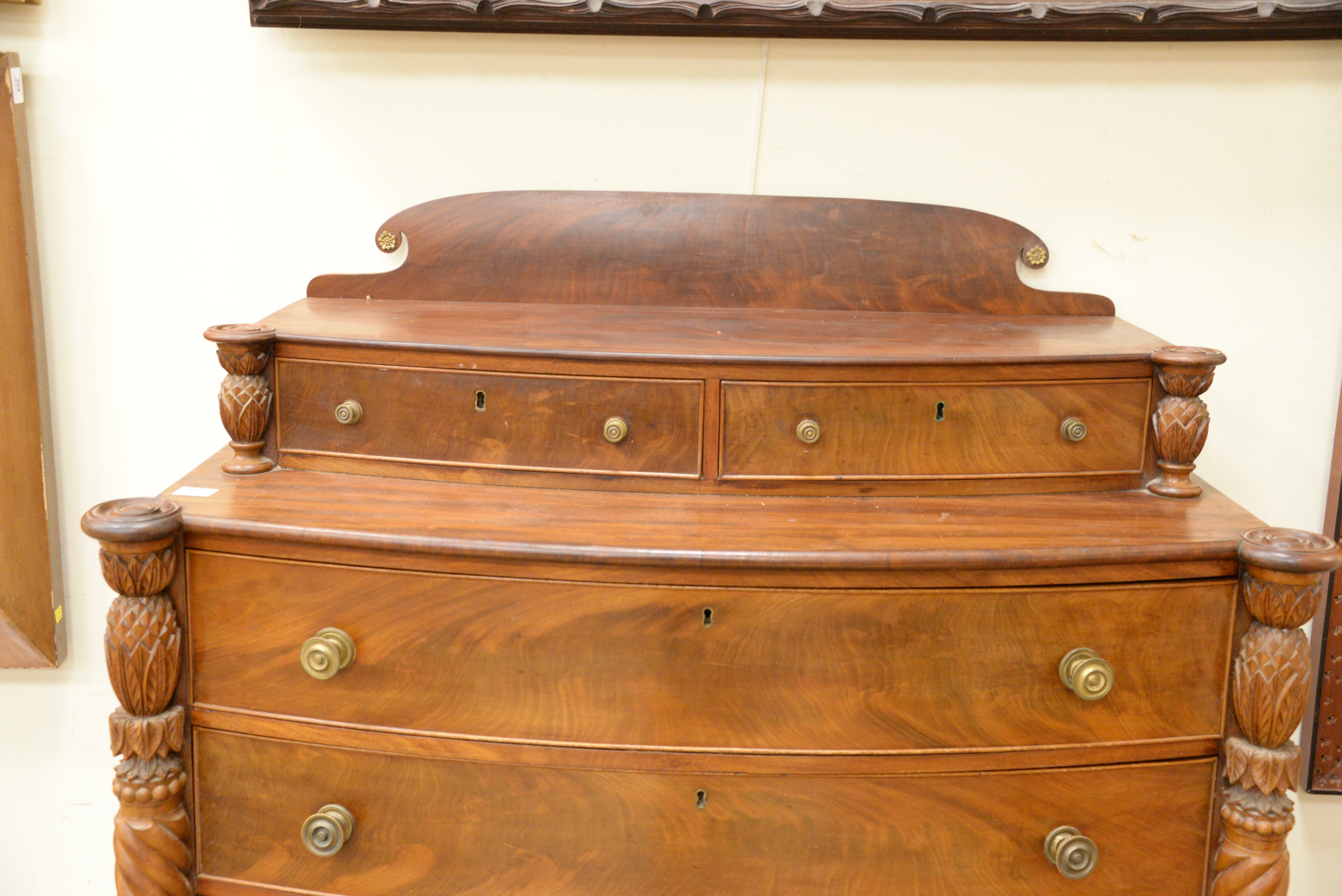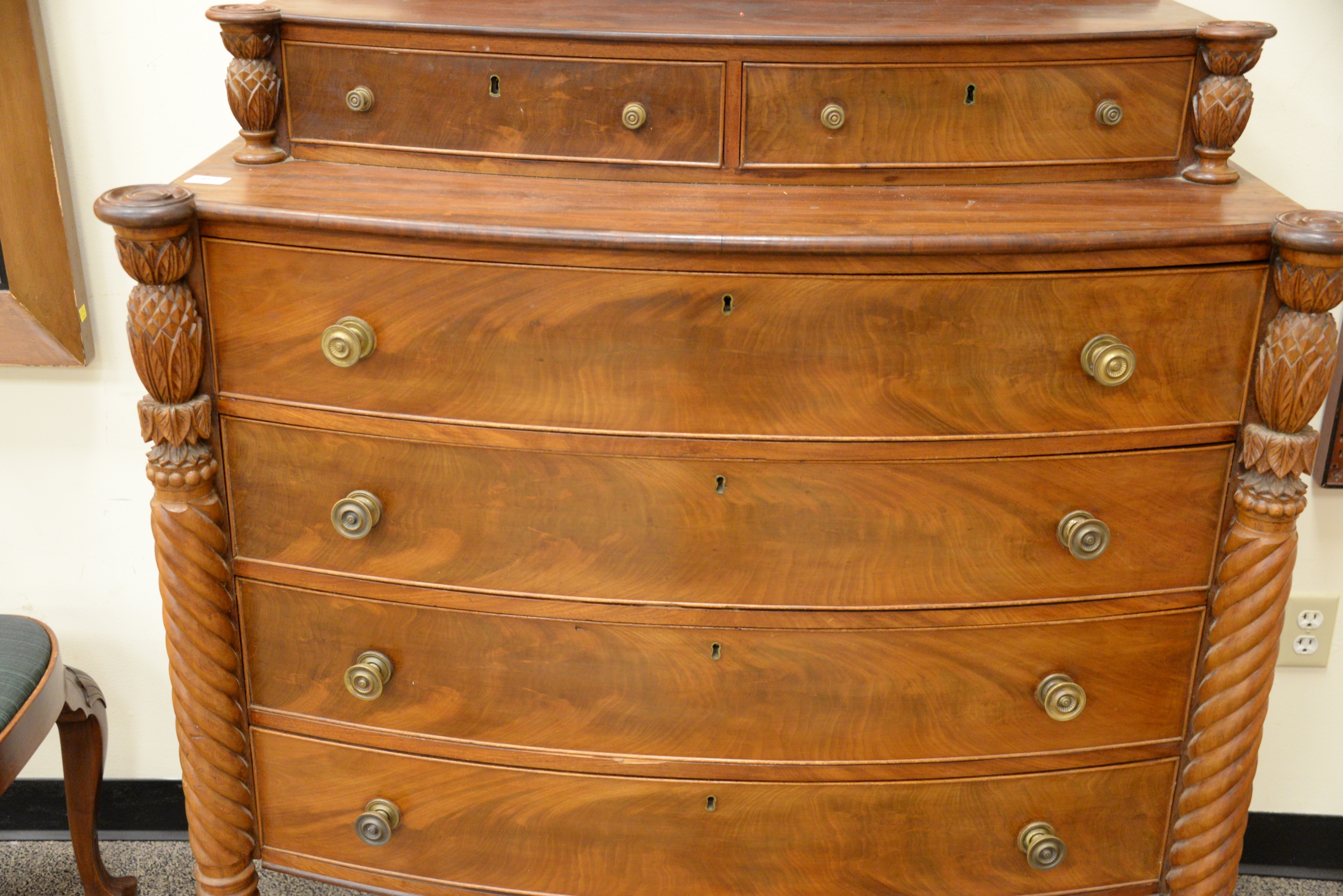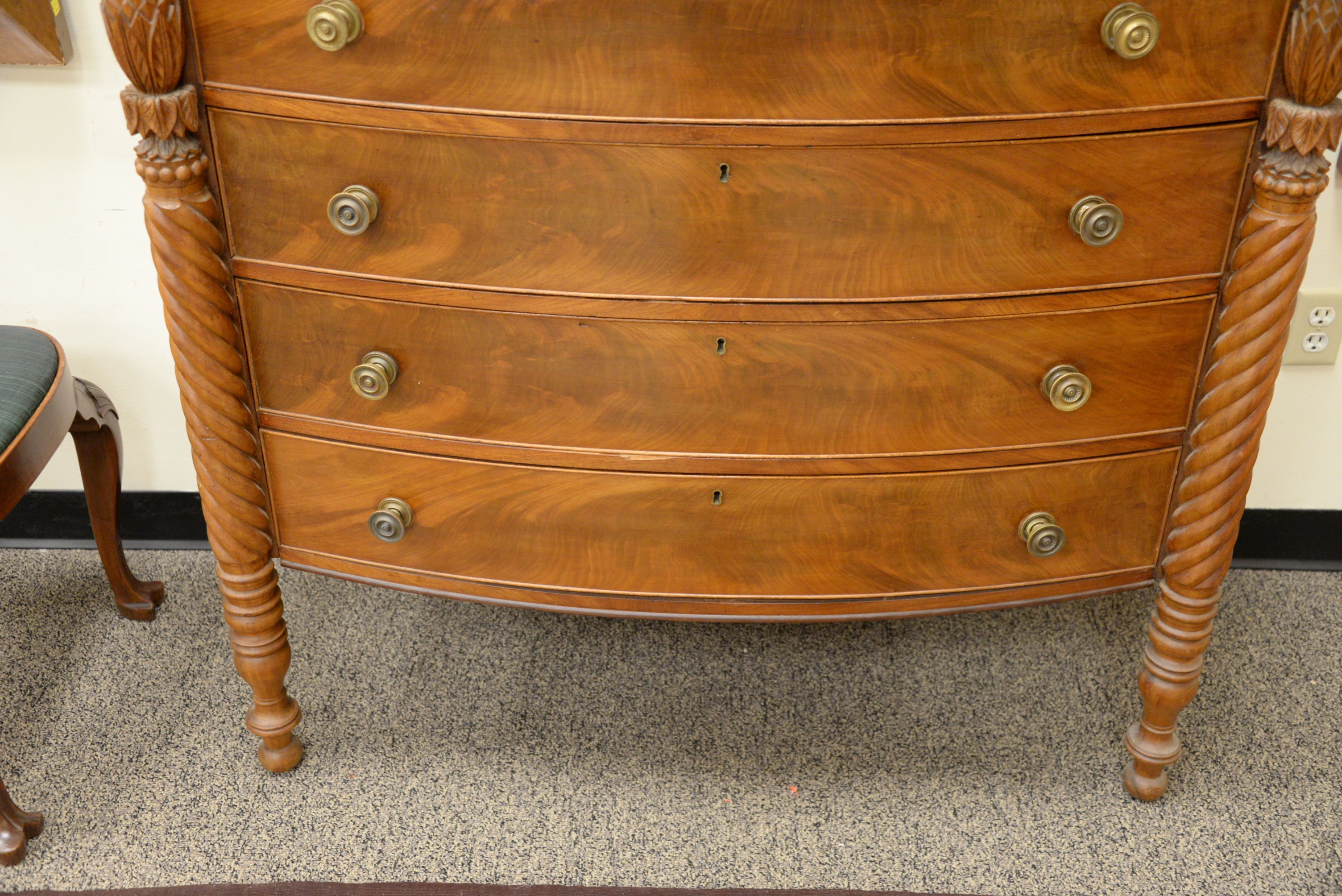 Sheraton Mahogany Bowed Front Chest, top tire having two bowed drawers set over four bowed drawers, flanked by pineapple and leaf carvings over spiral and turned legs, probably Massachusetts, circa 1830, height 53 inches, width 43 inches, depth 18 inches.