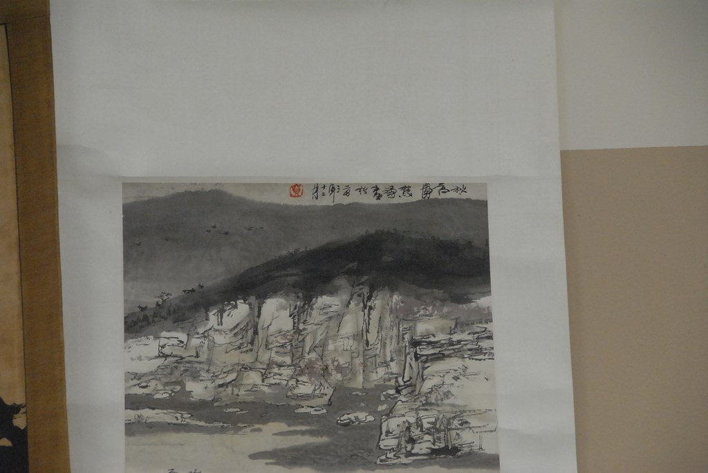 Lot 612: Two Oriental scrolls: One of characters. 37 x 19 One of landscape. 13 1/2 x 13 1/2