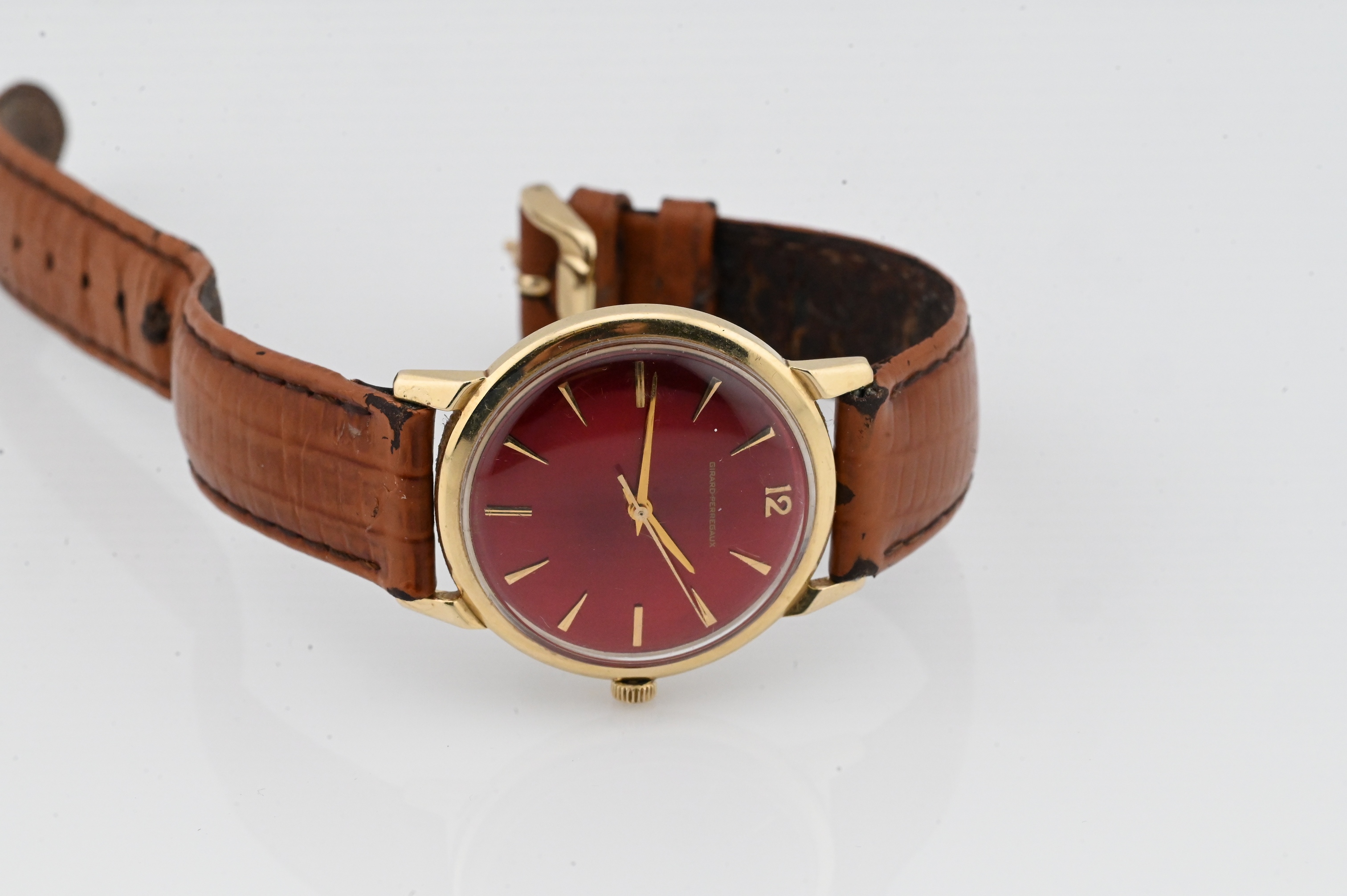 red sunburst dial with applied gold baton markers and Arabic 12, gold dauphine hands, gold case with downturned lugs; strap replaced, manual-wind