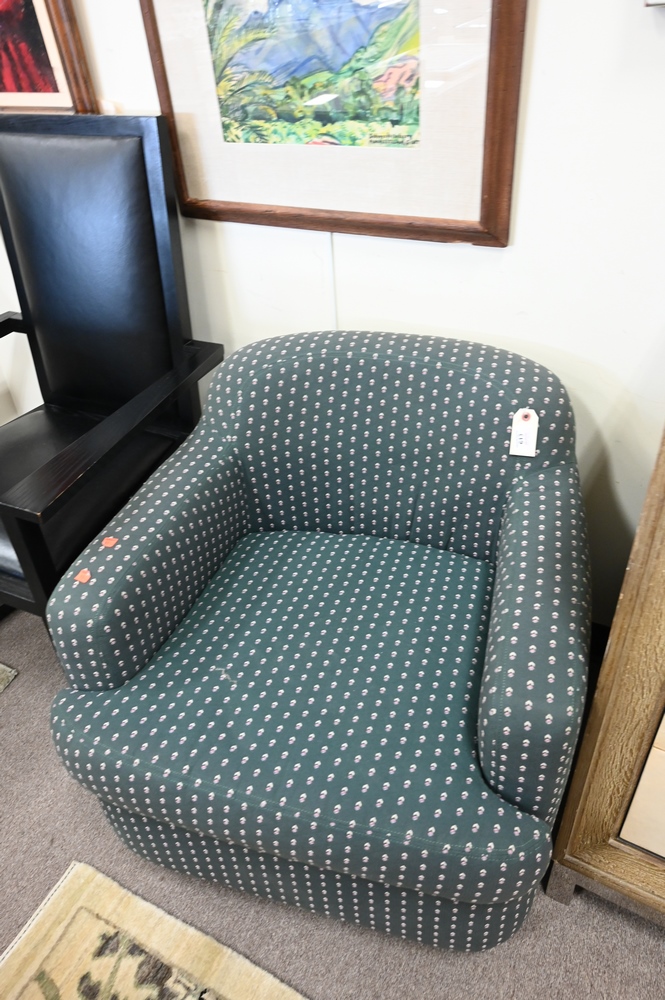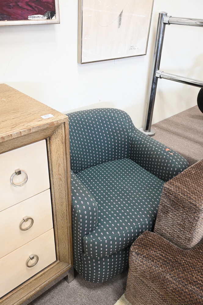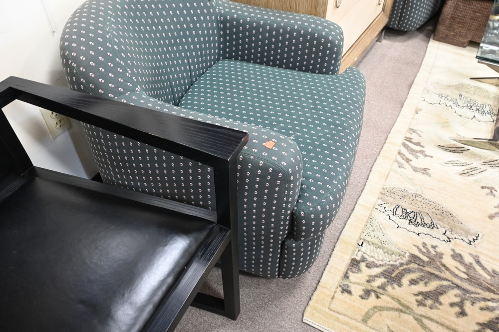 Lot 613: Pair of Vladimir Kagan for Preview Swivel Armchairs, having upholstery designed by Vladimir Kagan and Manufactured by Preview, height 26.5 inches, width 28 inches.