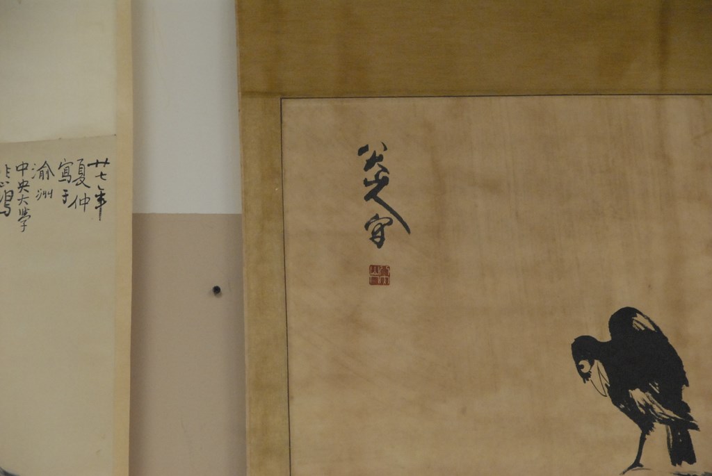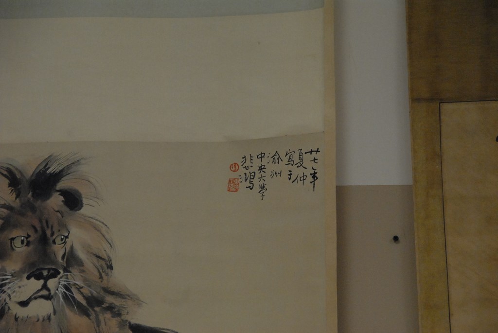 Lot 613: Two Oriental scrolls: Black and white watercolor on paper of bird on branch. 29 x 26 1/2 Watercolor on paper of lion. 27 x 27