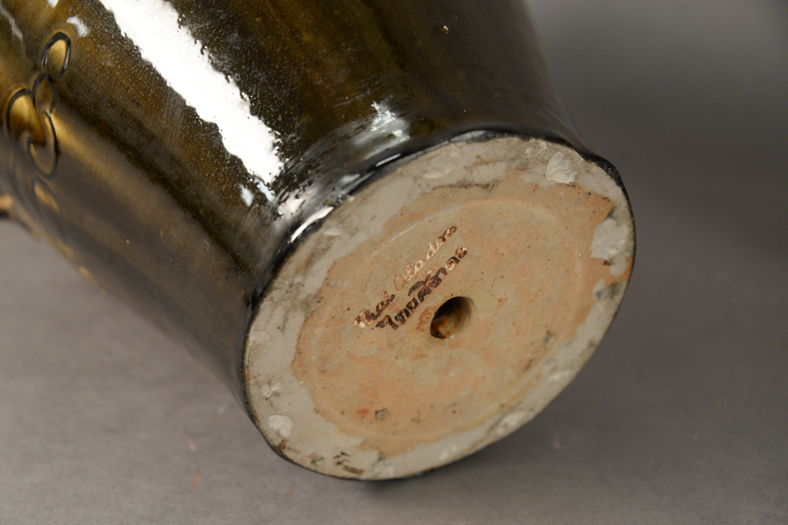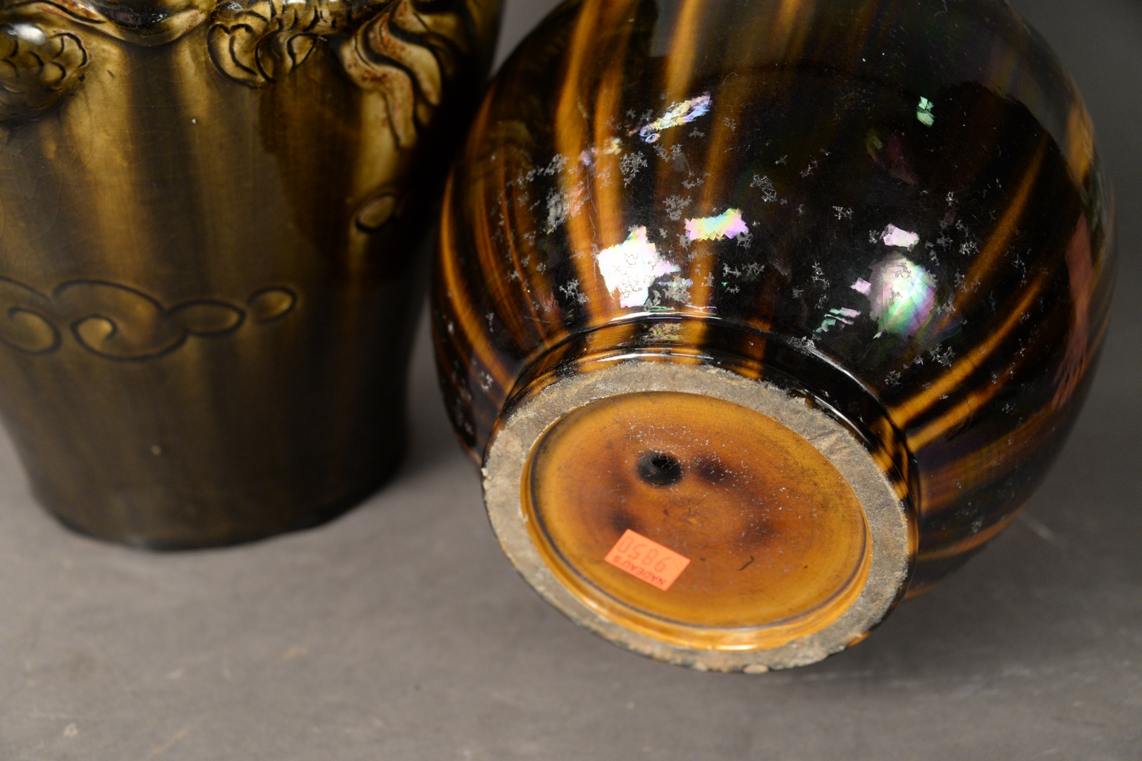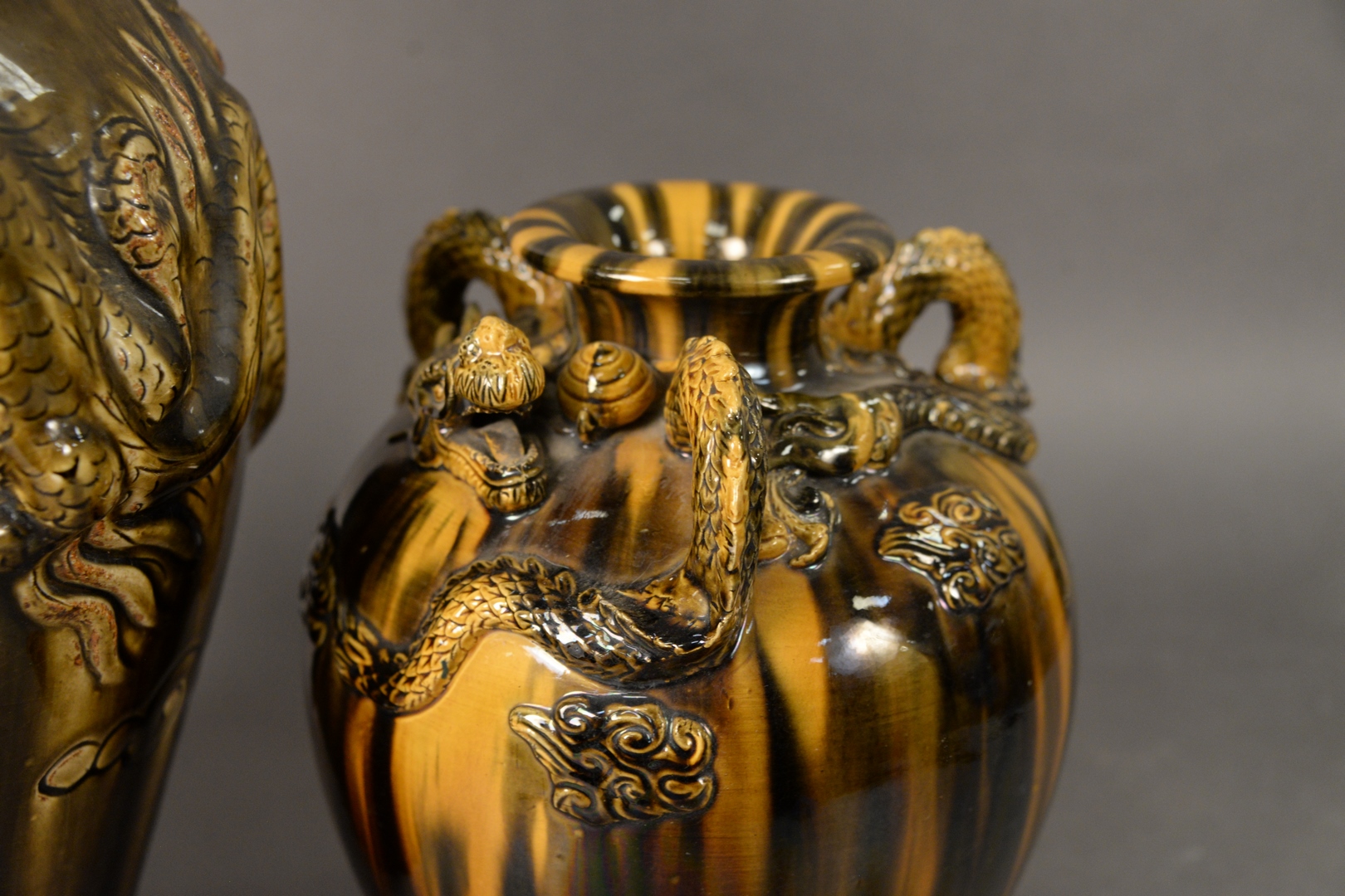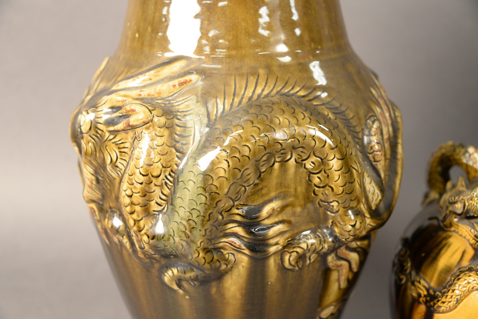 Lot 614: Two Chinese Porcelain Yellow and Brown Glazed Vases to include a globular vase having dragon form handles along with a large drille…