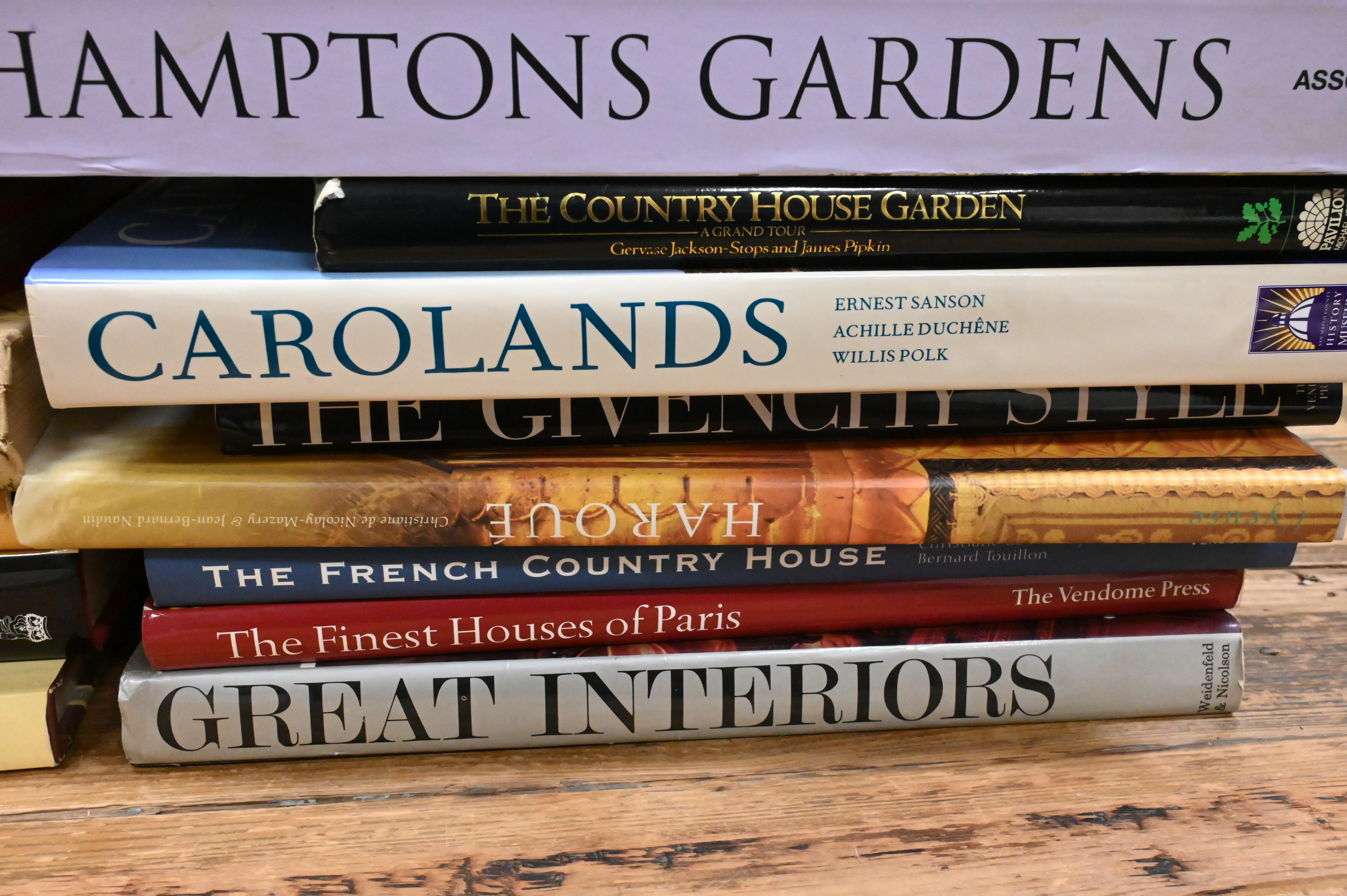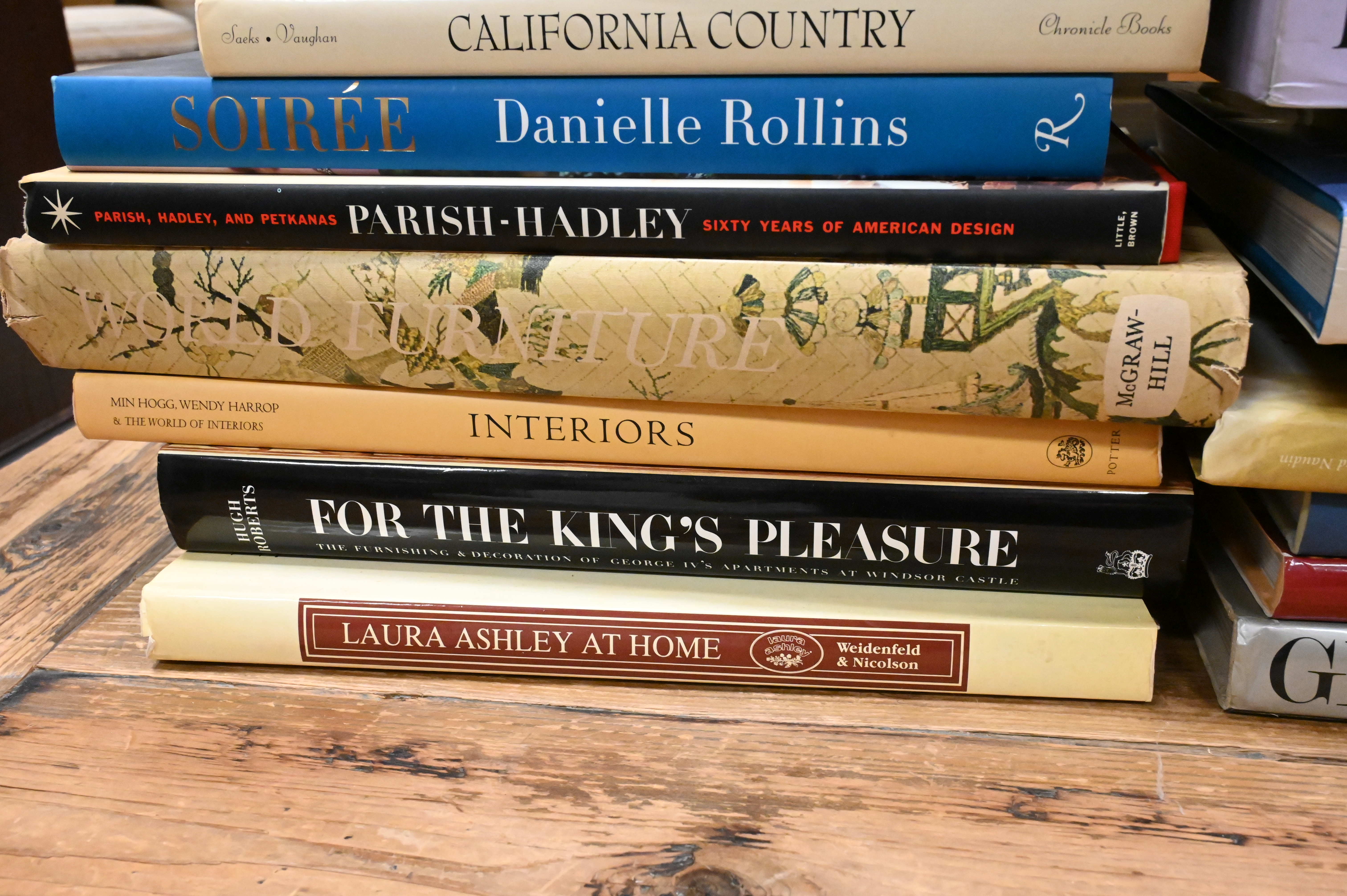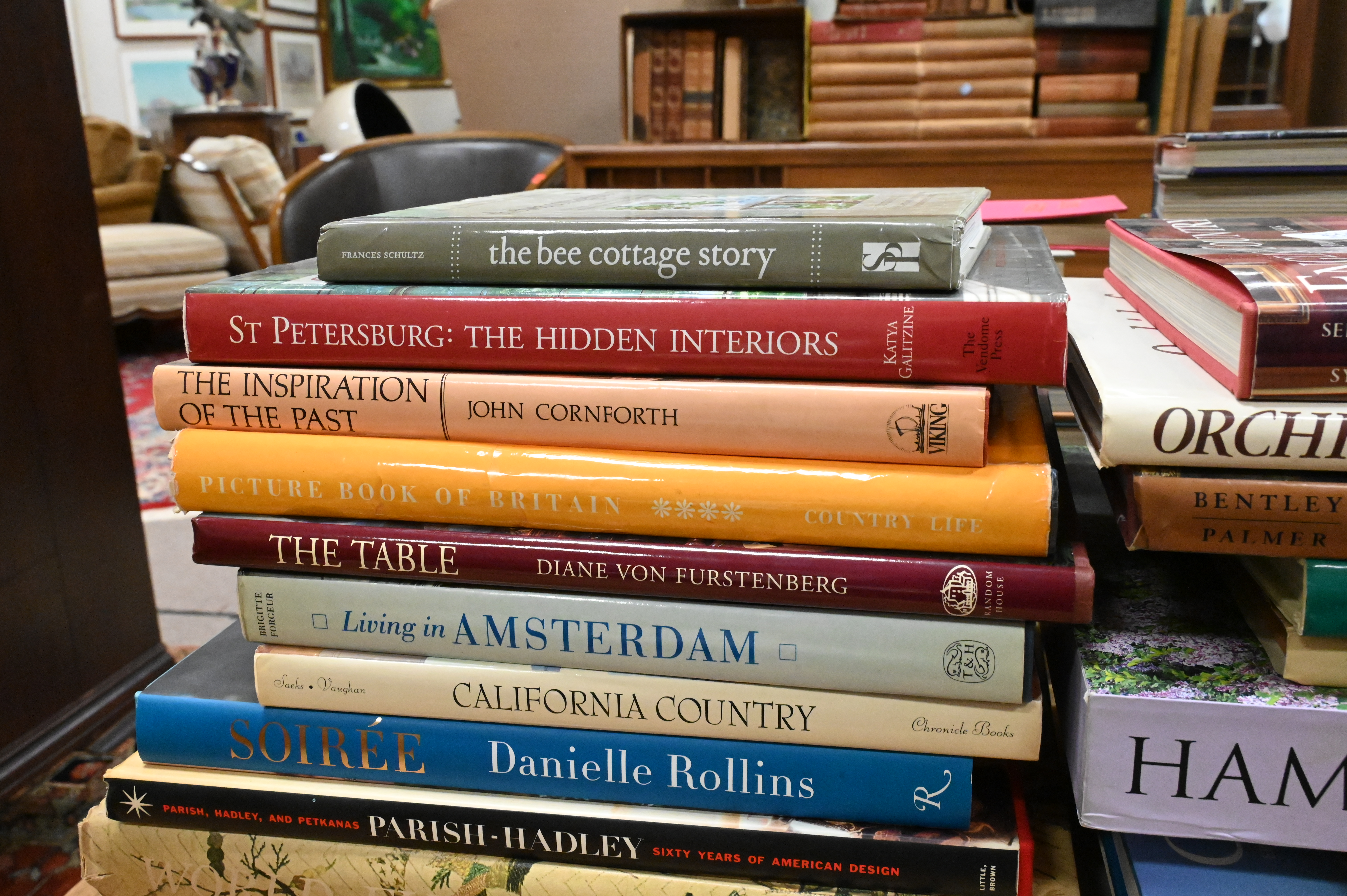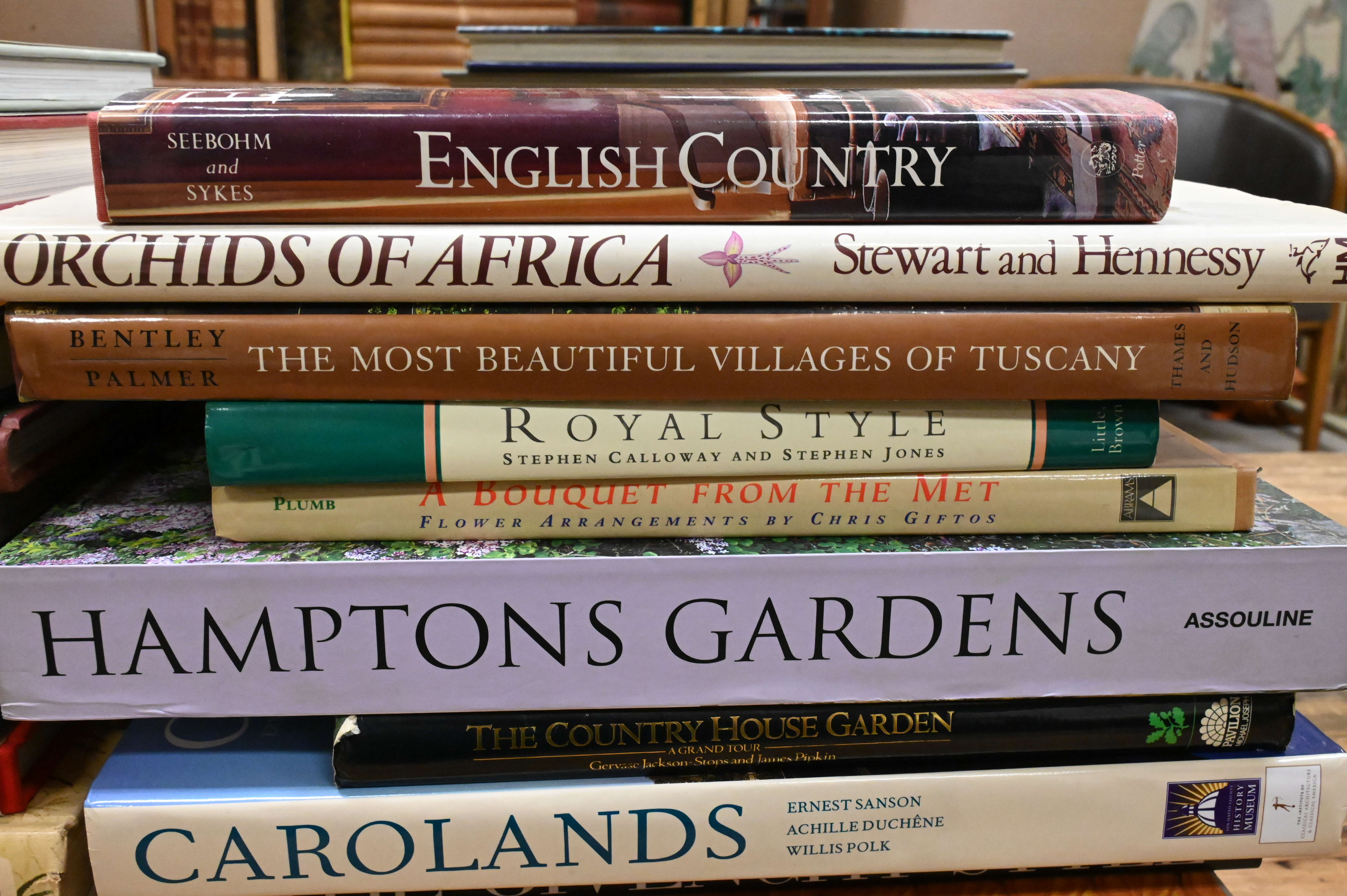 Including Orchids of Africa; Bentley Palmer, The Most Beautiful Villages of Tuscany; Stephen Calloway and Stephen Jones, Royal Style; English Country; Chris Giftos, A Bouquet from the Met; Assouline, Hamptons Gardens; The Country House Garden; Carolands; The Givenchy Style; The French Country House; The Finest Houses of Paris; Great Interiors; Frances Schultz, The Bee Cottage Story; Katya Galitzine, St. Petersburg: The Hidden Interiors; John Cornforth, The Inspiration of the Past; Picture Book of Britain; Diane von Furstenberg, The Table; Living in Amsterdam; California Country; Danielle Rollins, Soirée; Parish-Hadley: Sixty Years of American Design; For the King’s Pleasure; and Laura Ashley at Home.