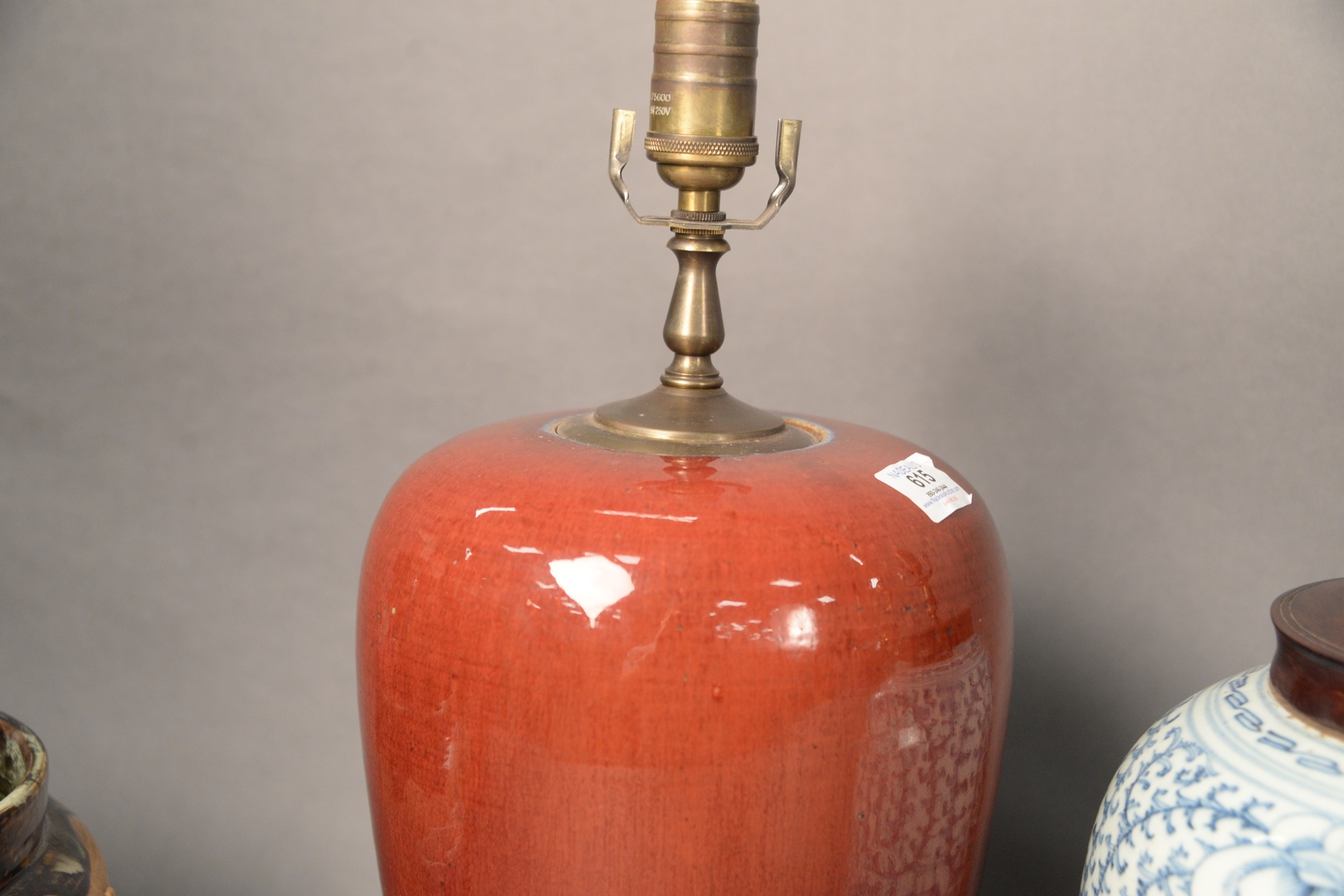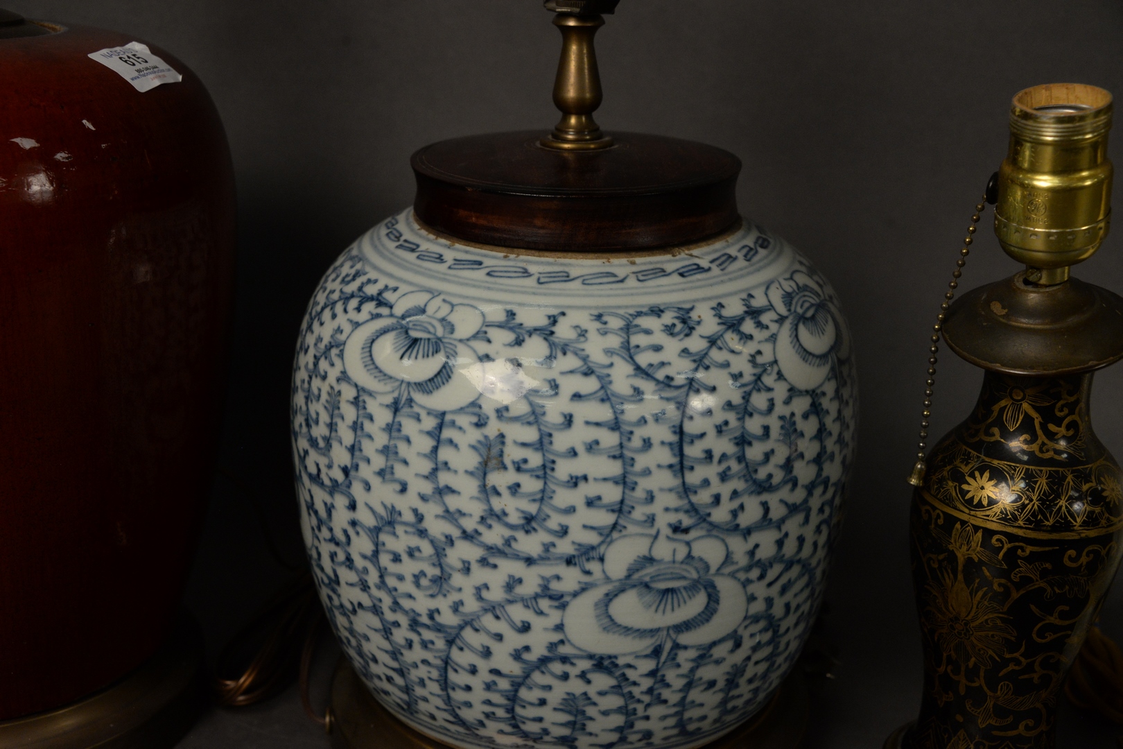 Lot 615: Four Chinese Porcelain Table Lamps each mounted on brass bases, to include one blue and white one oxblood one white glazed with a …