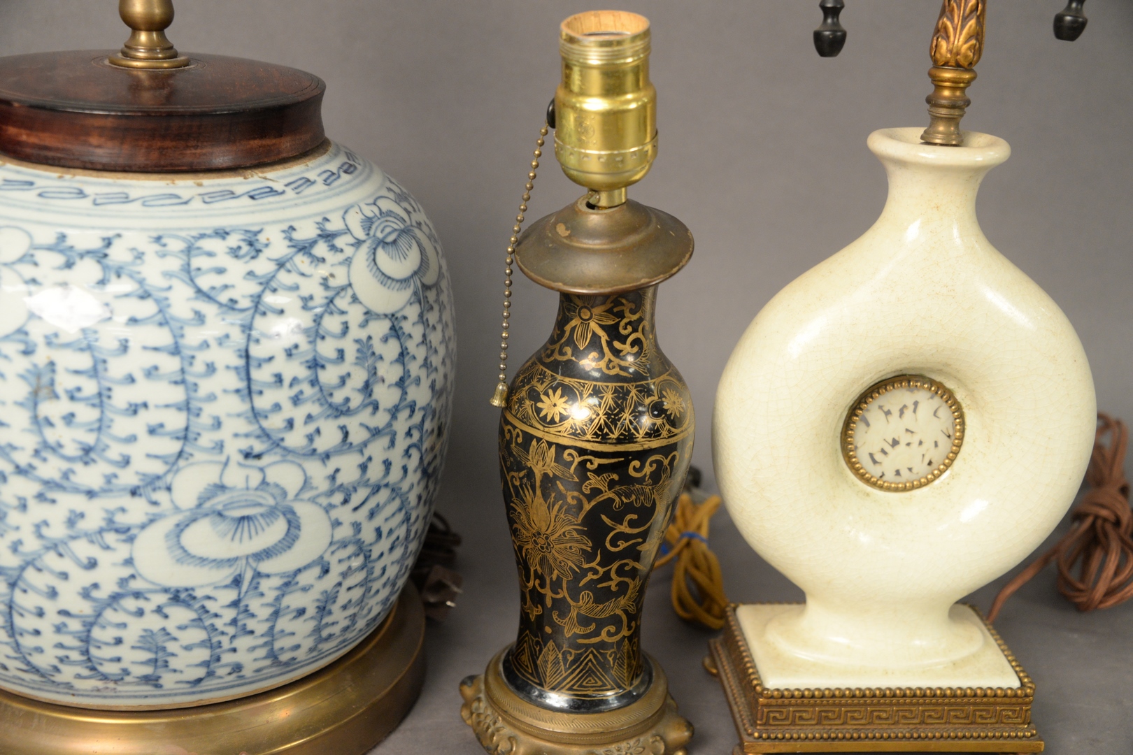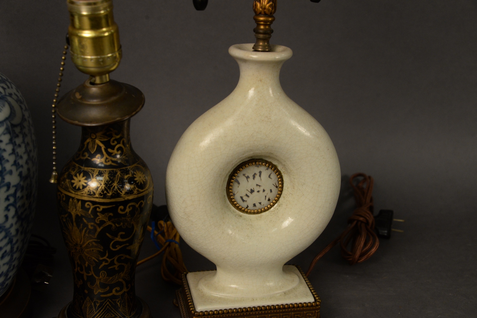 Four Chinese Porcelain Table Lamps each mounted on brass bases, to include one blue and white one oxblood one white glazed with a hardstone center along with one black glazed with gold decoration, tallest height 18 1/2 inches.