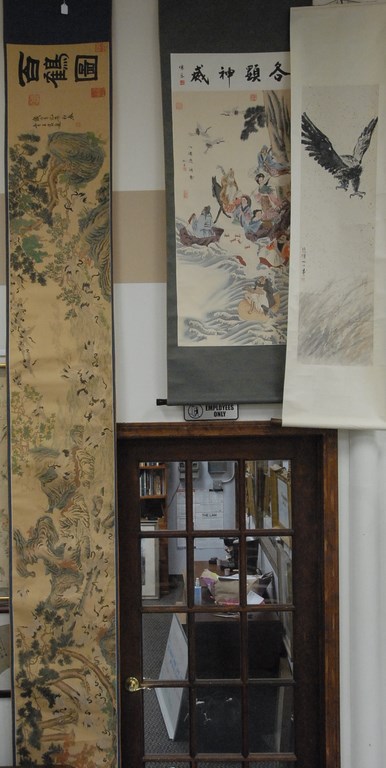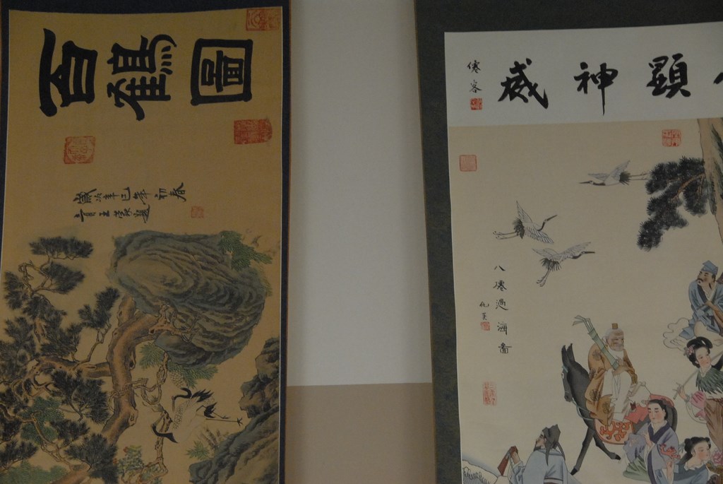 Lot 615: Two Oriental scrolls: Watercolor on paper of figures in wavy water. 50 x 22 Horizontal scroll watercolor on paper of cranes…