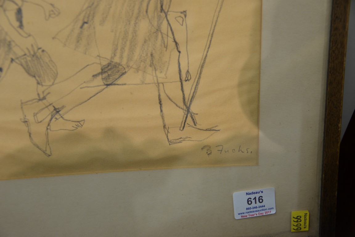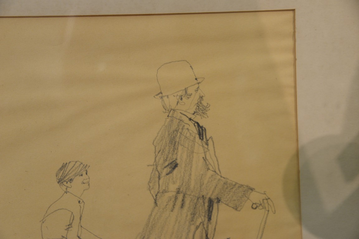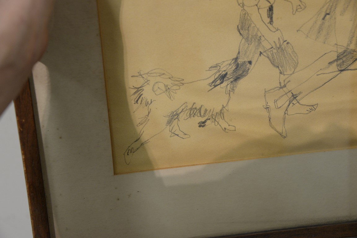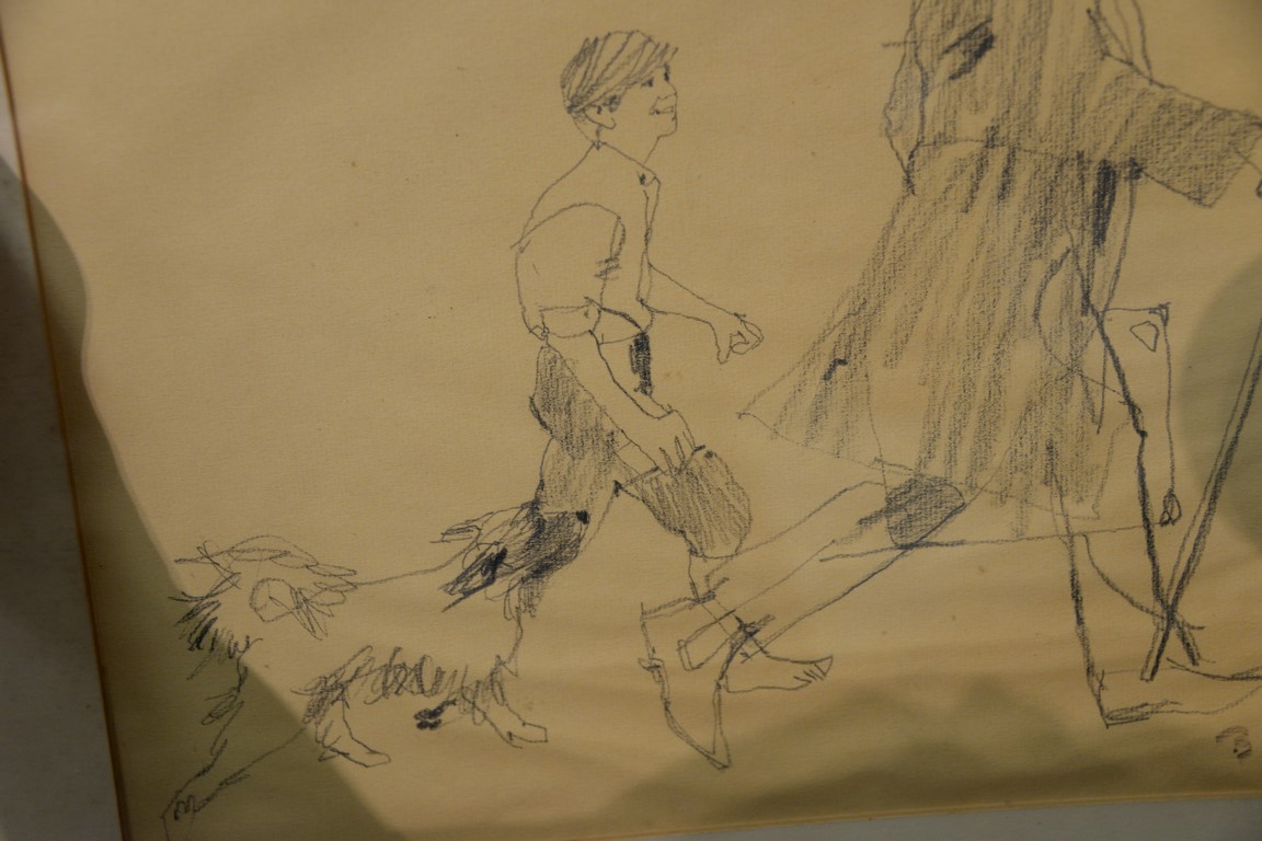 Lot 616: Bernard Fuchs 1932-2009 pencil sketch Boy with Dog Following a Man signed lower right: B. Fuchs sight size 12 1/2 x 13